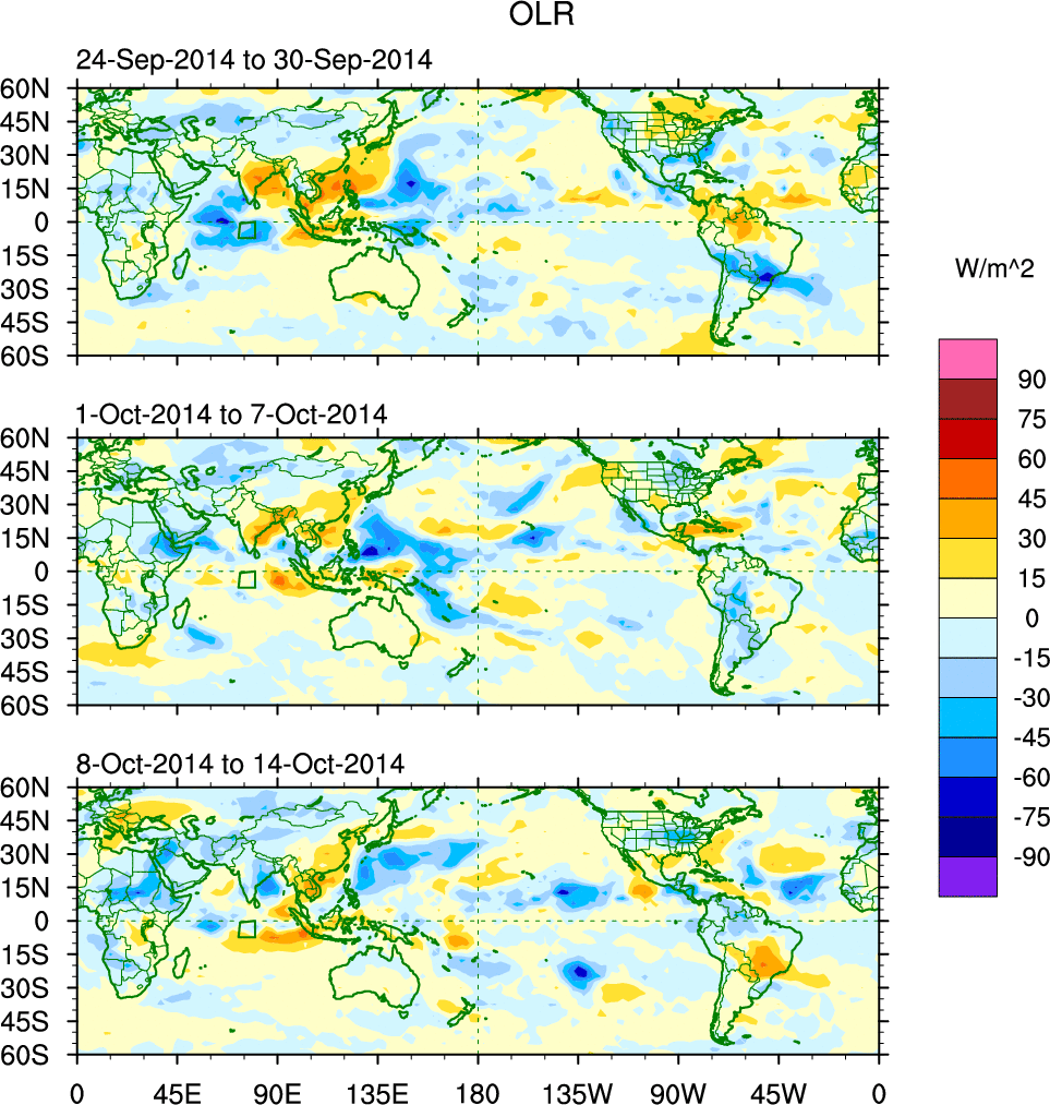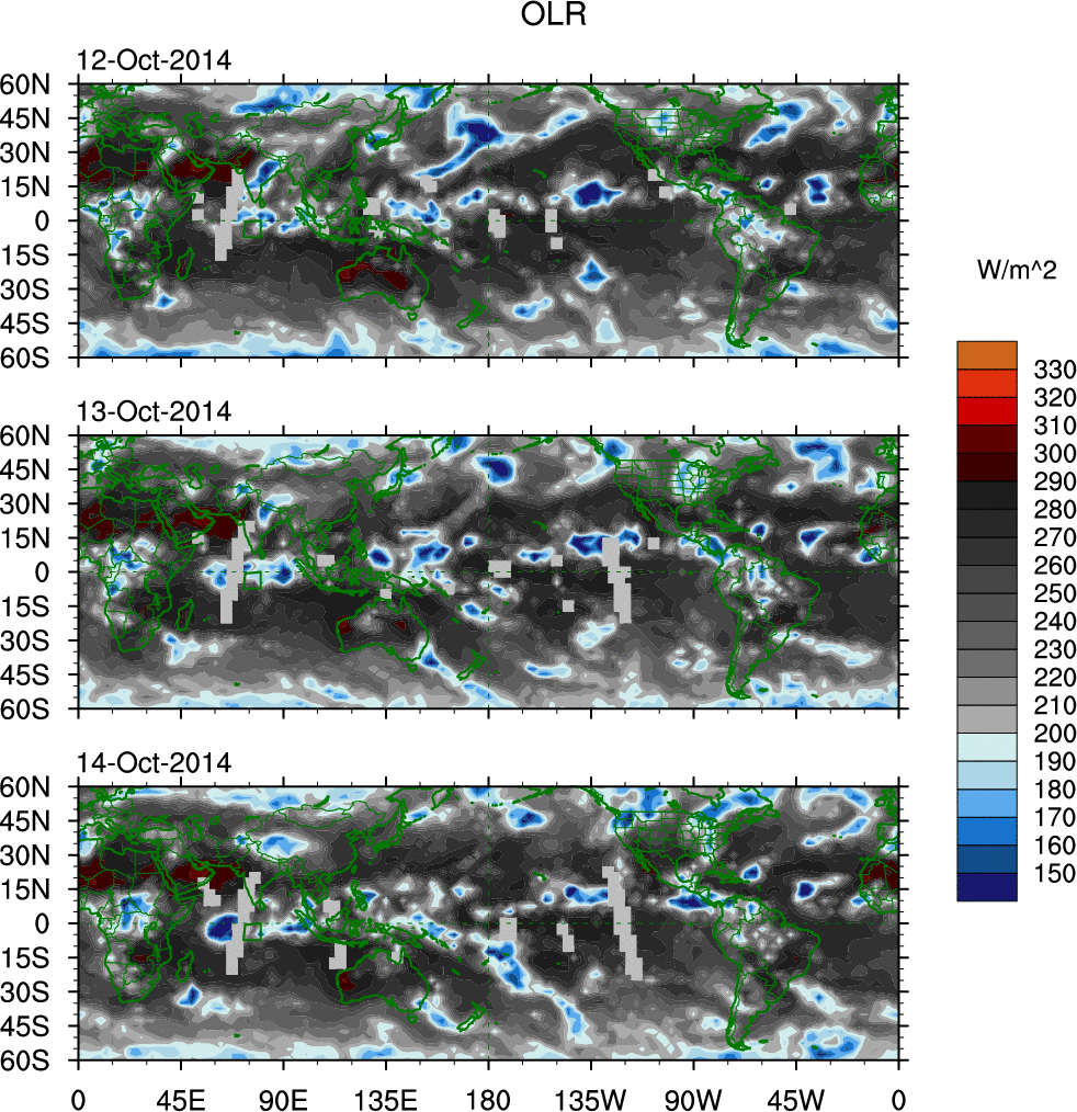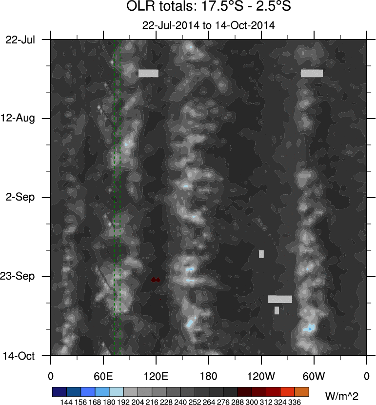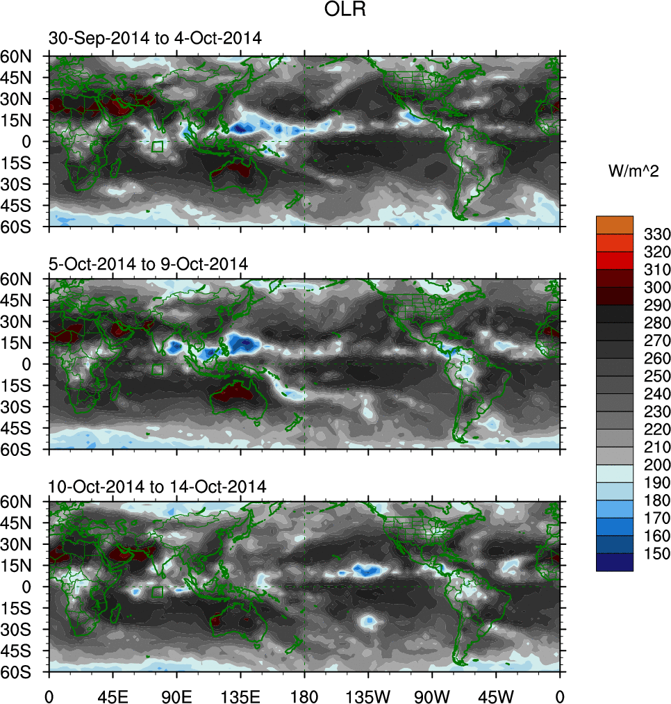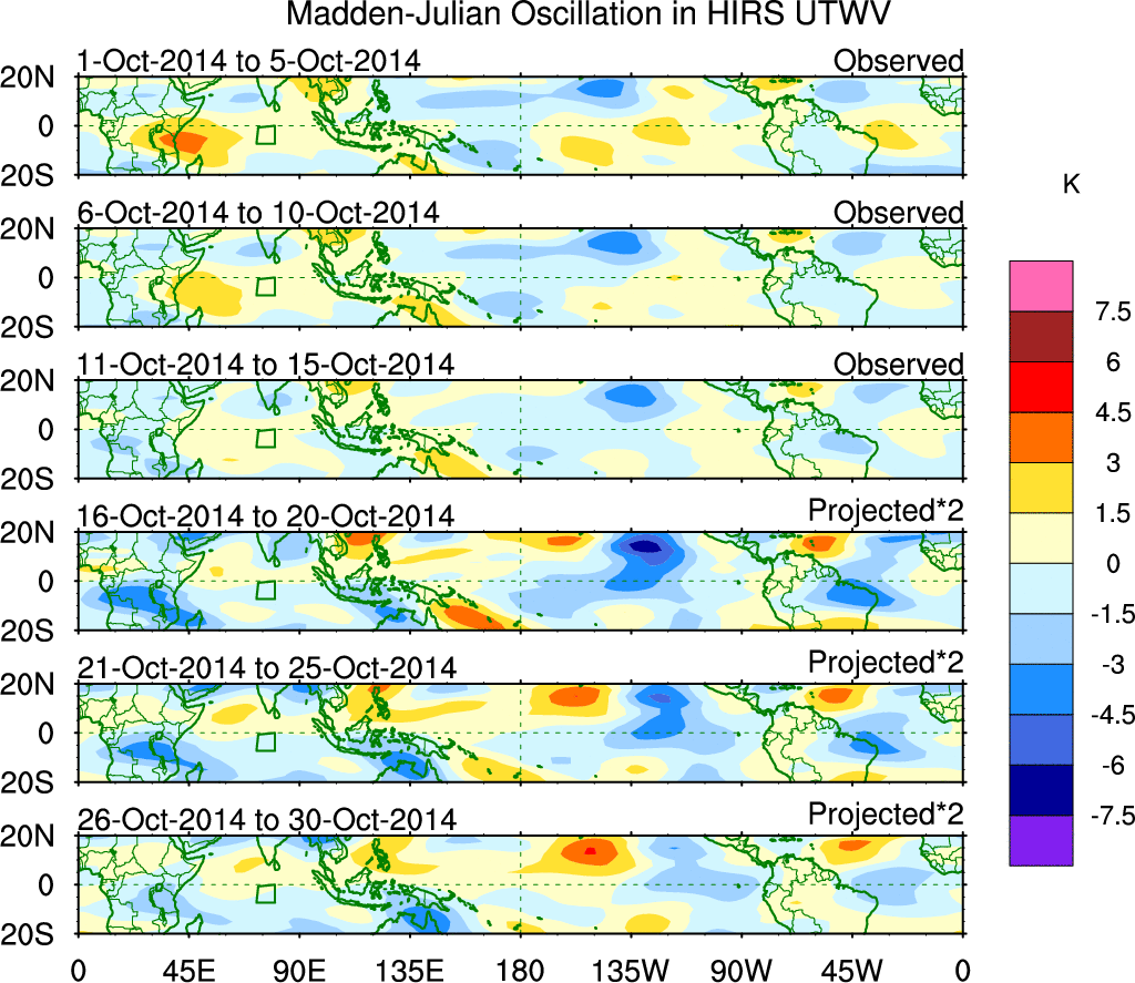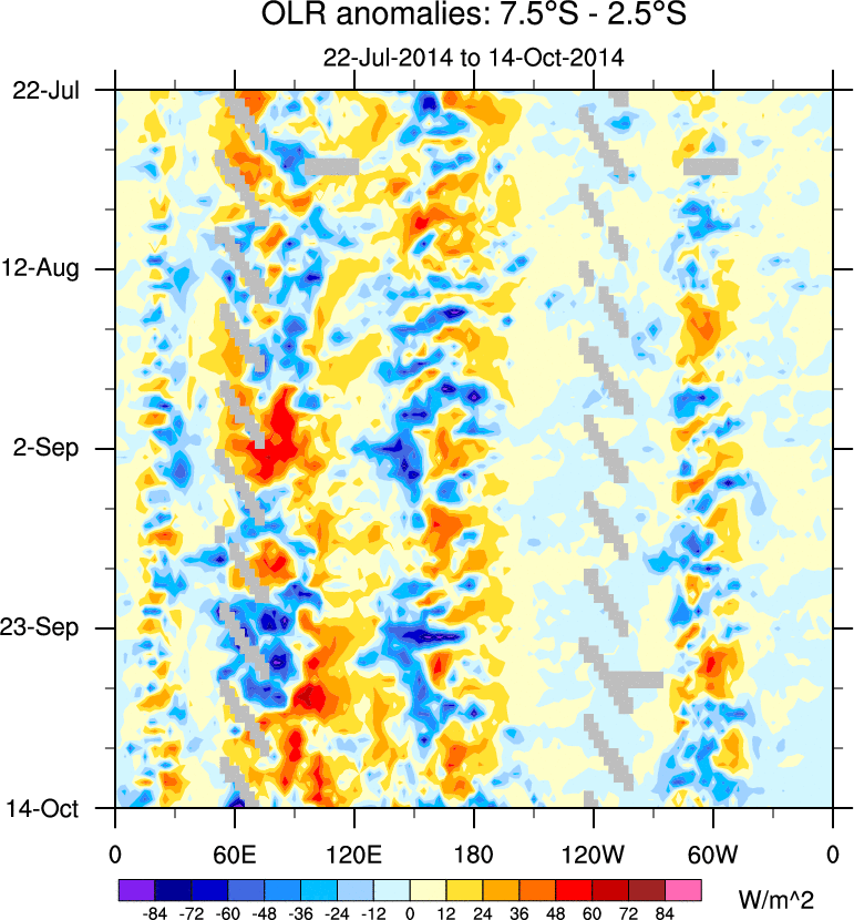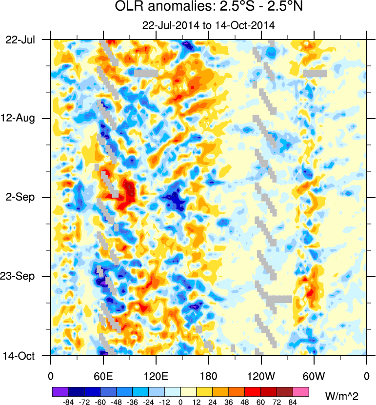To identify tropical waves in near real-time, the OLR and UTWV data are filtered following Wheeler & Weickmann (2001 MWR). The daily anomalies are calculated using the first 3 harmonics of the seasonal cycle for 1979–2009. Missing values are then filled using linear interpolation in space and time. The most recent 365 days of anomalies are padded with 659 days of zeroes, and the result is filtered for each wave type.