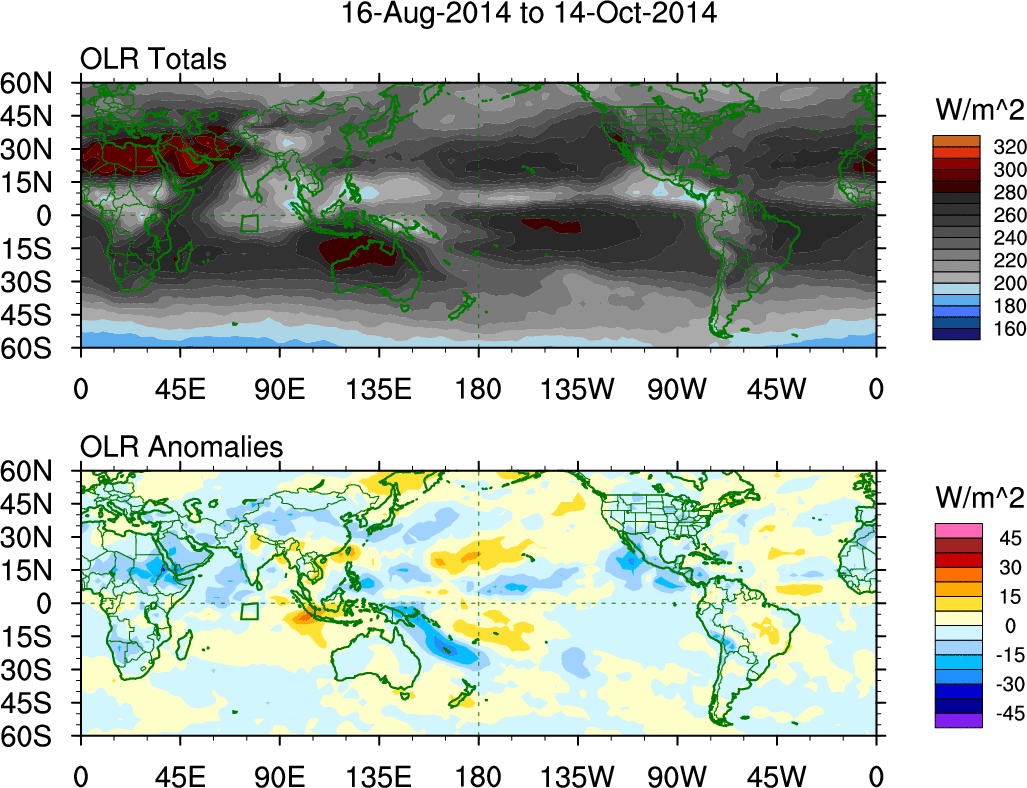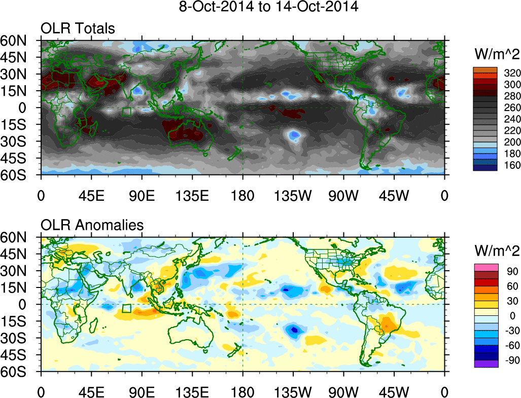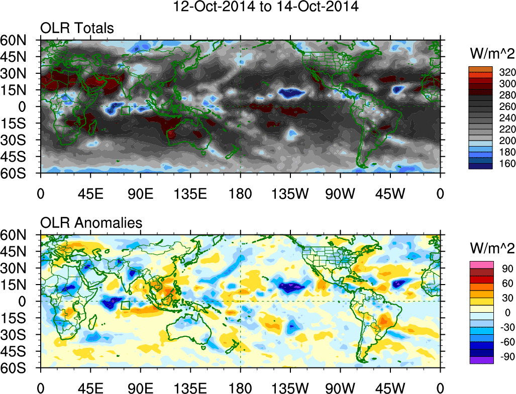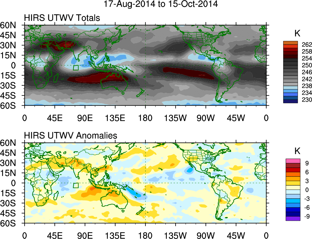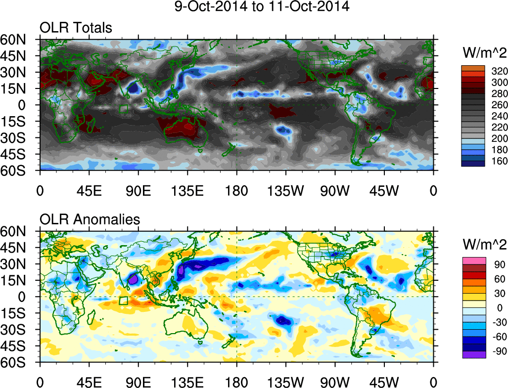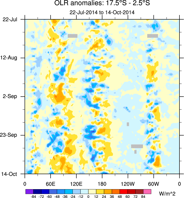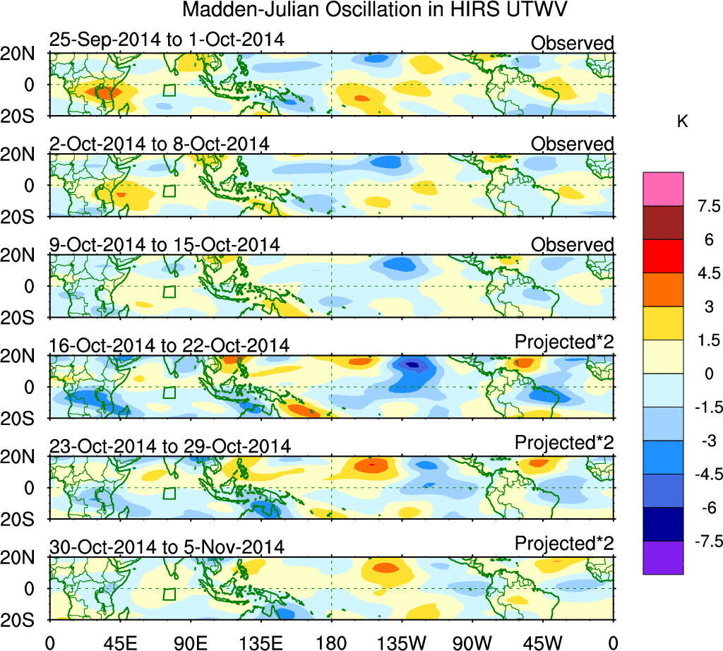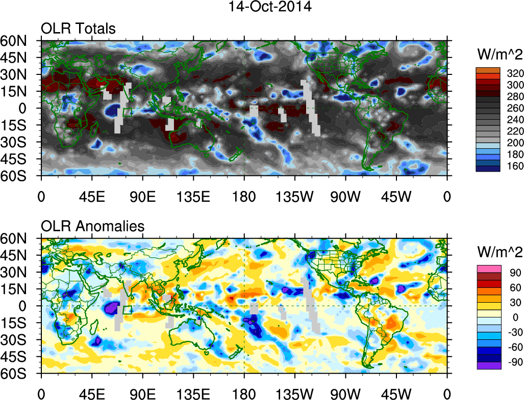 To identify tropical waves in near real-time, the OLR and UTWV data are filtered following Wheeler & Weickmann (2001 MWR). The daily anomalies are calculated using the first 3 harmonics of the seasonal cycle for 1979–2009. Missing values are then filled using linear interpolation in space and time. The most recent 365 days of anomalies are padded with 659 days of zeroes, and the result is filtered for each wave type.