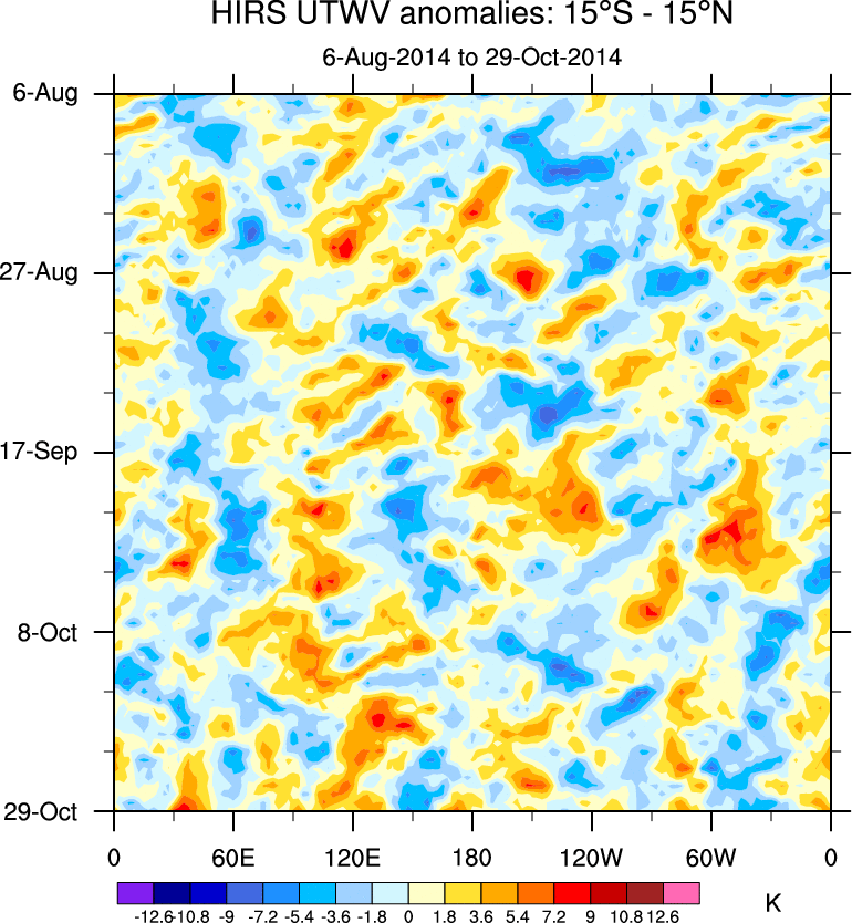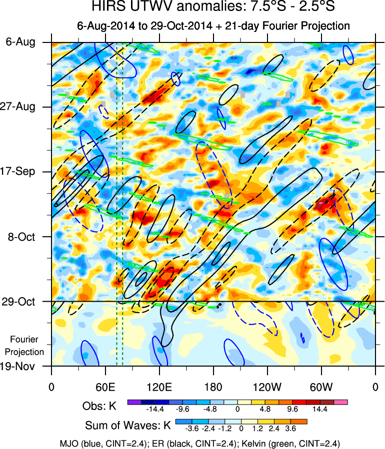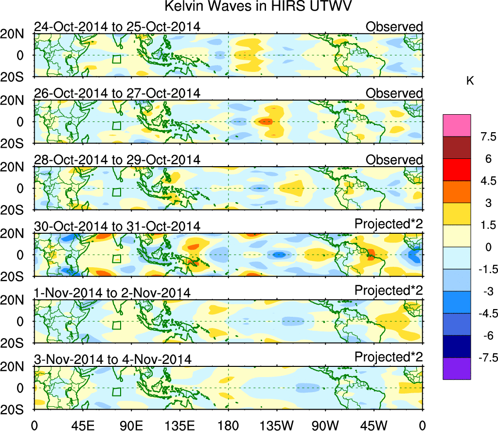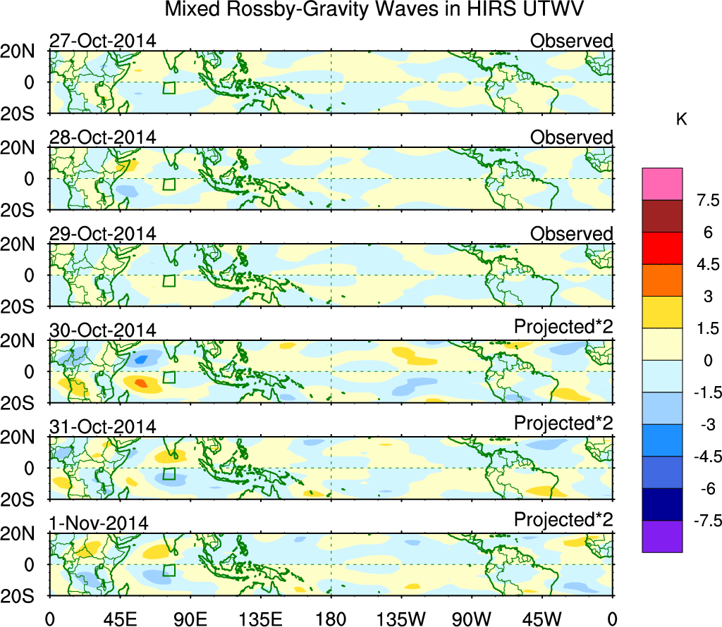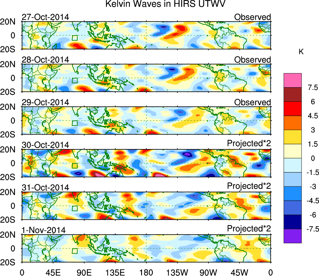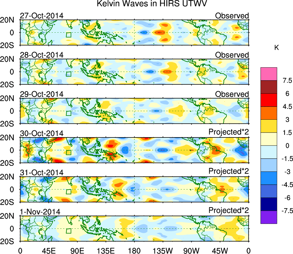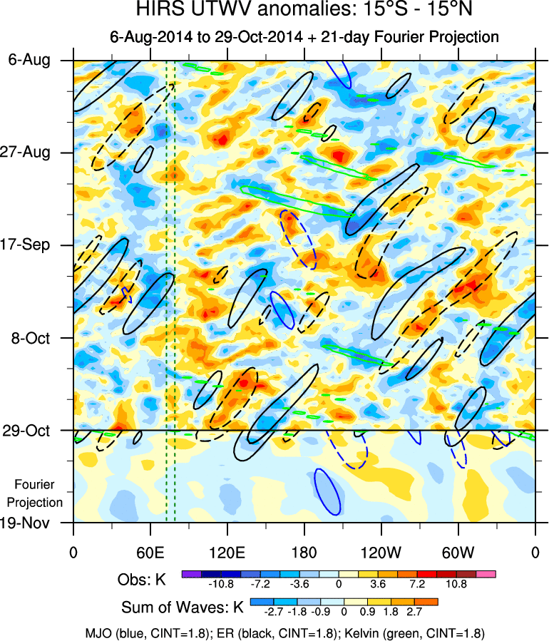 To identify tropical waves in near real-time, the OLR and UTWV data are filtered following Wheeler & Weickmann (2001 MWR). The daily anomalies are calculated using the first 3 harmonics of the seasonal cycle for 1979–2009. Missing values are then filled using linear interpolation in space and time. The most recent 365 days of anomalies are padded with 659 days of zeroes, and the result is filtered for each wave type.