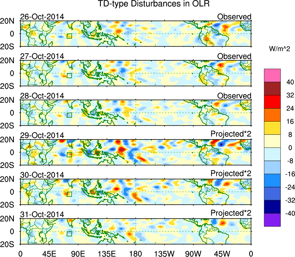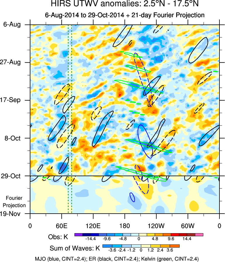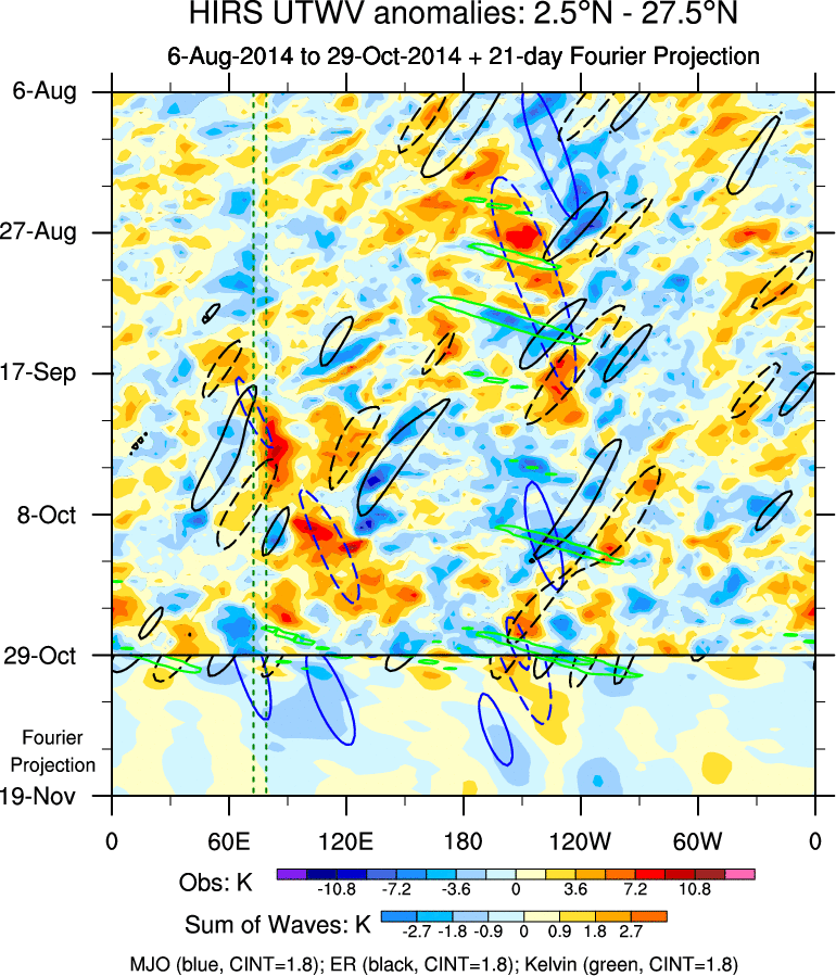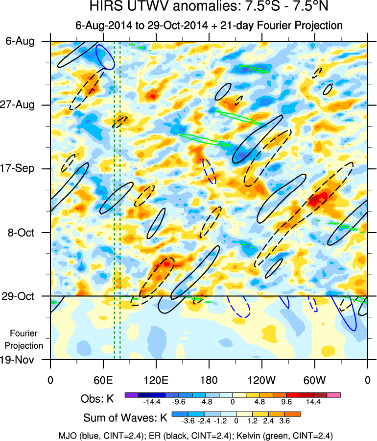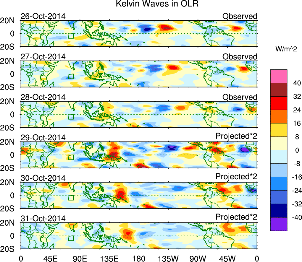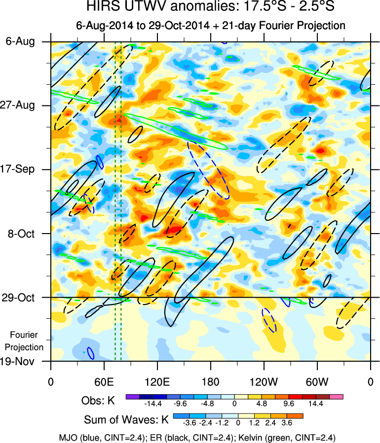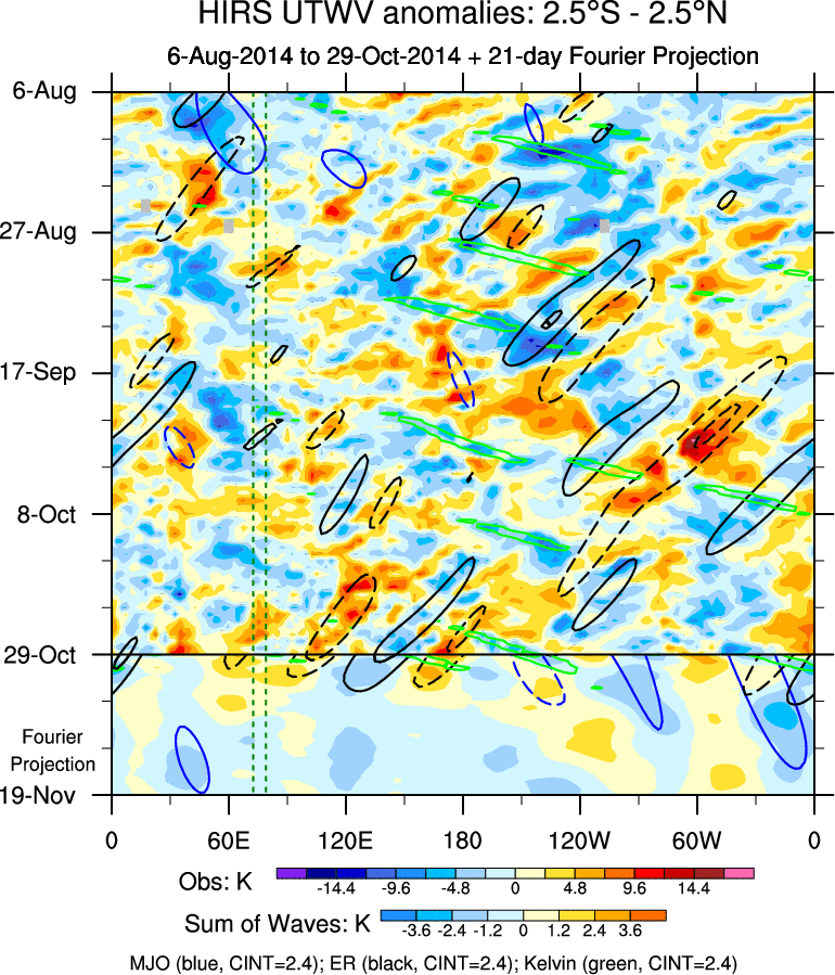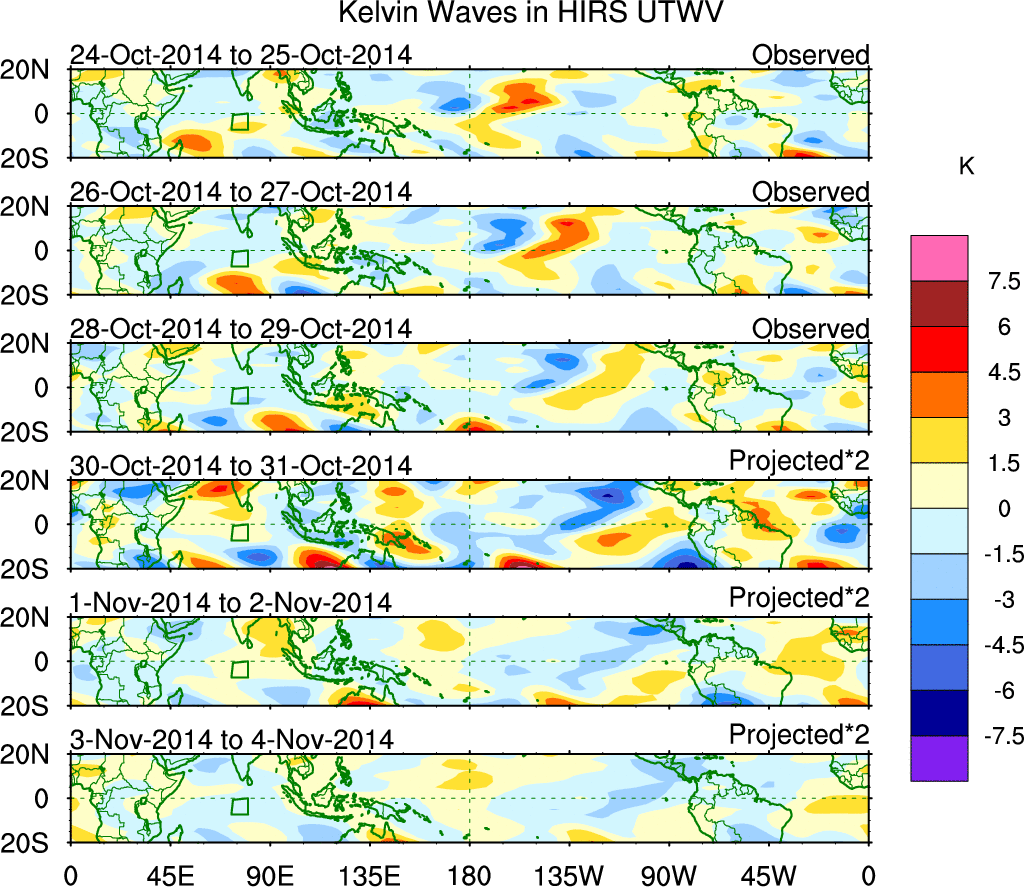 To identify tropical waves in near real-time, the OLR and UTWV data are filtered following Wheeler & Weickmann (2001 MWR). The daily anomalies are calculated using the first 3 harmonics of the seasonal cycle for 1979–2009. Missing values are then filled using linear interpolation in space and time. The most recent 365 days of anomalies are padded with 659 days of zeroes, and the result is filtered for each wave type.