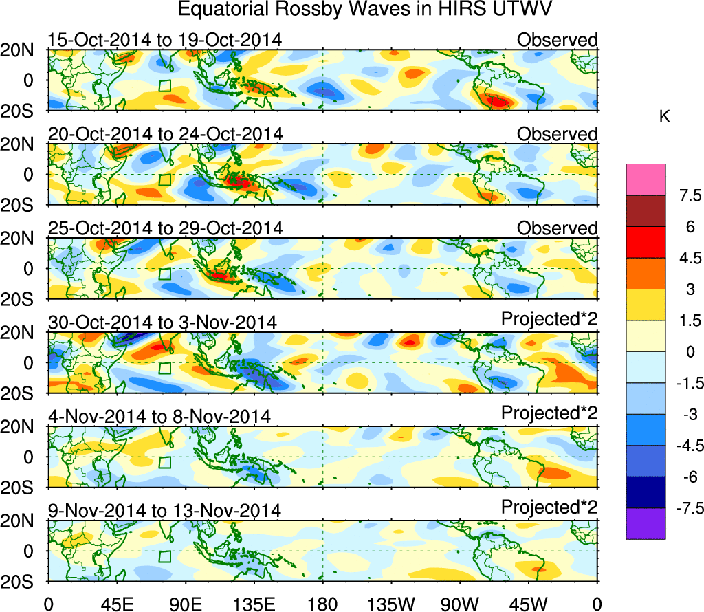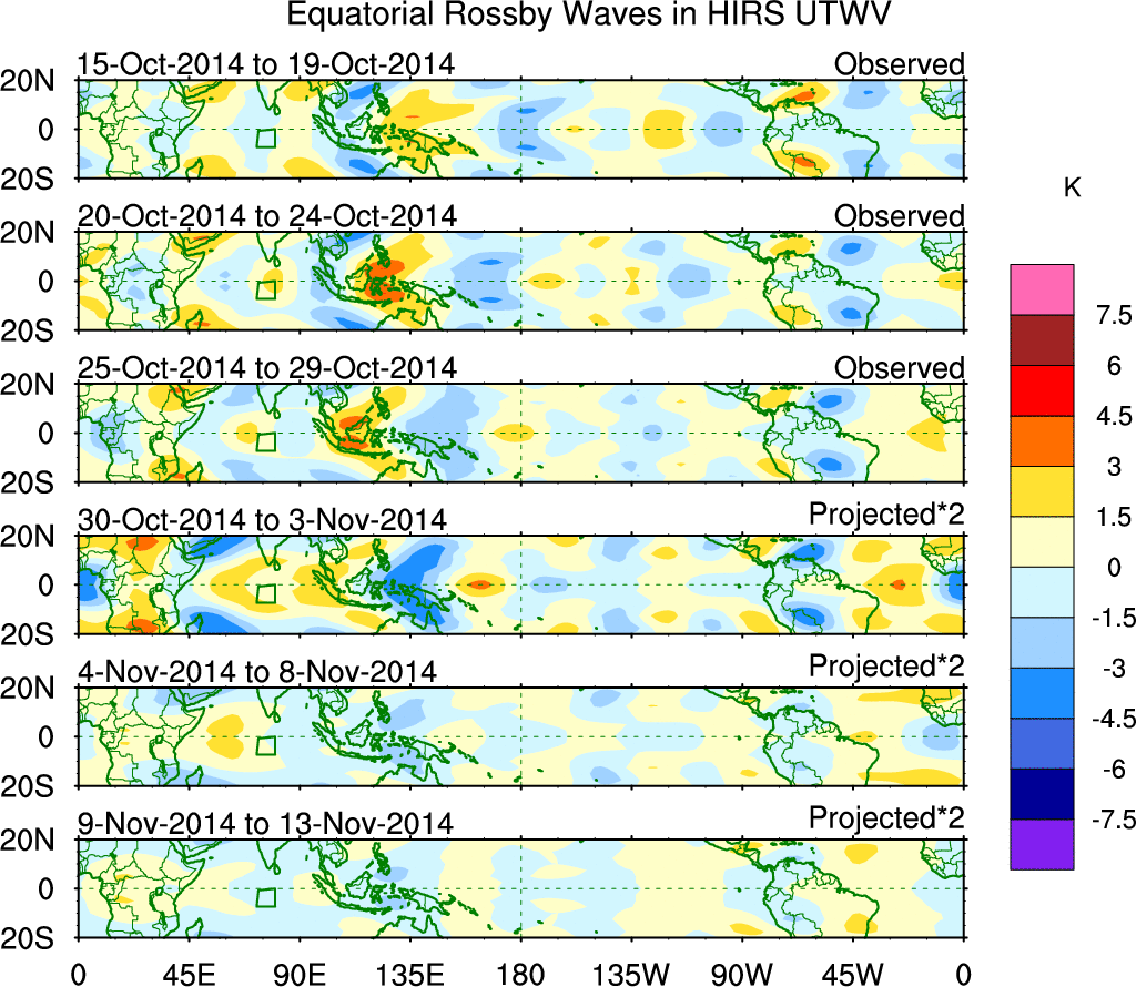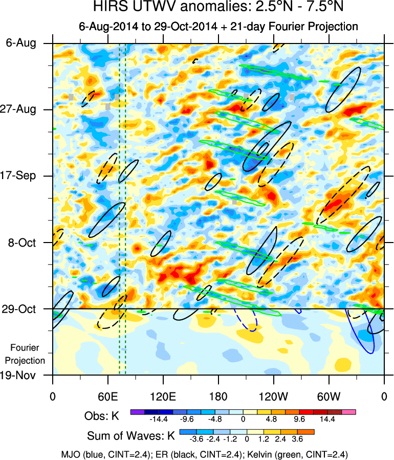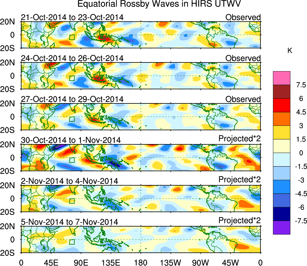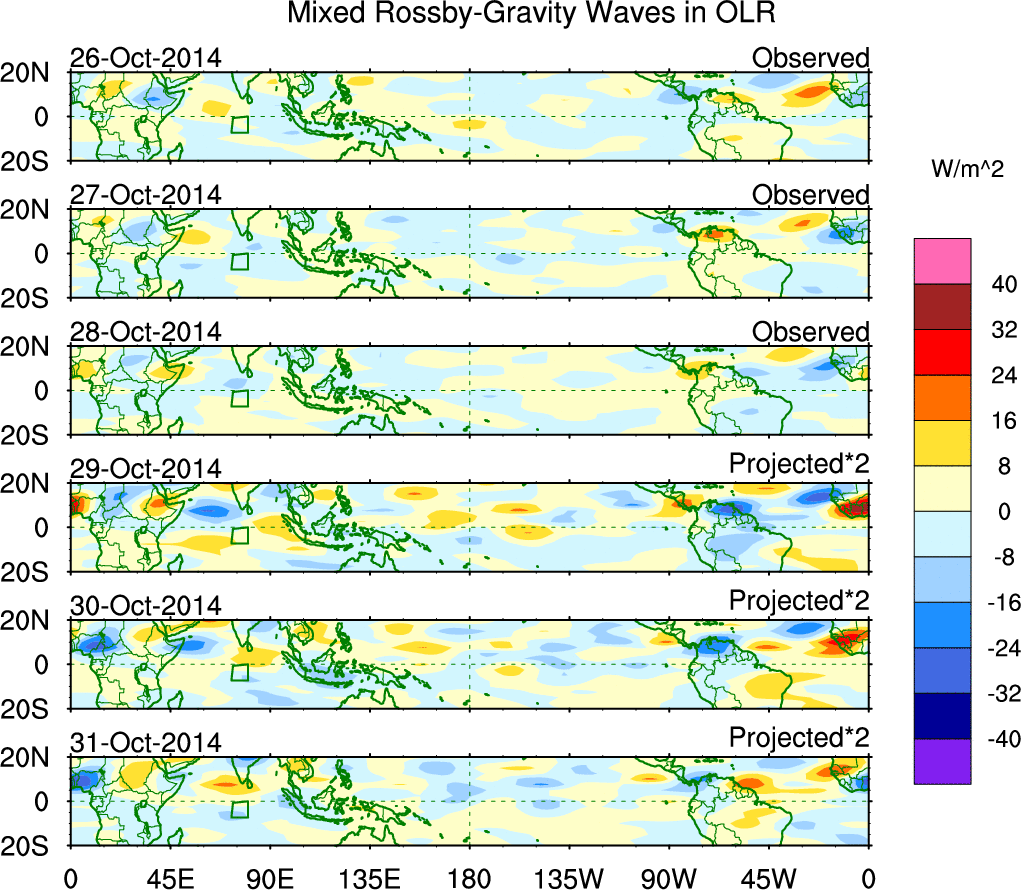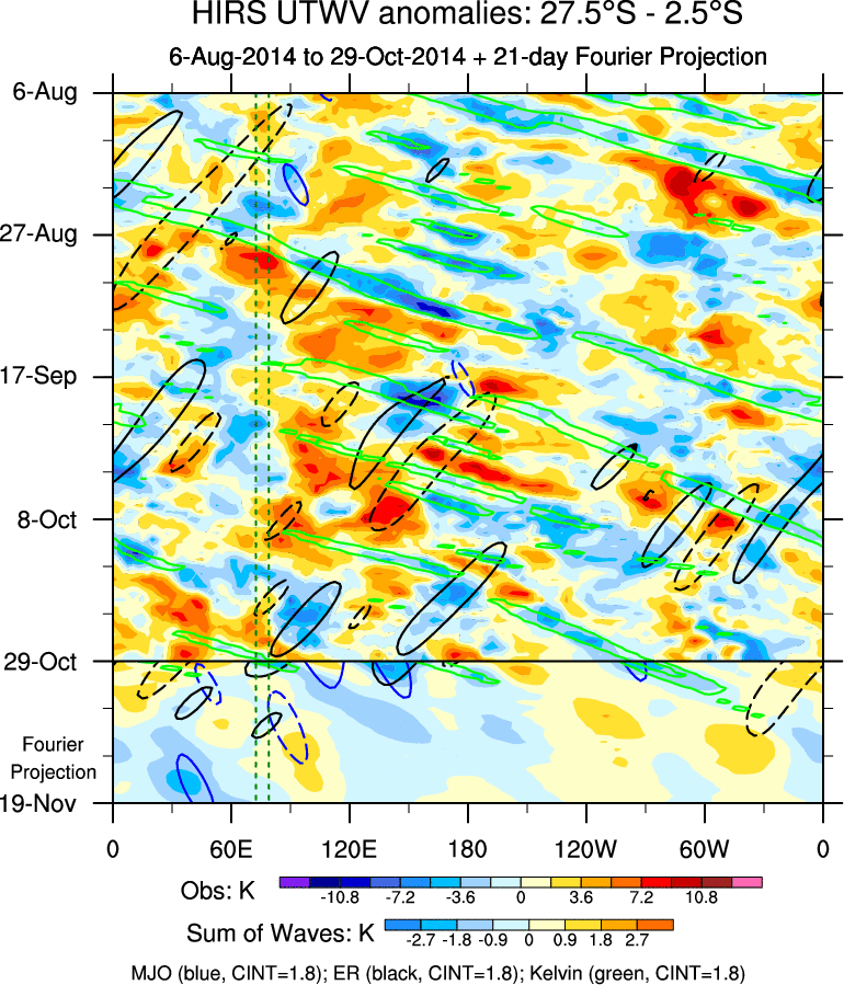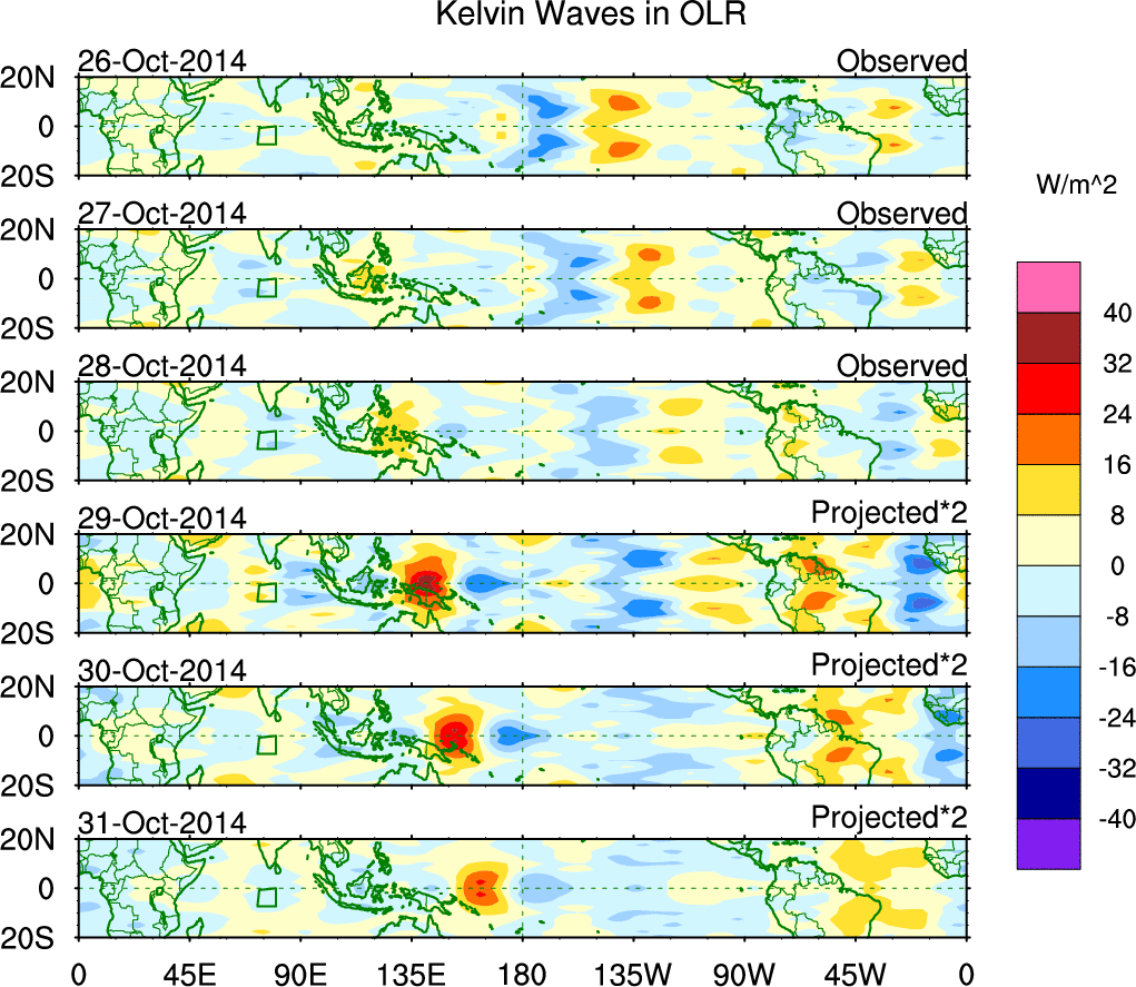 To identify tropical waves in near real-time, the OLR and UTWV data are filtered following Wheeler & Weickmann (2001 MWR). The daily anomalies are calculated using the first 3 harmonics of the seasonal cycle for 1979–2009. Missing values are then filled using linear interpolation in space and time. The most recent 365 days of anomalies are padded with 659 days of zeroes, and the result is filtered for each wave type.
