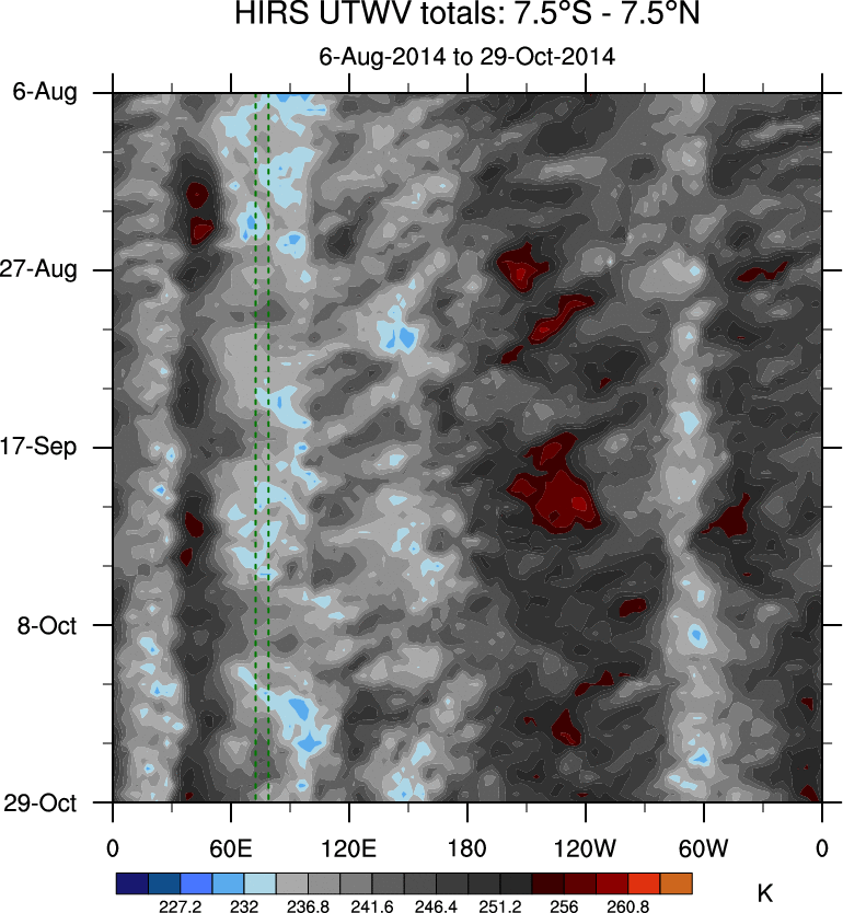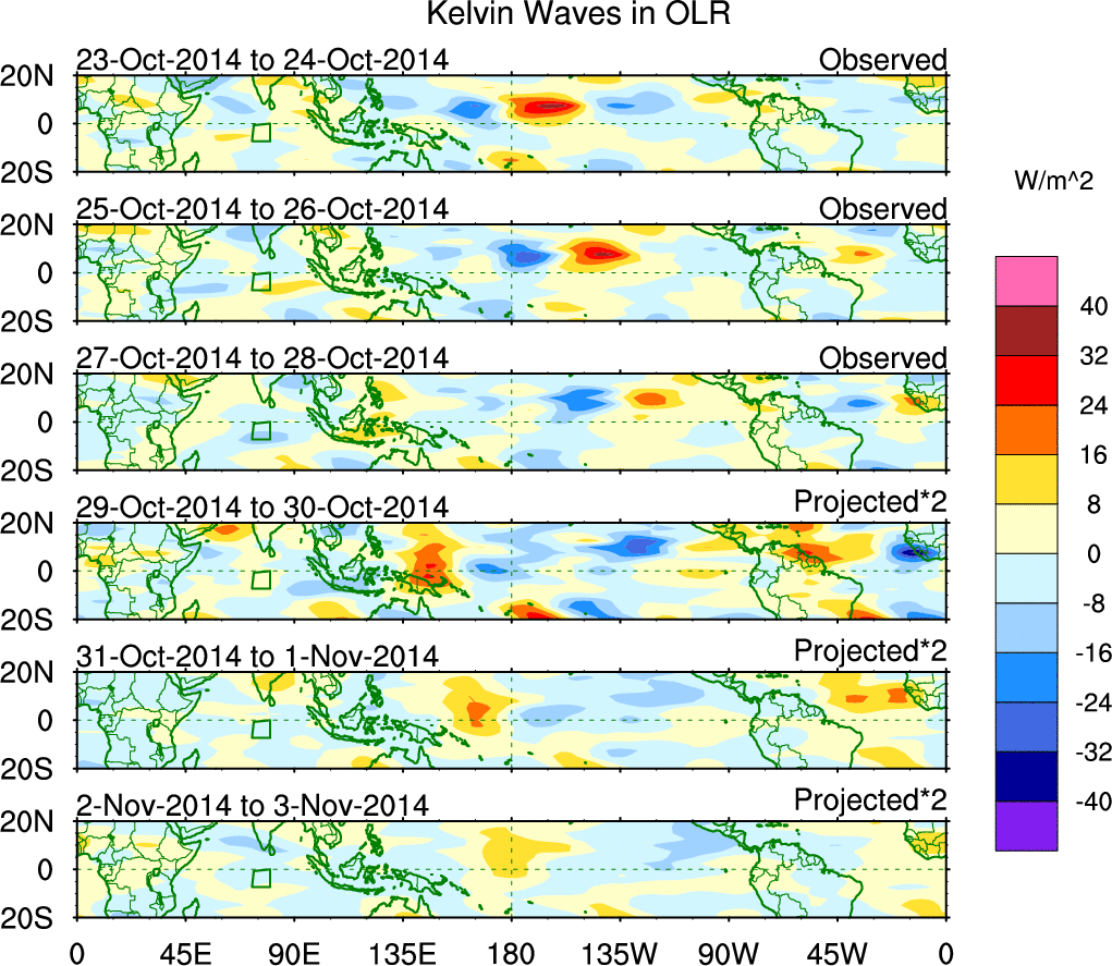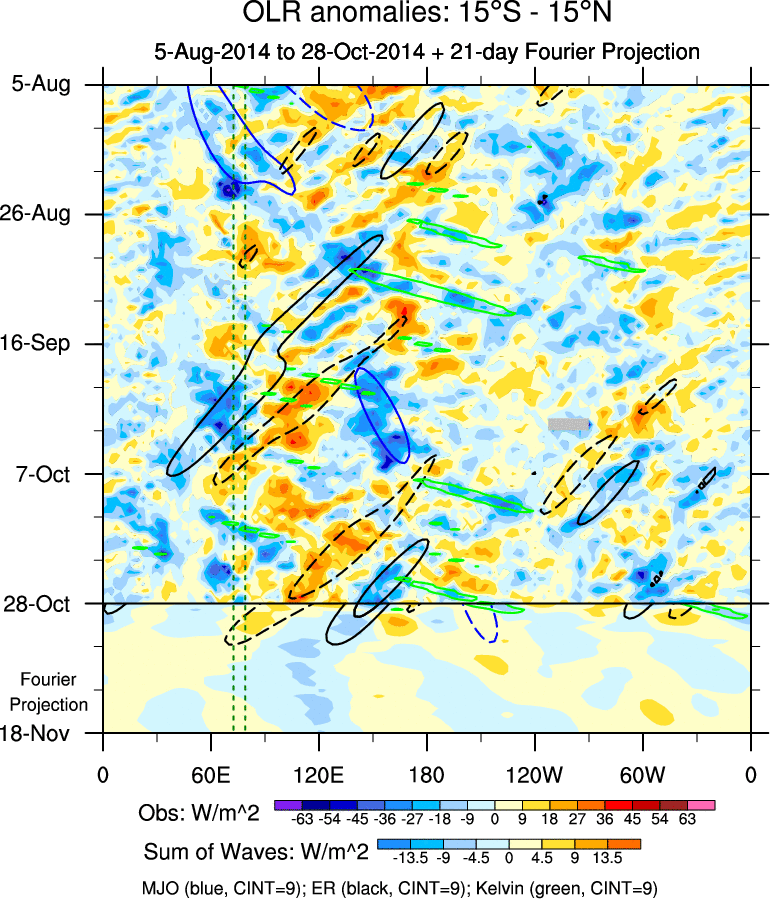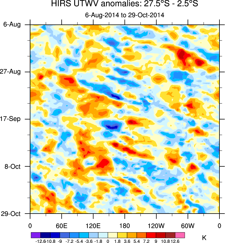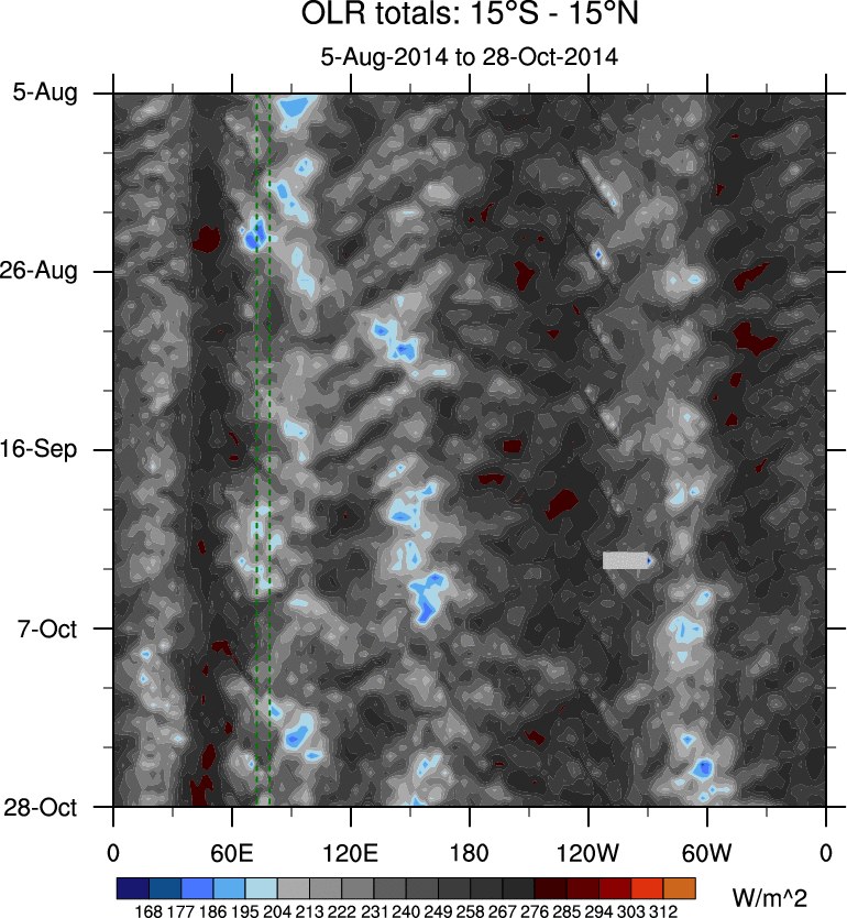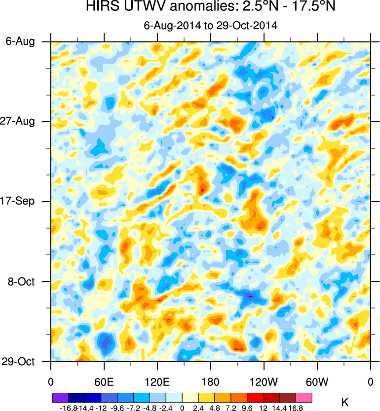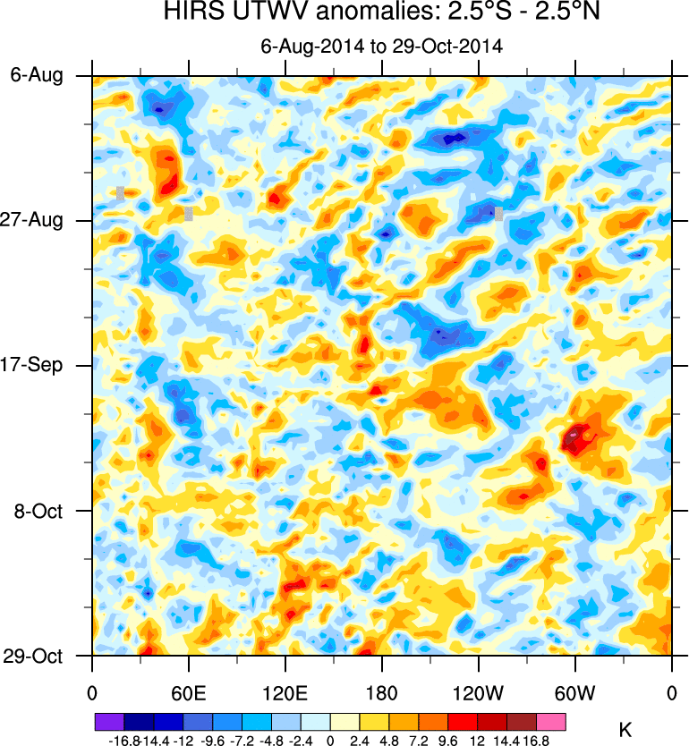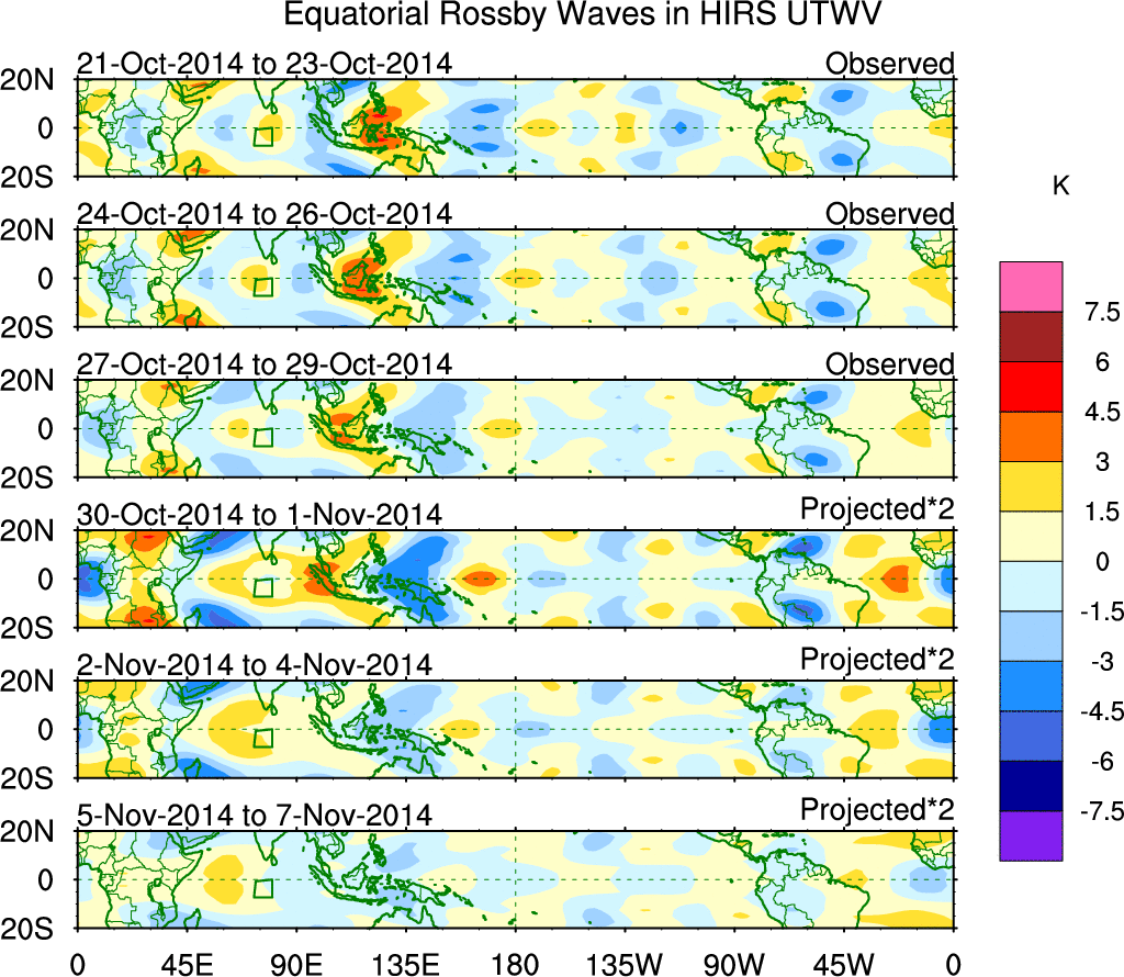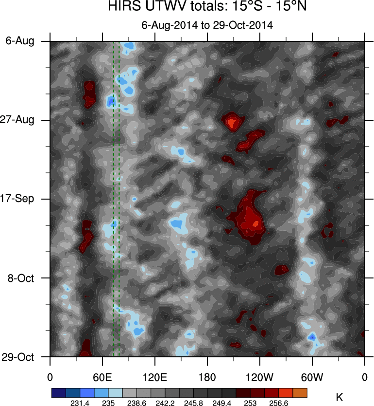 To identify tropical waves in near real-time, the OLR and UTWV data are filtered following Wheeler & Weickmann (2001 MWR). The daily anomalies are calculated using the first 3 harmonics of the seasonal cycle for 1979–2009. Missing values are then filled using linear interpolation in space and time. The most recent 365 days of anomalies are padded with 659 days of zeroes, and the result is filtered for each wave type.