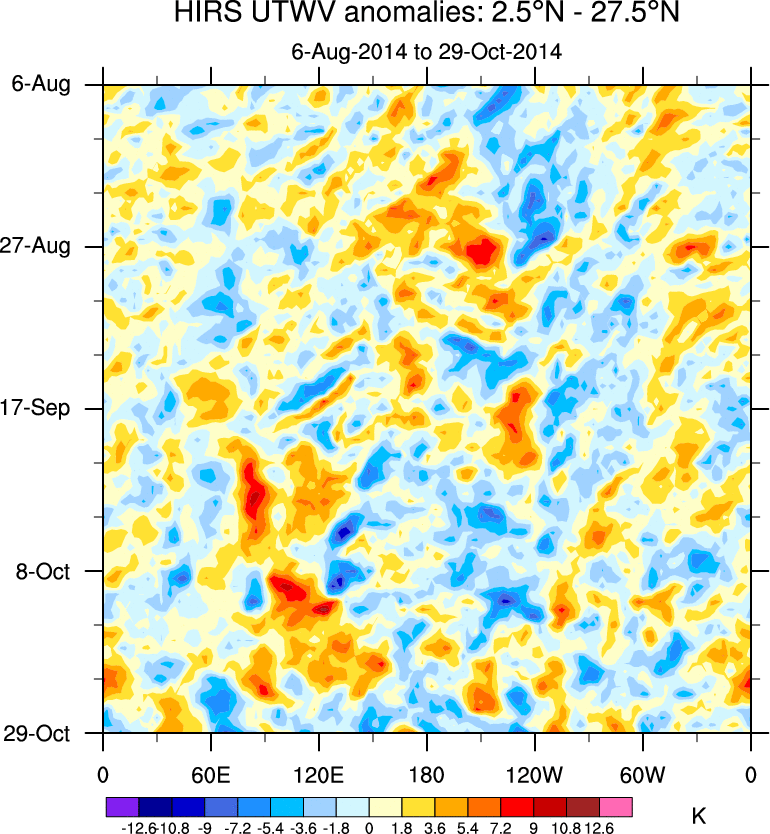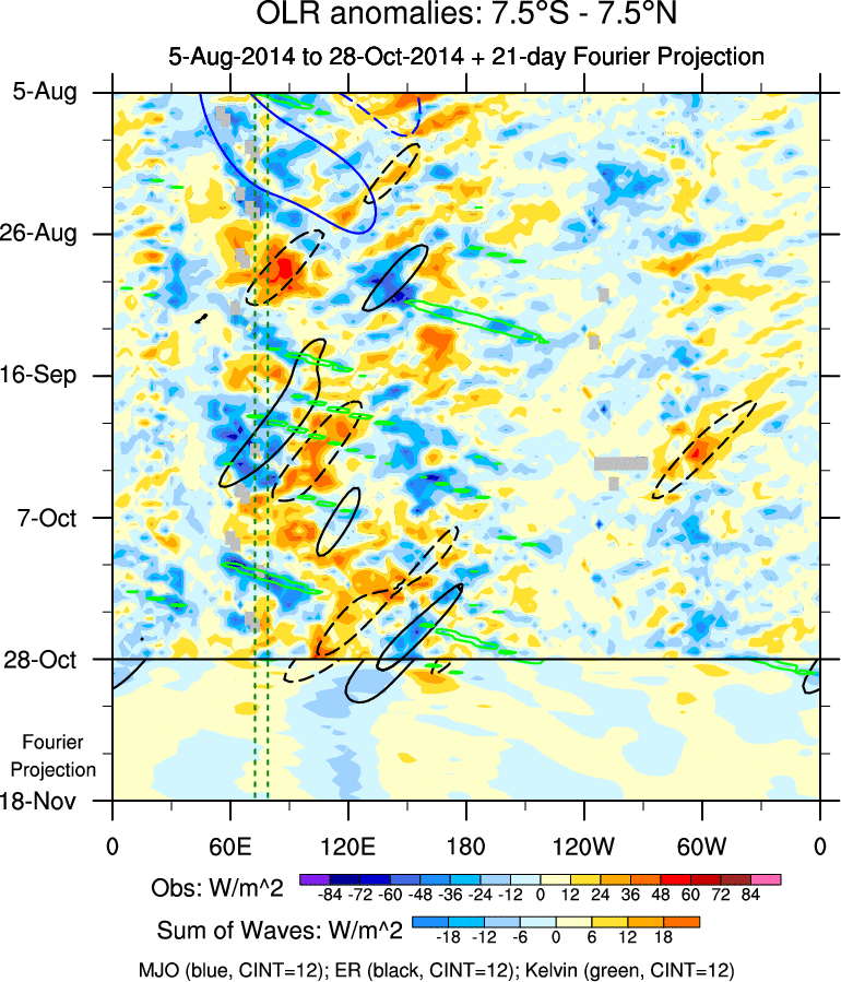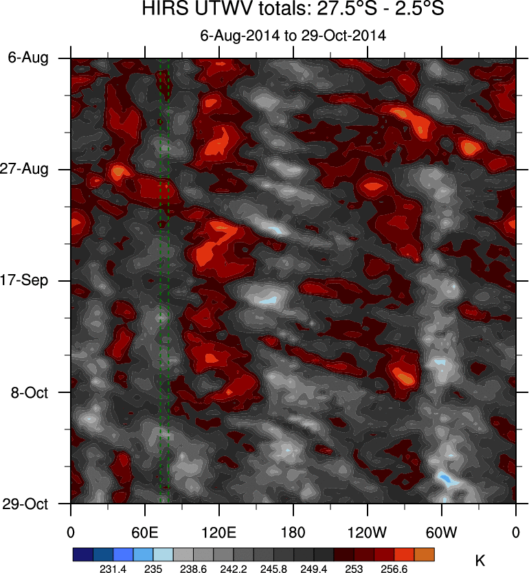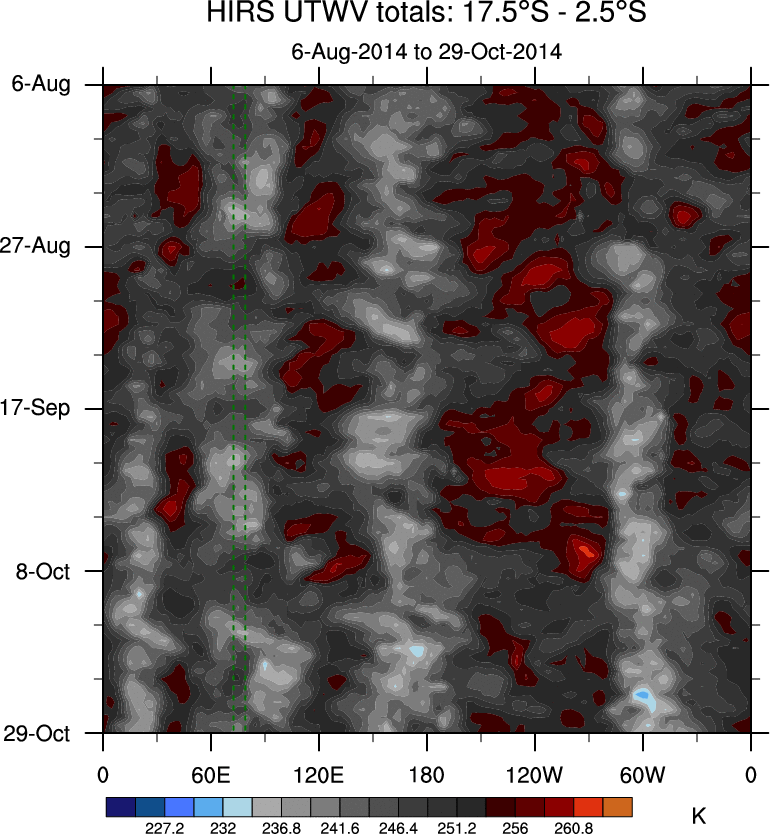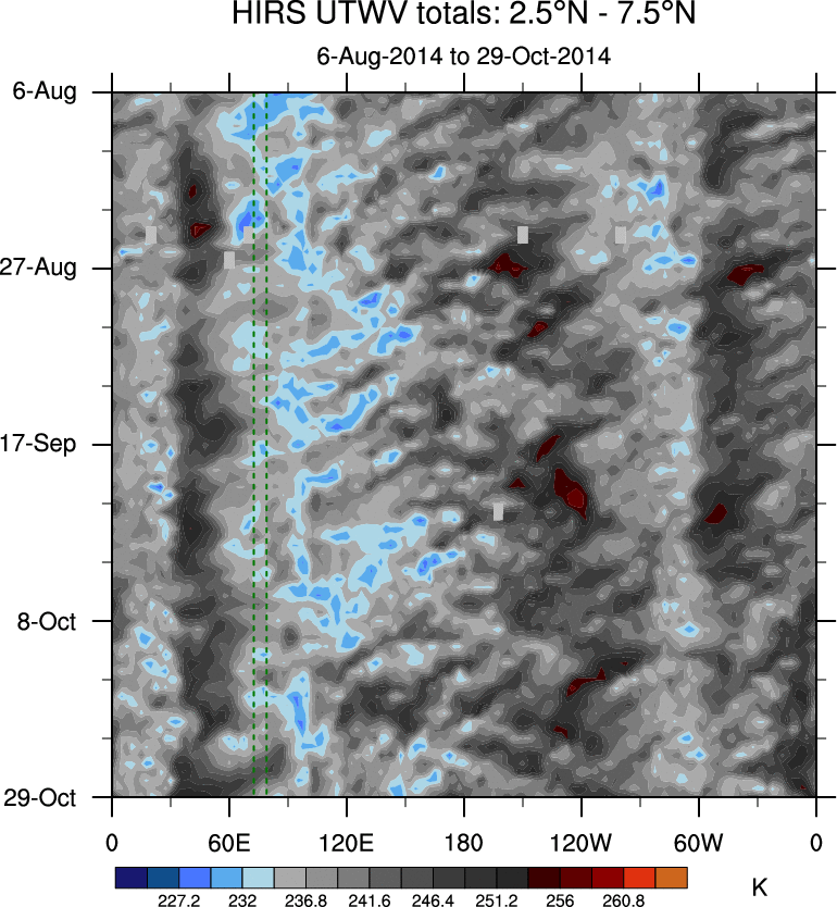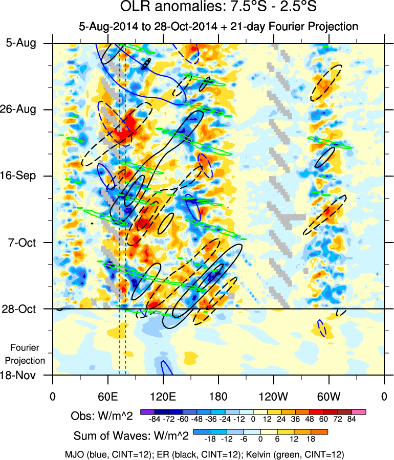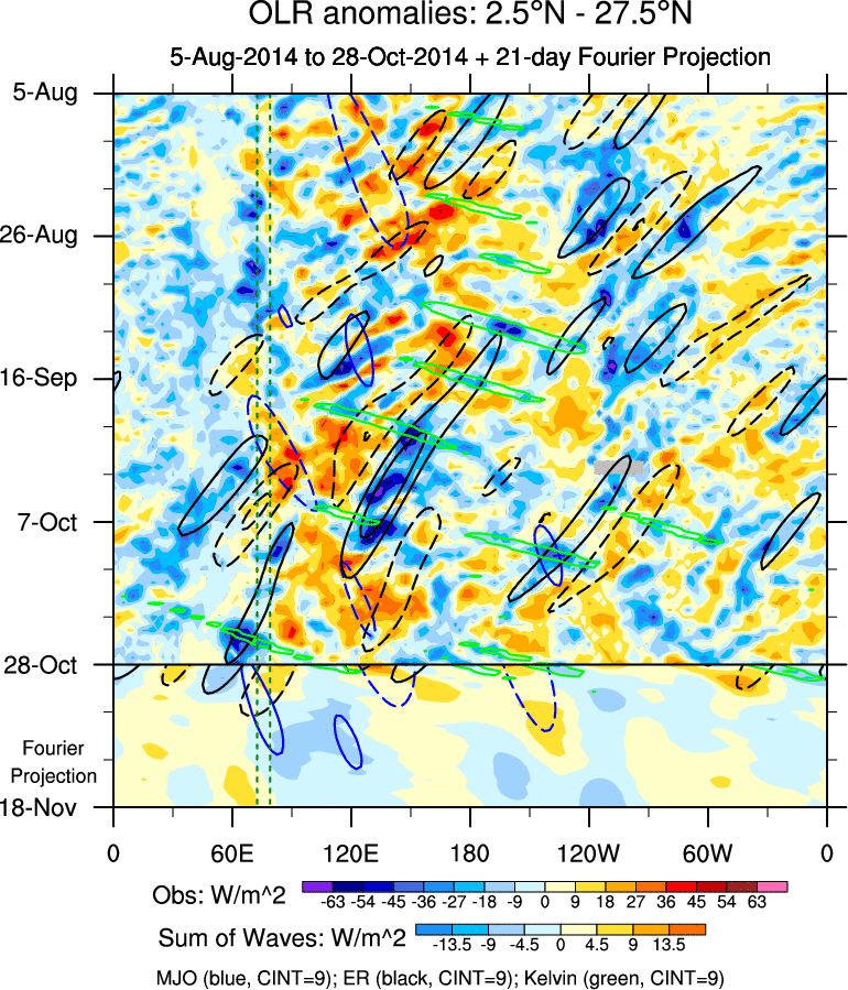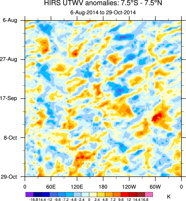 To identify tropical waves in near real-time, the OLR and UTWV data are filtered following Wheeler & Weickmann (2001 MWR). The daily anomalies are calculated using the first 3 harmonics of the seasonal cycle for 1979–2009. Missing values are then filled using linear interpolation in space and time. The most recent 365 days of anomalies are padded with 659 days of zeroes, and the result is filtered for each wave type.