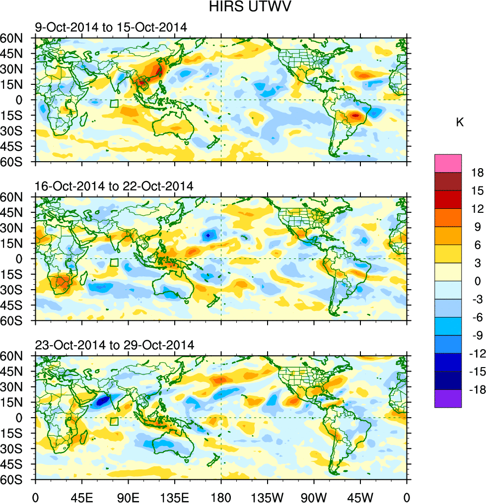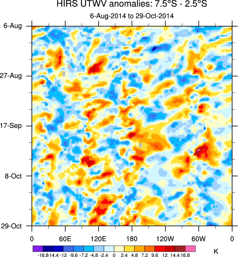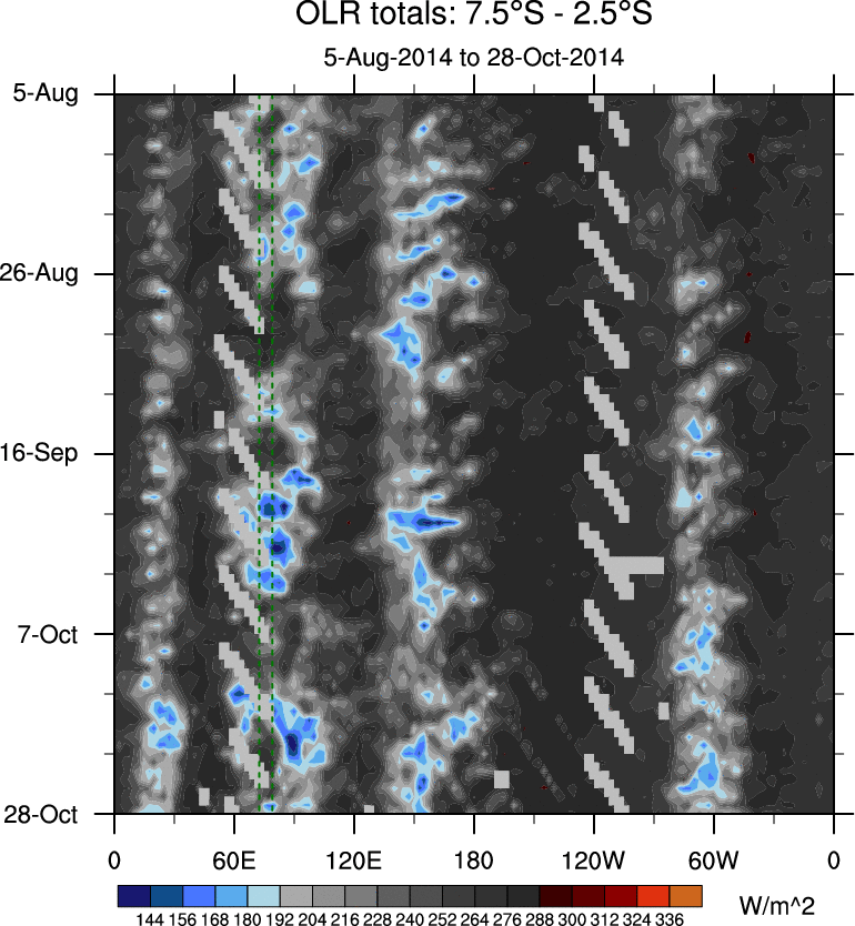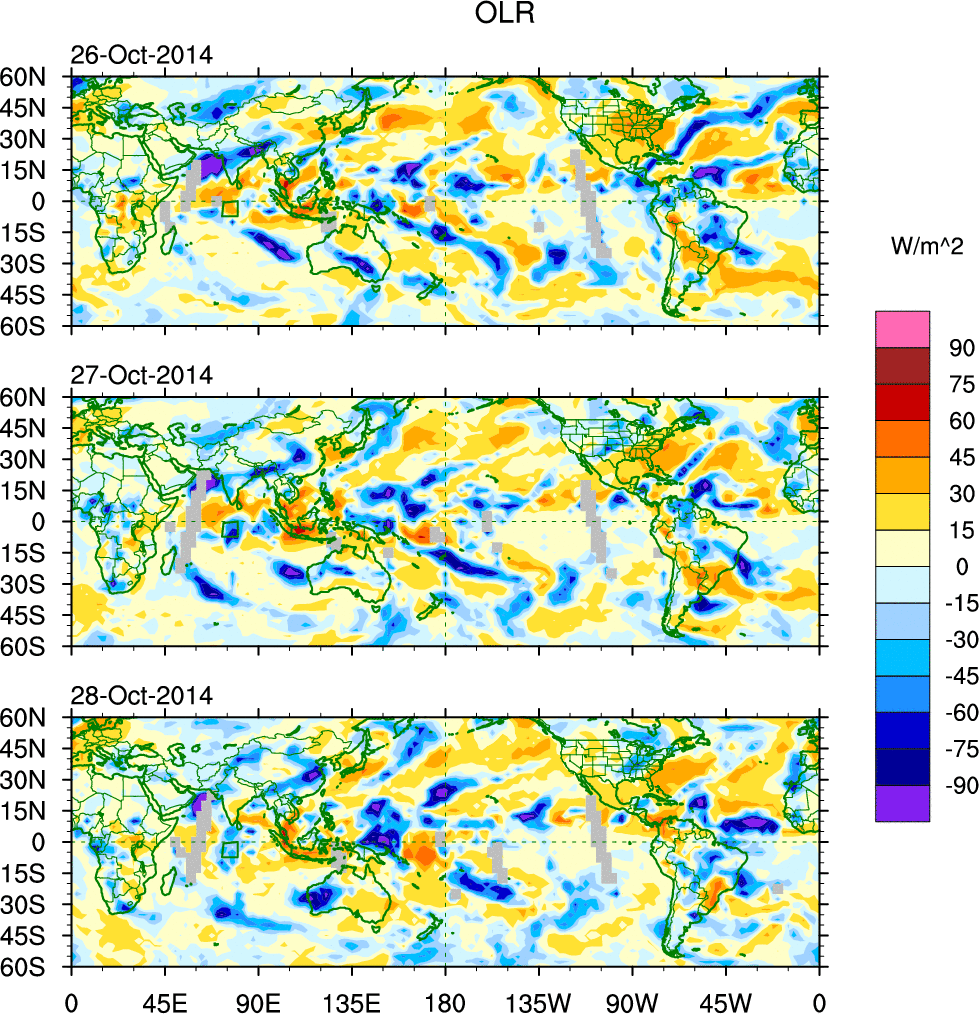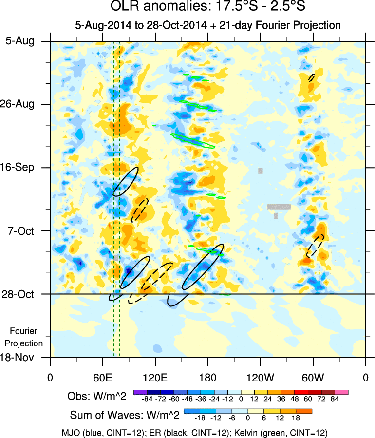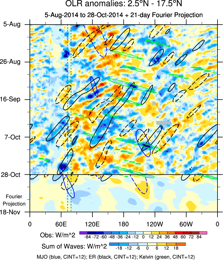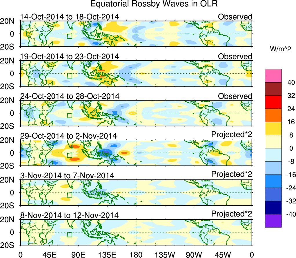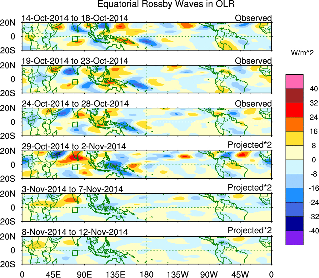 To identify tropical waves in near real-time, the OLR and UTWV data are filtered following Wheeler & Weickmann (2001 MWR). The daily anomalies are calculated using the first 3 harmonics of the seasonal cycle for 1979–2009. Missing values are then filled using linear interpolation in space and time. The most recent 365 days of anomalies are padded with 659 days of zeroes, and the result is filtered for each wave type.