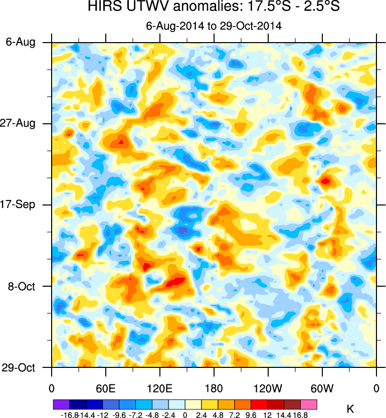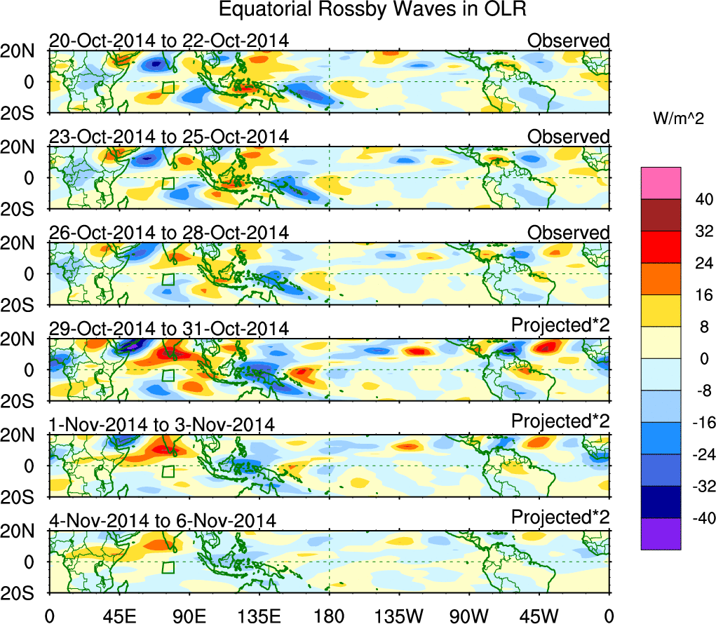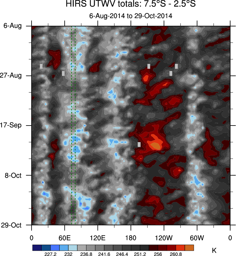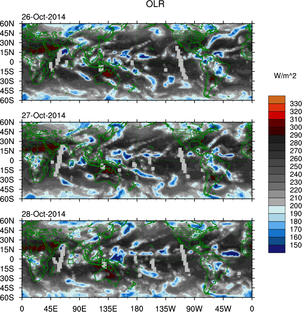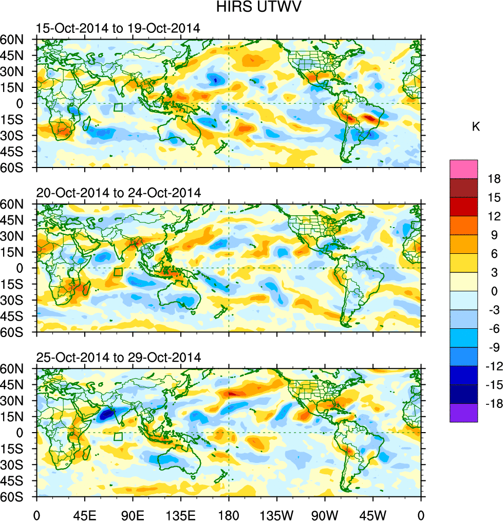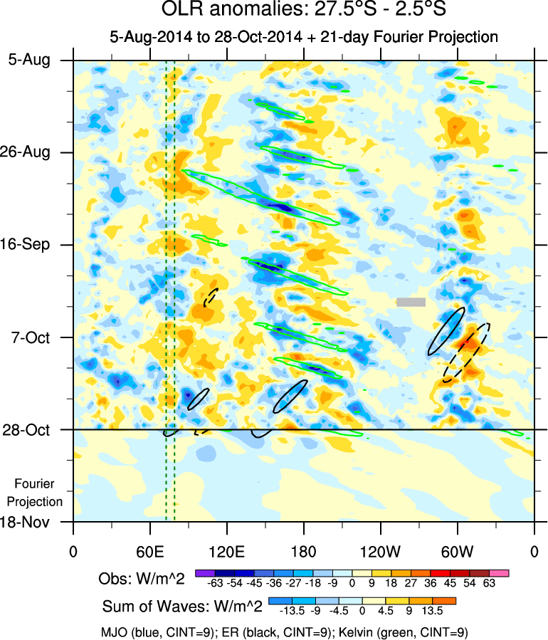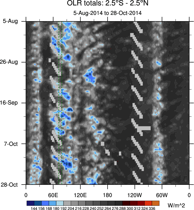 To identify tropical waves in near real-time, the OLR and UTWV data are filtered following Wheeler & Weickmann (2001 MWR). The daily anomalies are calculated using the first 3 harmonics of the seasonal cycle for 1979–2009. Missing values are then filled using linear interpolation in space and time. The most recent 365 days of anomalies are padded with 659 days of zeroes, and the result is filtered for each wave type.