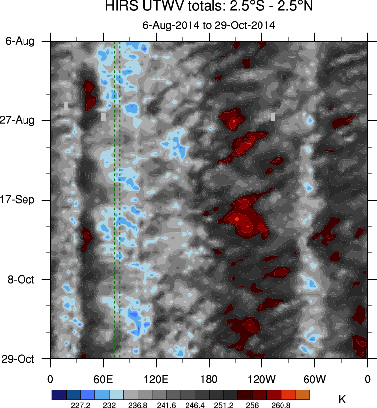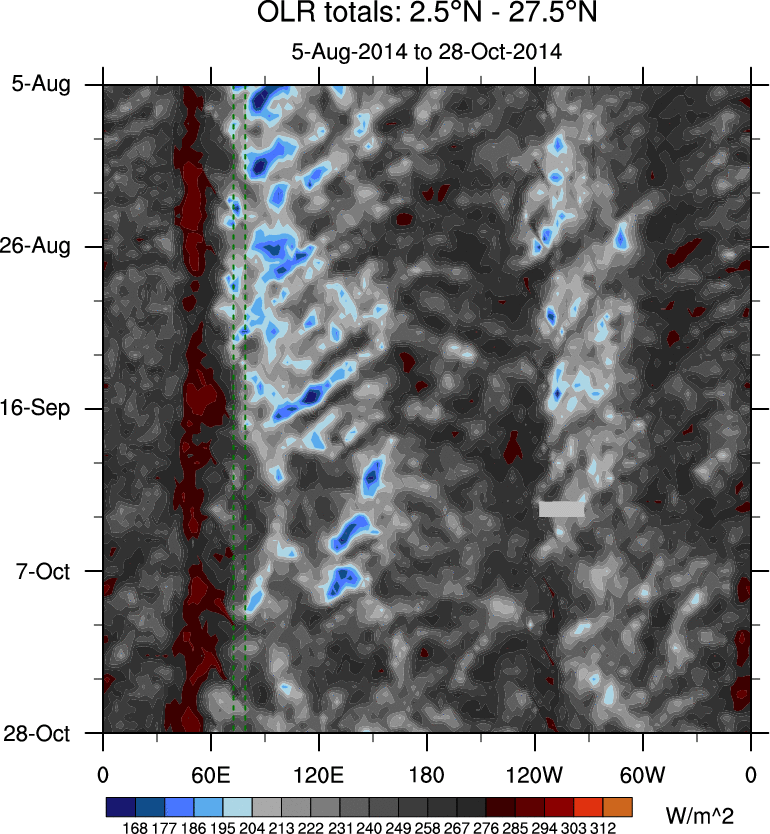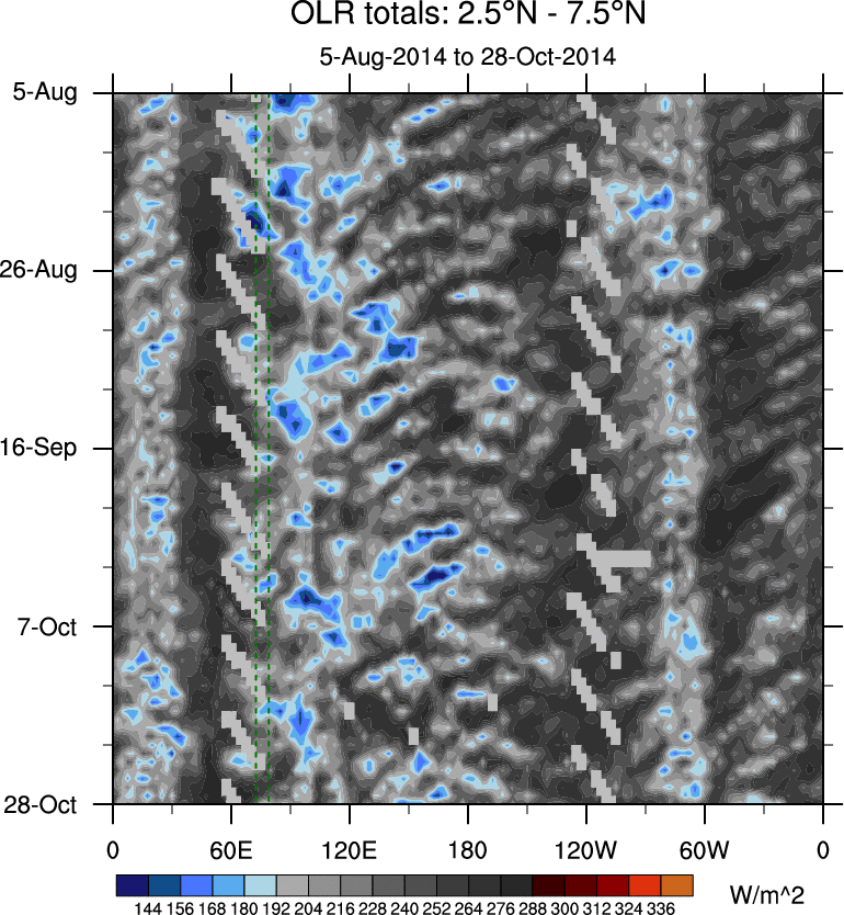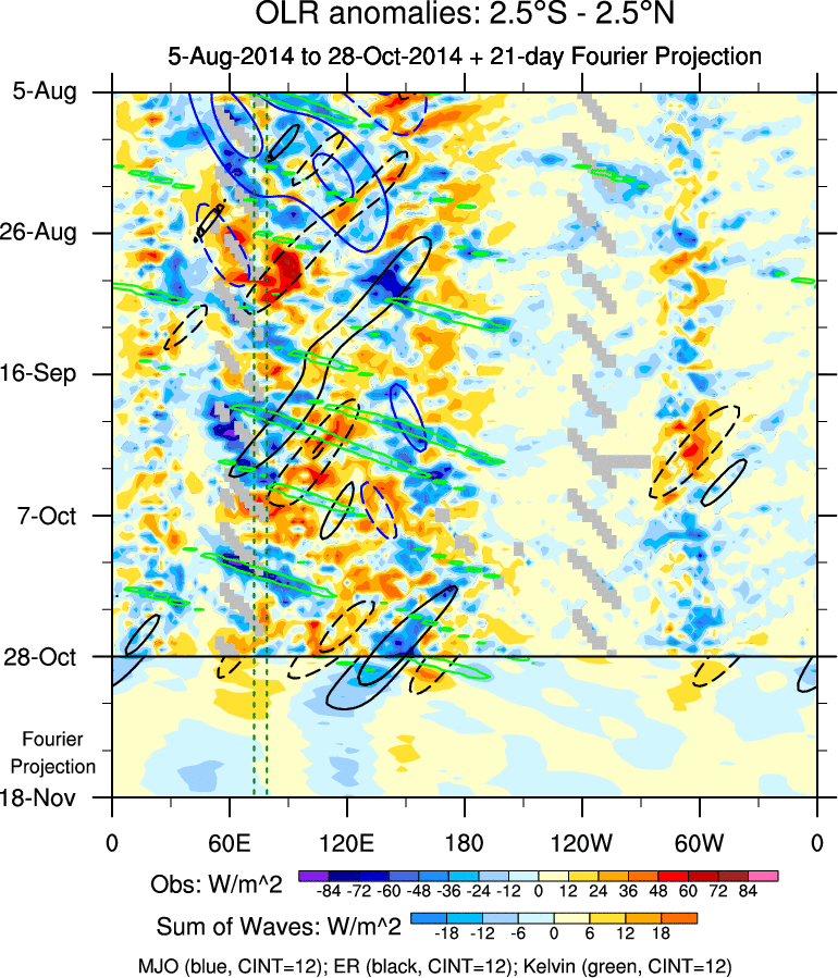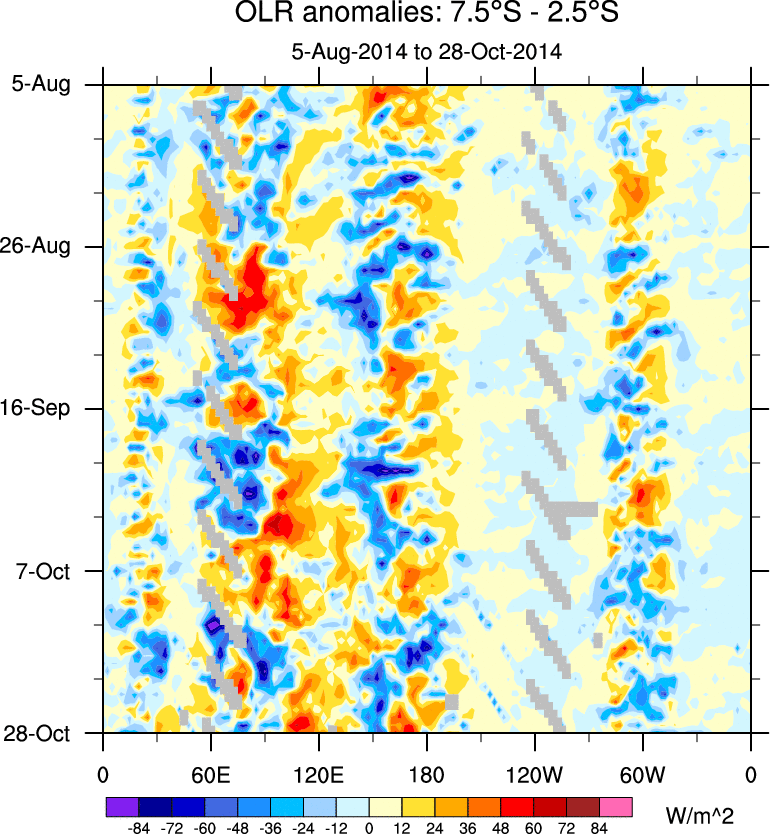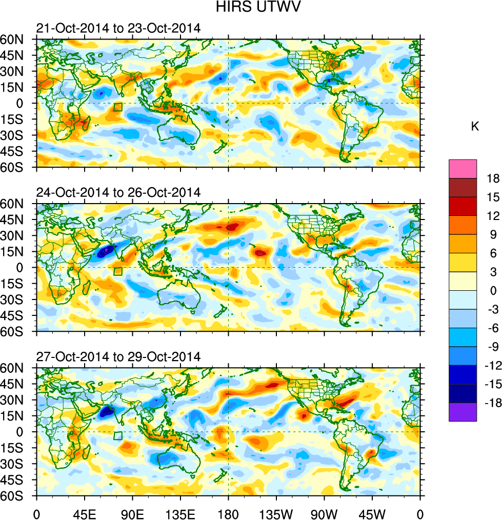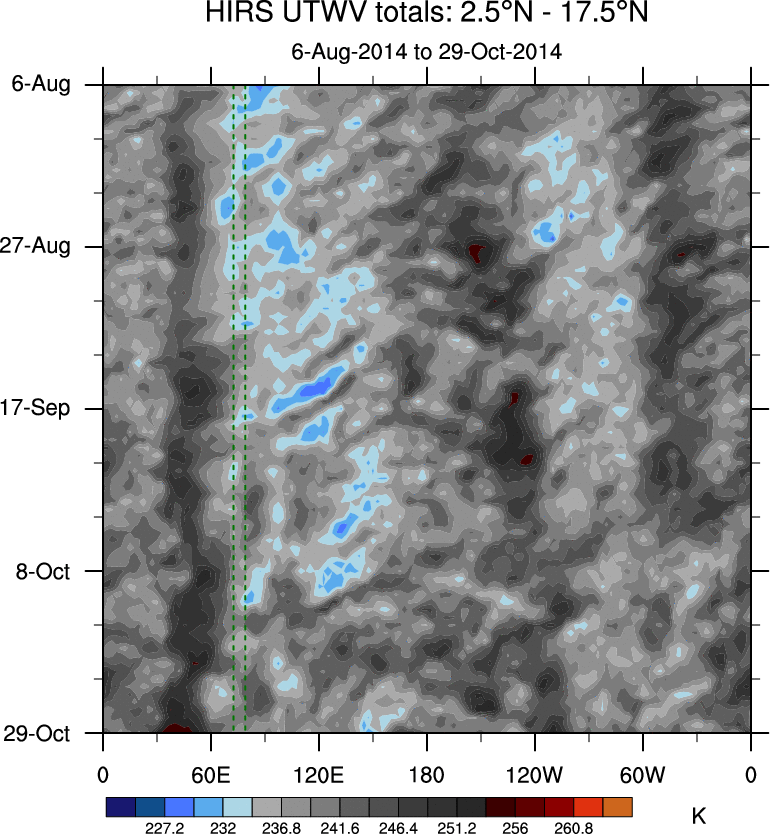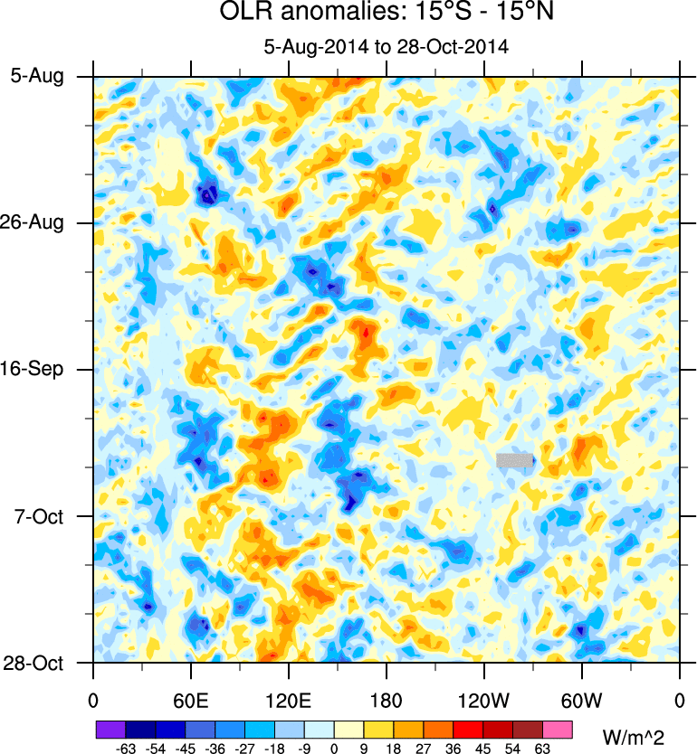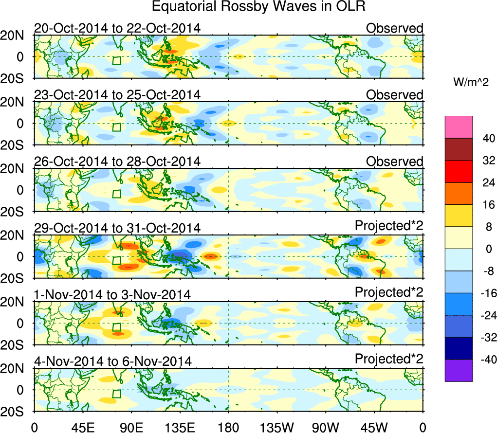 To identify tropical waves in near real-time, the OLR and UTWV data are filtered following Wheeler & Weickmann (2001 MWR). The daily anomalies are calculated using the first 3 harmonics of the seasonal cycle for 1979–2009. Missing values are then filled using linear interpolation in space and time. The most recent 365 days of anomalies are padded with 659 days of zeroes, and the result is filtered for each wave type.