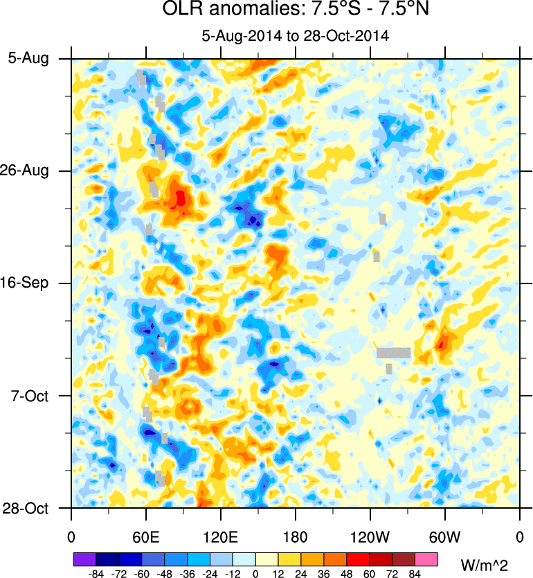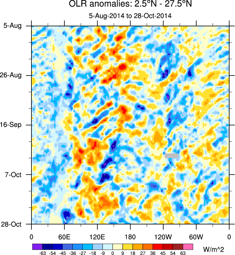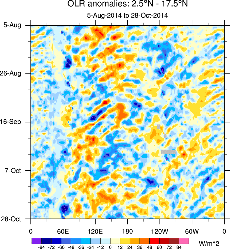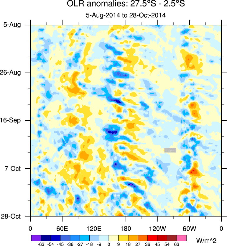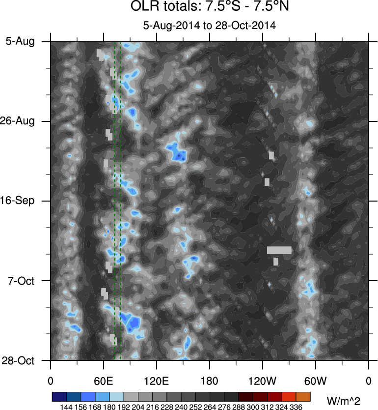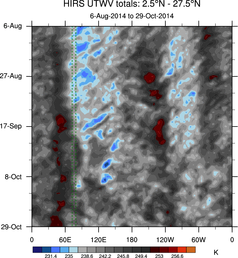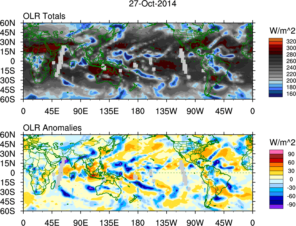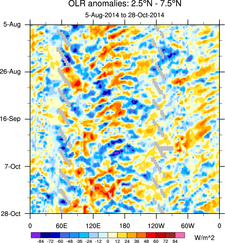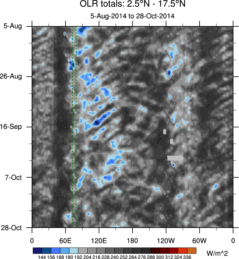 To identify tropical waves in near real-time, the OLR and UTWV data are filtered following Wheeler & Weickmann (2001 MWR). The daily anomalies are calculated using the first 3 harmonics of the seasonal cycle for 1979–2009. Missing values are then filled using linear interpolation in space and time. The most recent 365 days of anomalies are padded with 659 days of zeroes, and the result is filtered for each wave type.
