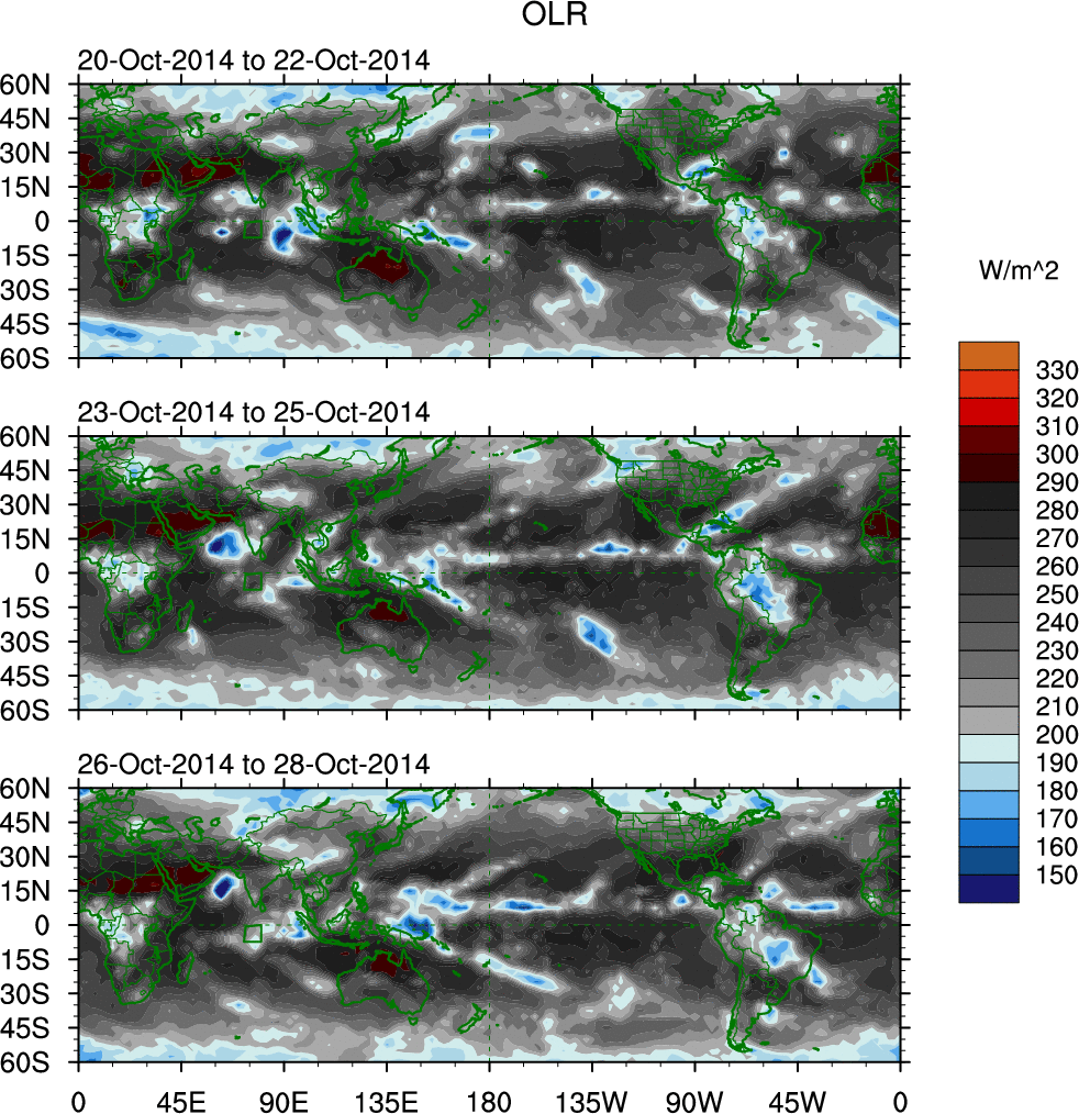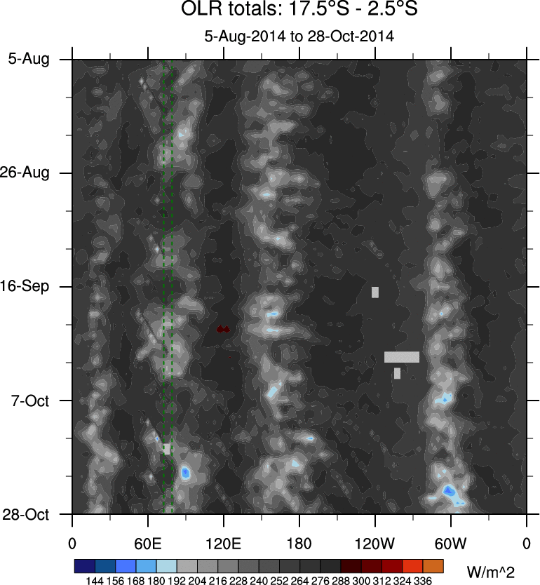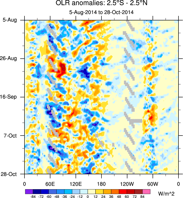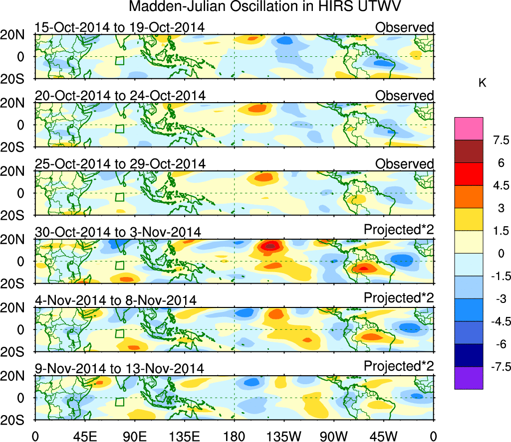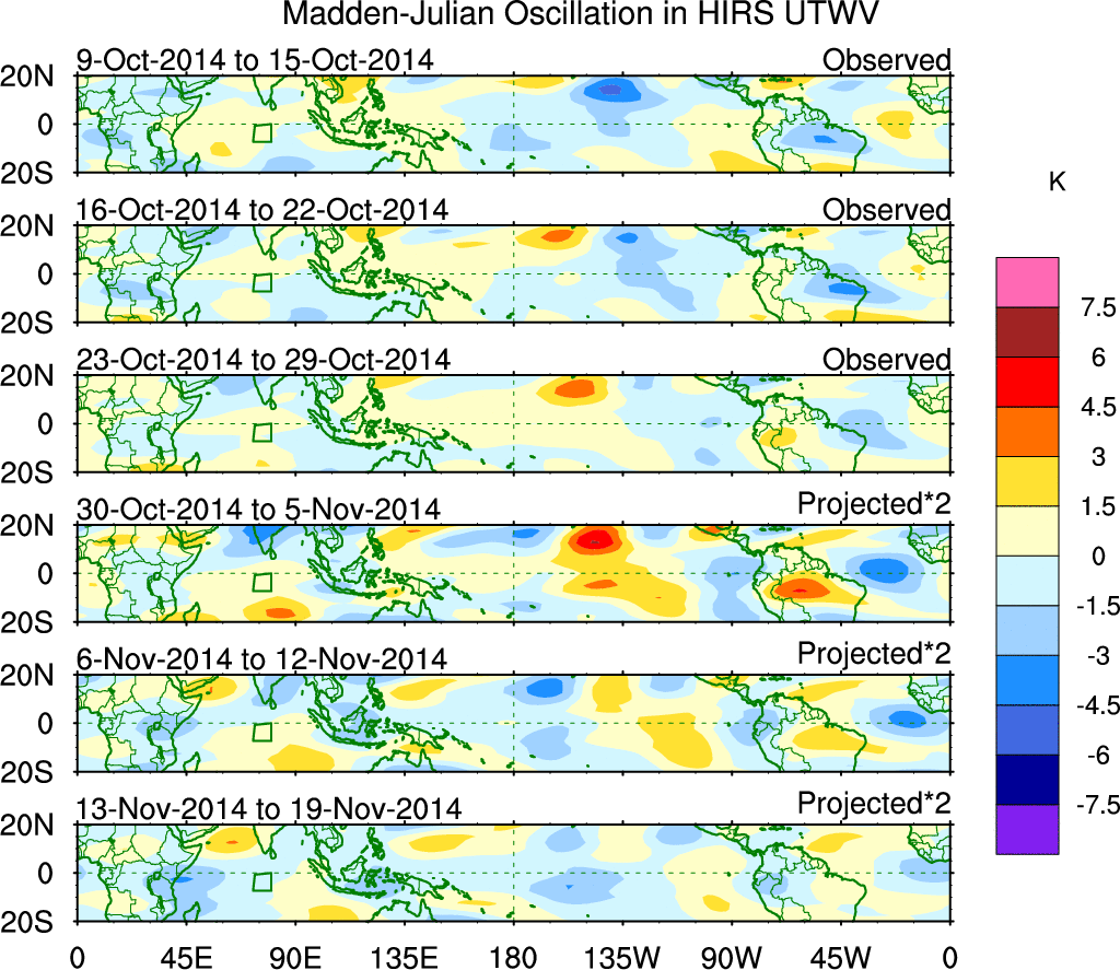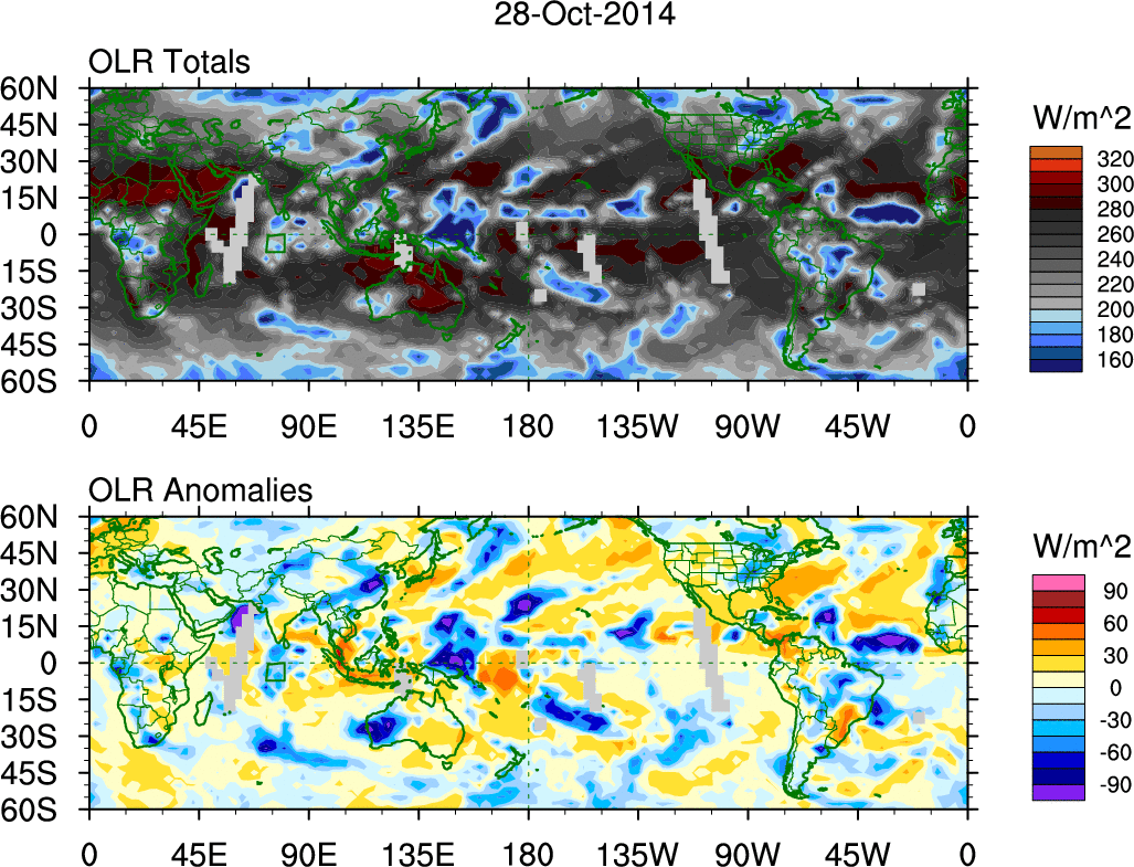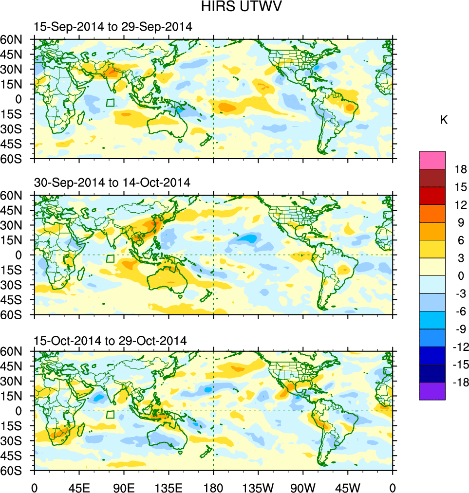 To identify tropical waves in near real-time, the OLR and UTWV data are filtered following Wheeler & Weickmann (2001 MWR). The daily anomalies are calculated using the first 3 harmonics of the seasonal cycle for 1979–2009. Missing values are then filled using linear interpolation in space and time. The most recent 365 days of anomalies are padded with 659 days of zeroes, and the result is filtered for each wave type.