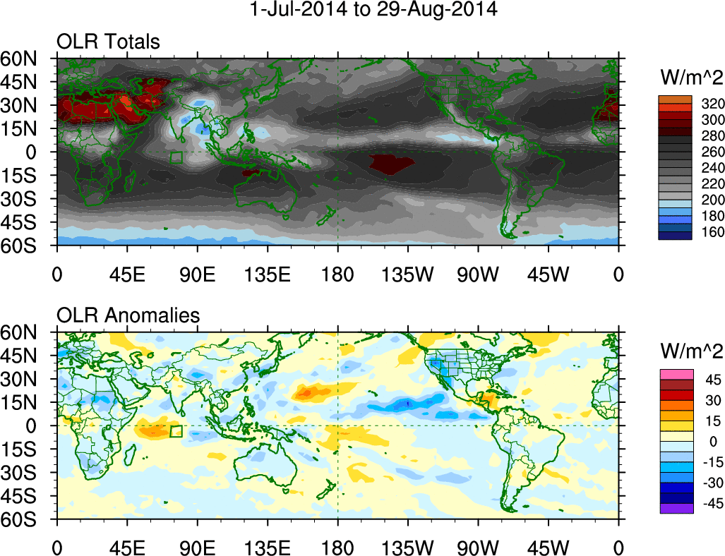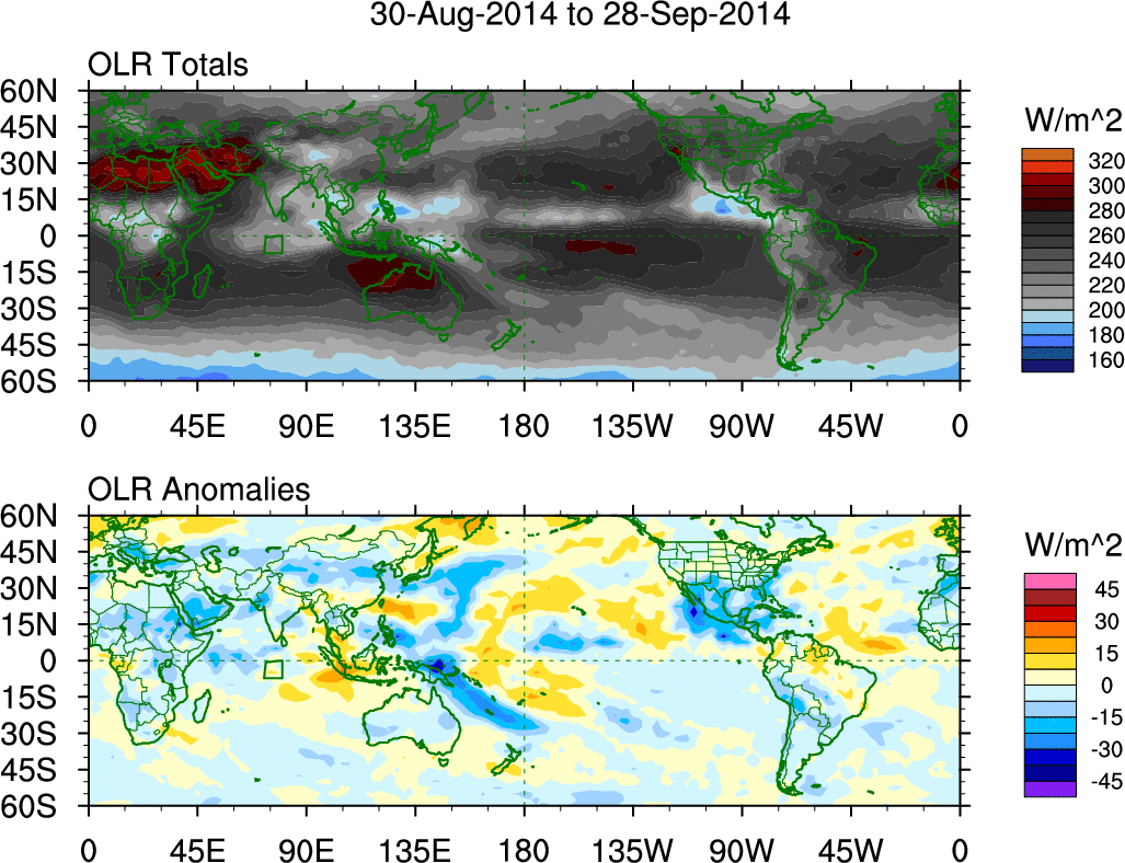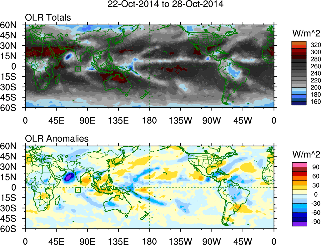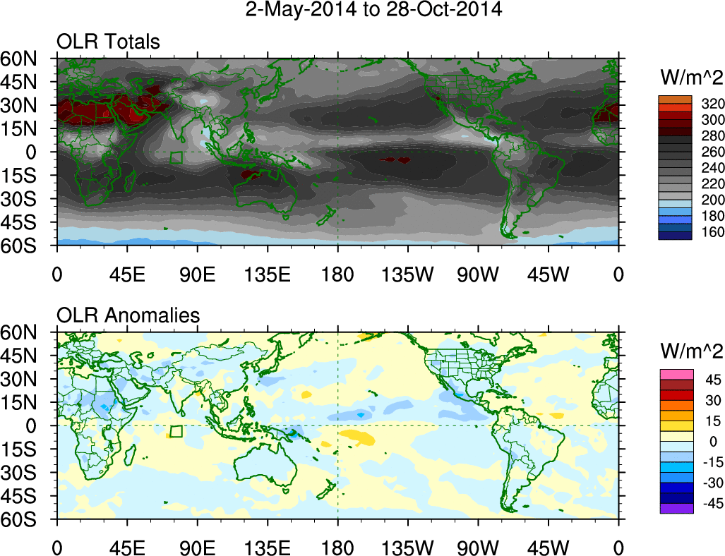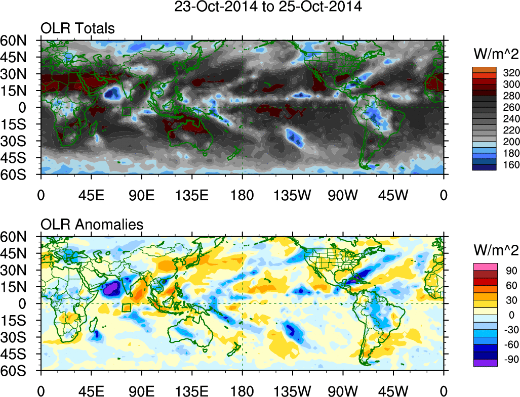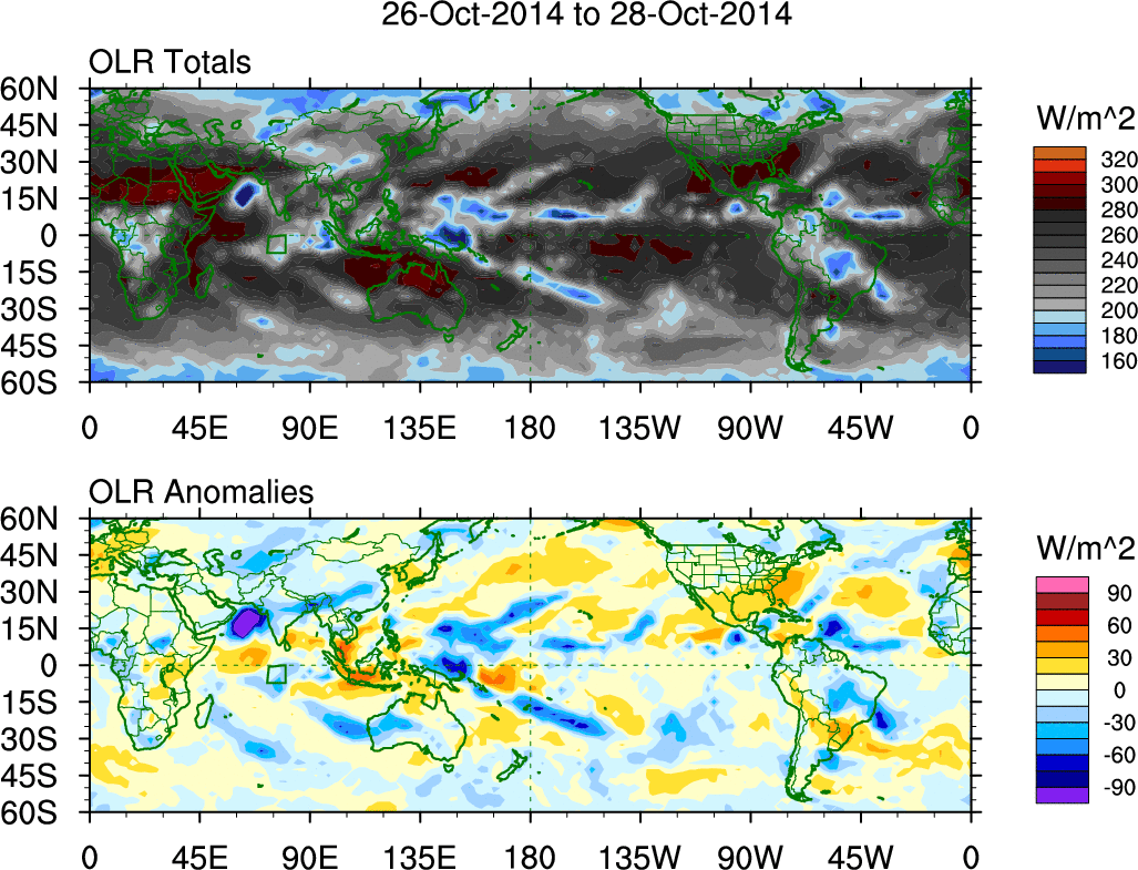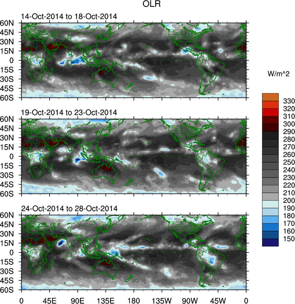 To identify tropical waves in near real-time, the OLR and UTWV data are filtered following Wheeler & Weickmann (2001 MWR). The daily anomalies are calculated using the first 3 harmonics of the seasonal cycle for 1979–2009. Missing values are then filled using linear interpolation in space and time. The most recent 365 days of anomalies are padded with 659 days of zeroes, and the result is filtered for each wave type.