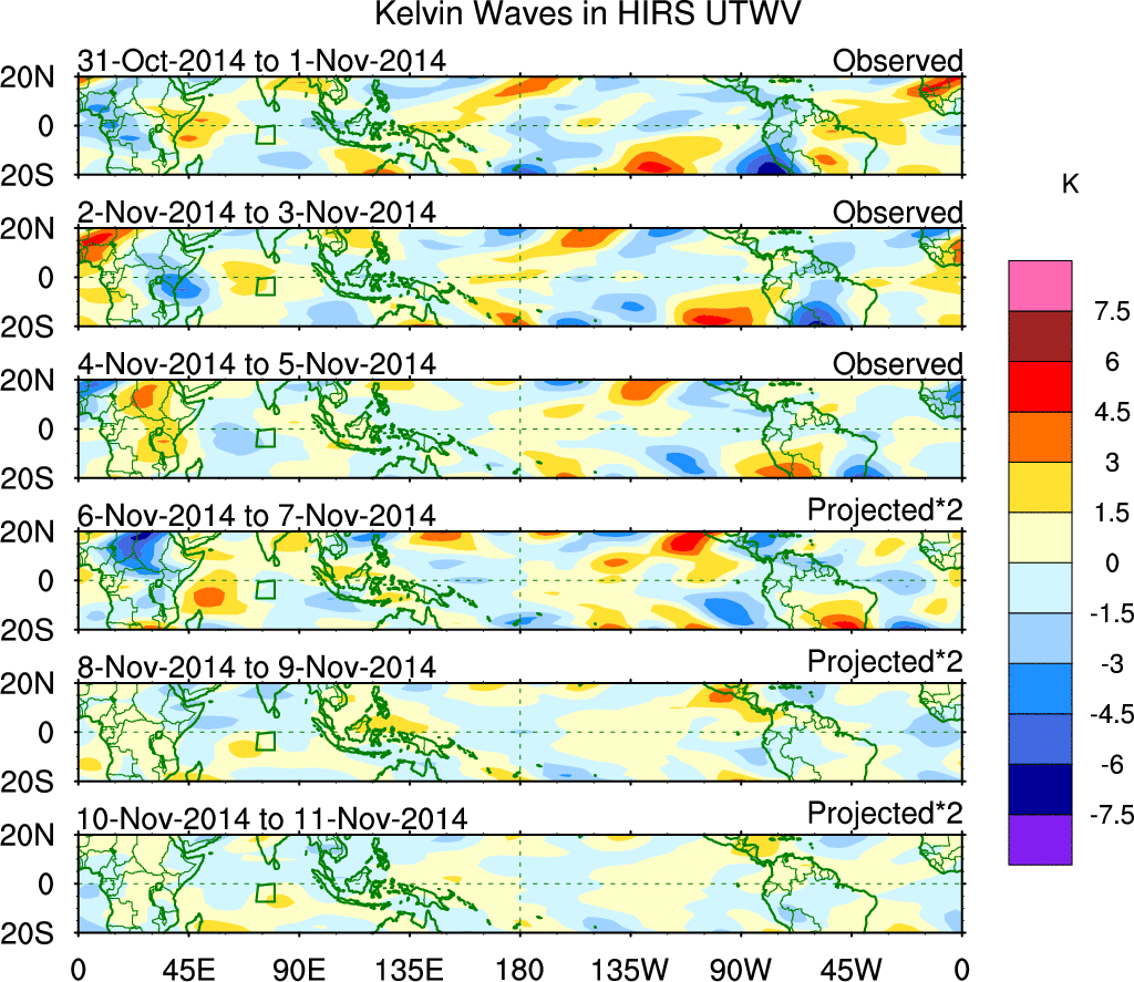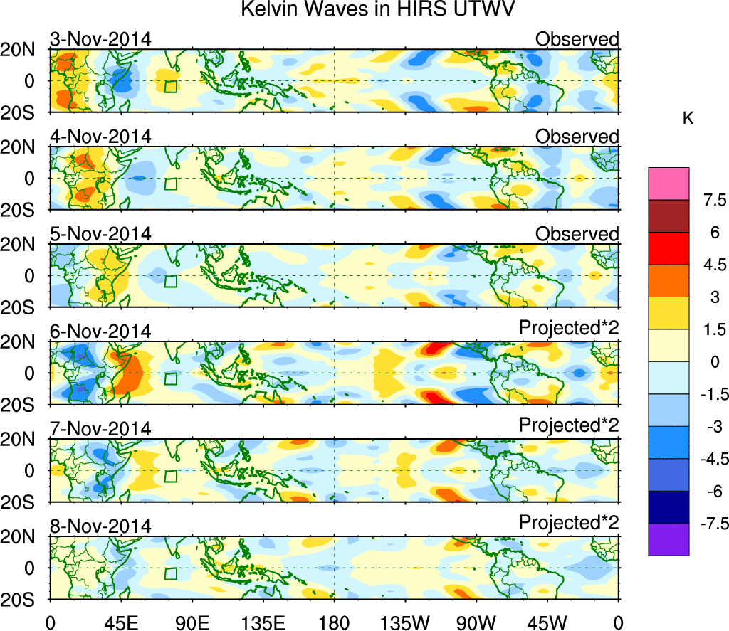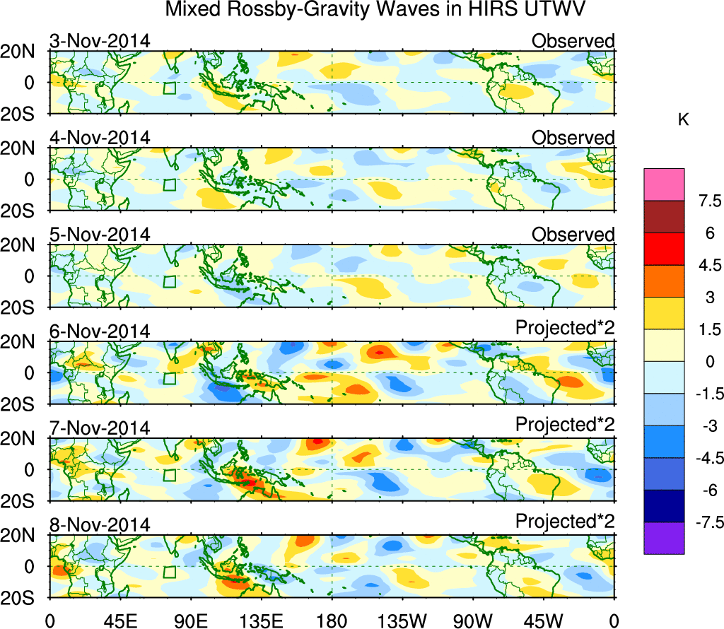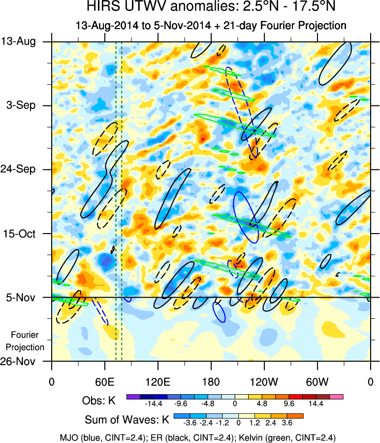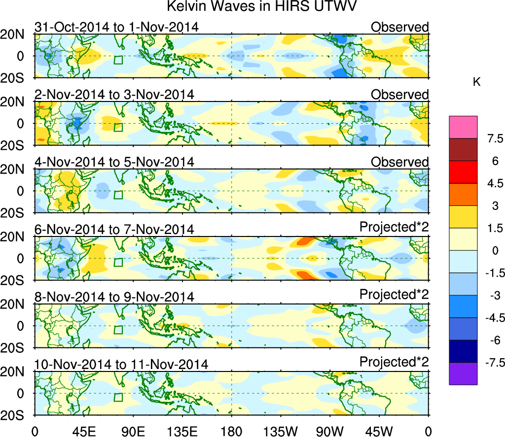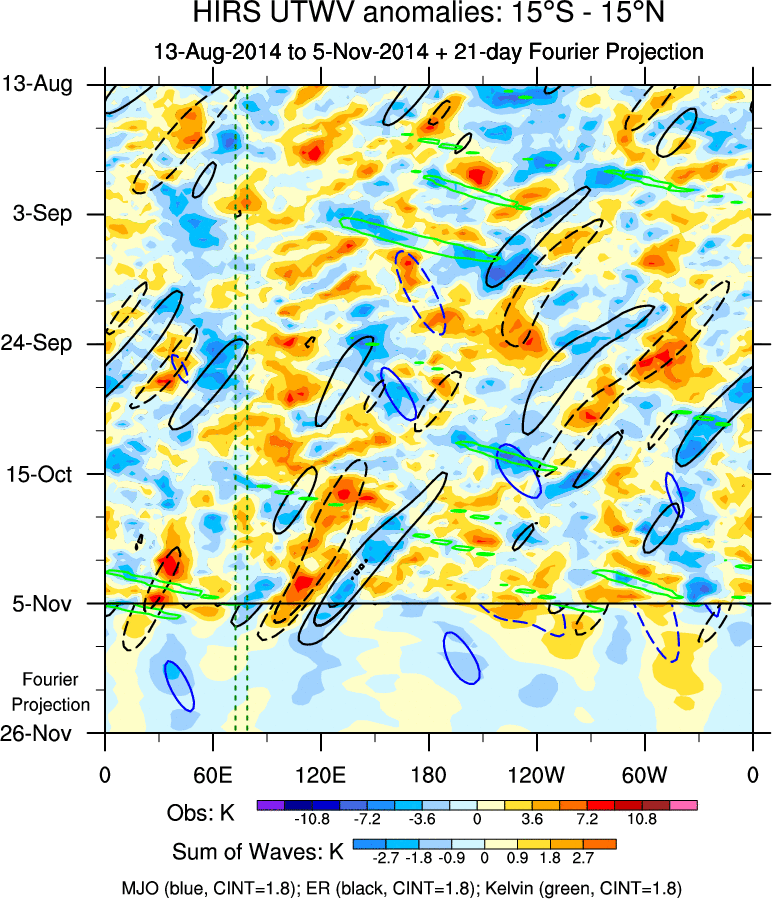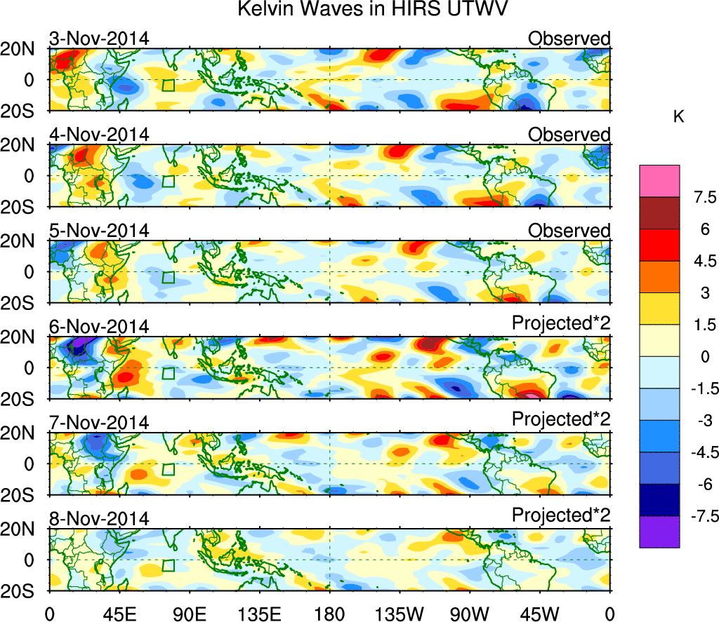 To identify tropical waves in near real-time, the OLR and UTWV data are filtered following Wheeler & Weickmann (2001 MWR). The daily anomalies are calculated using the first 3 harmonics of the seasonal cycle for 1979–2009. Missing values are then filled using linear interpolation in space and time. The most recent 365 days of anomalies are padded with 659 days of zeroes, and the result is filtered for each wave type.