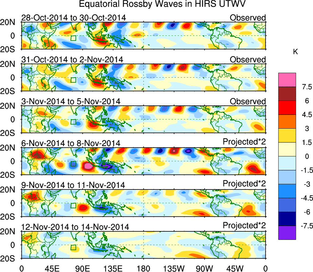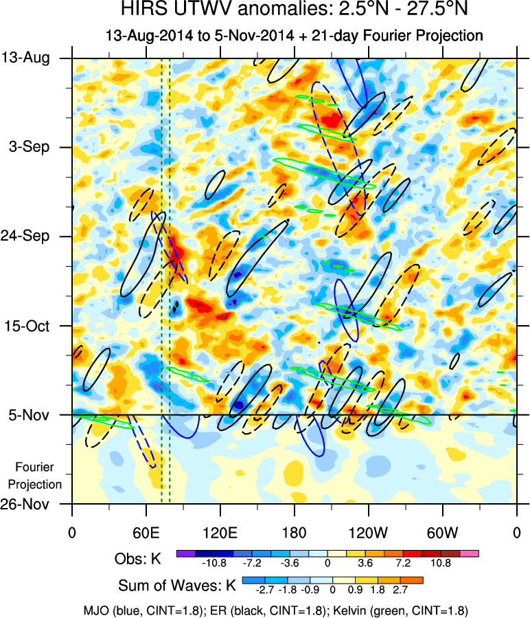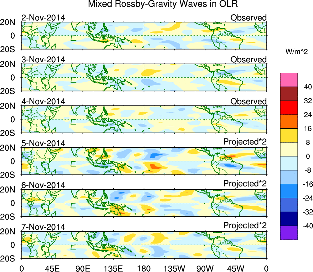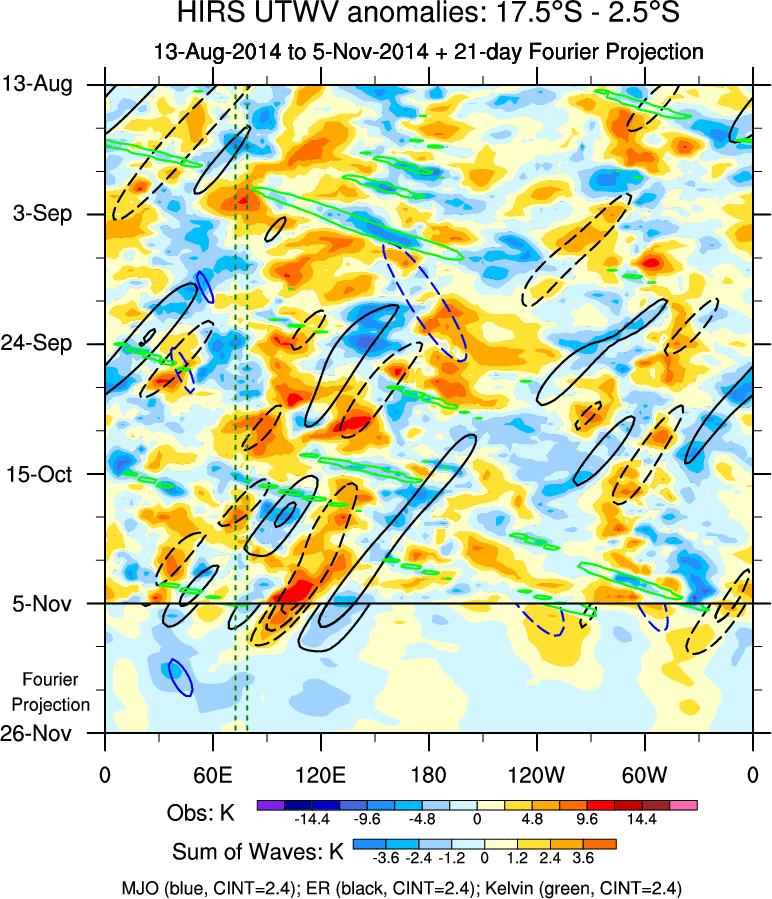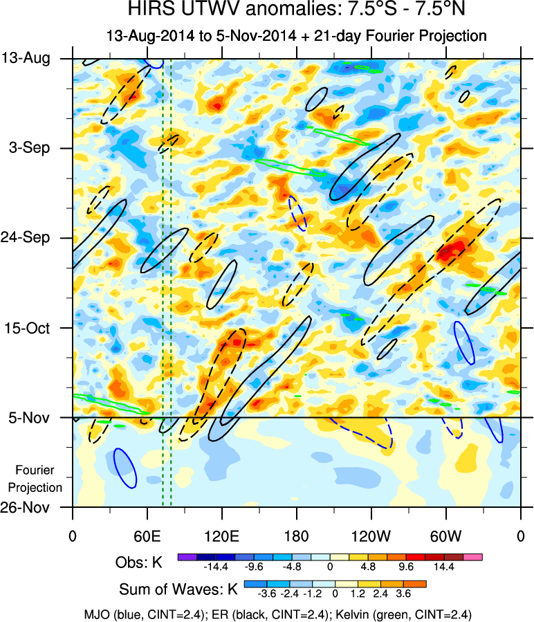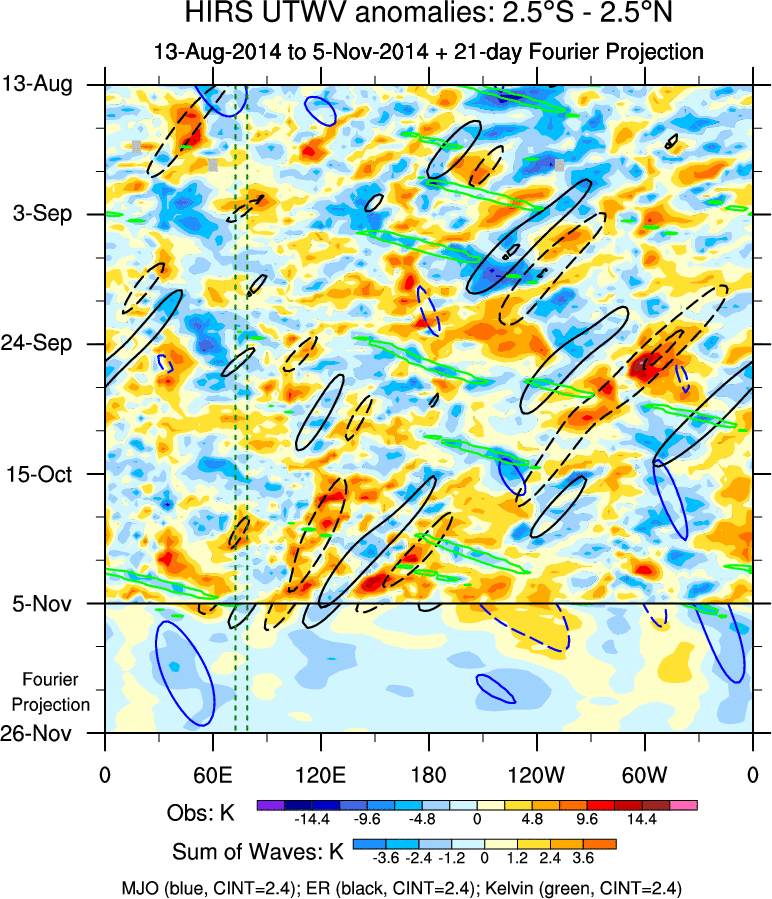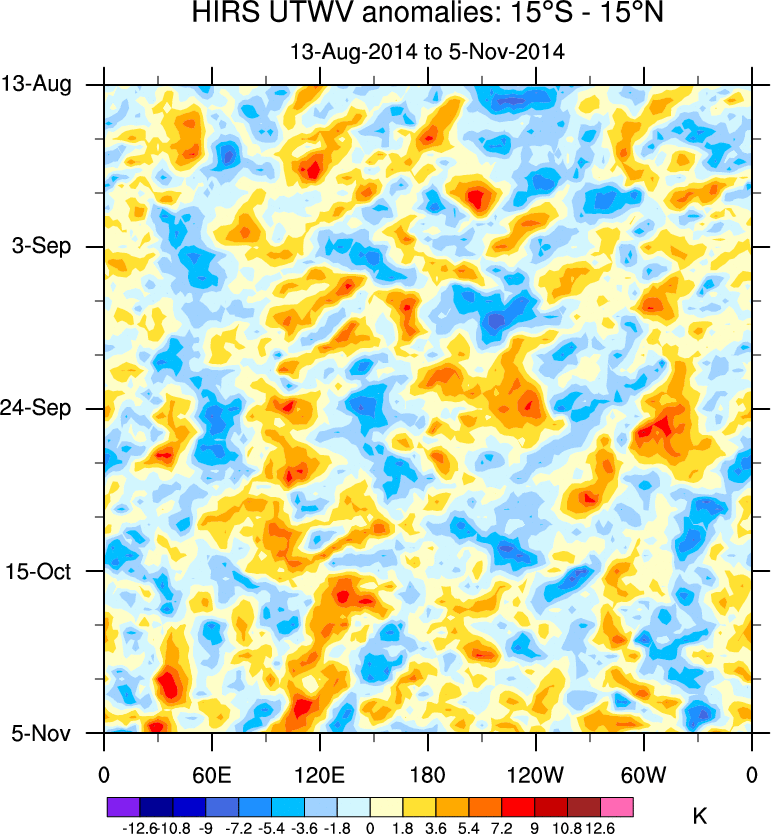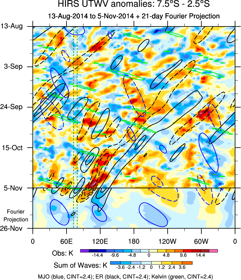 To identify tropical waves in near real-time, the OLR and UTWV data are filtered following Wheeler & Weickmann (2001 MWR). The daily anomalies are calculated using the first 3 harmonics of the seasonal cycle for 1979–2009. Missing values are then filled using linear interpolation in space and time. The most recent 365 days of anomalies are padded with 659 days of zeroes, and the result is filtered for each wave type.