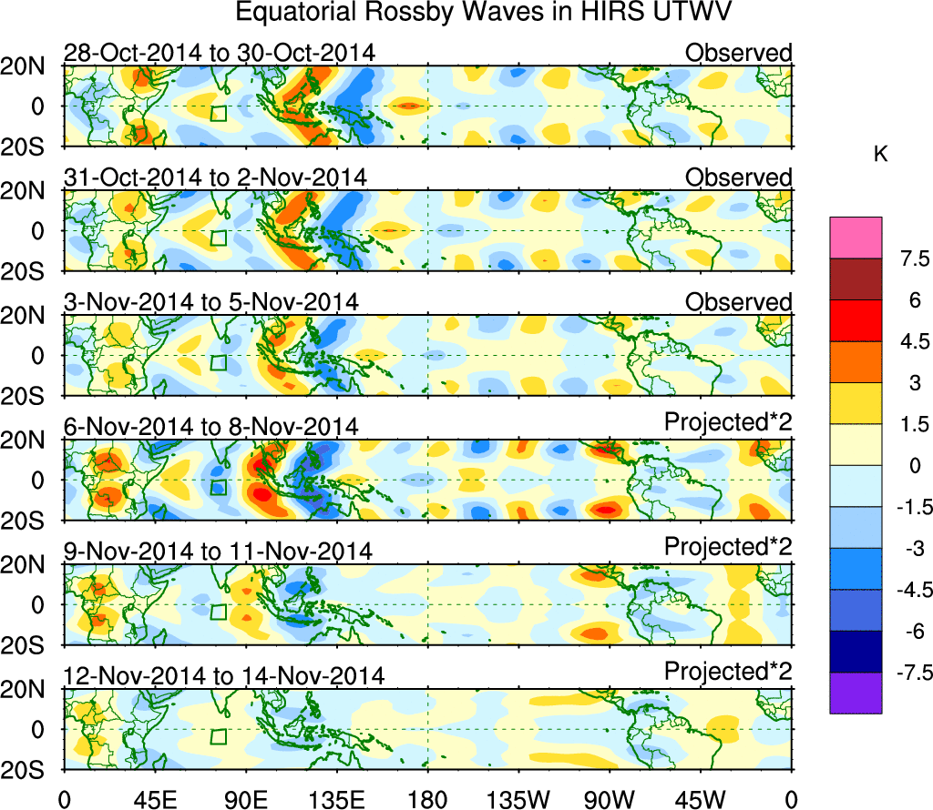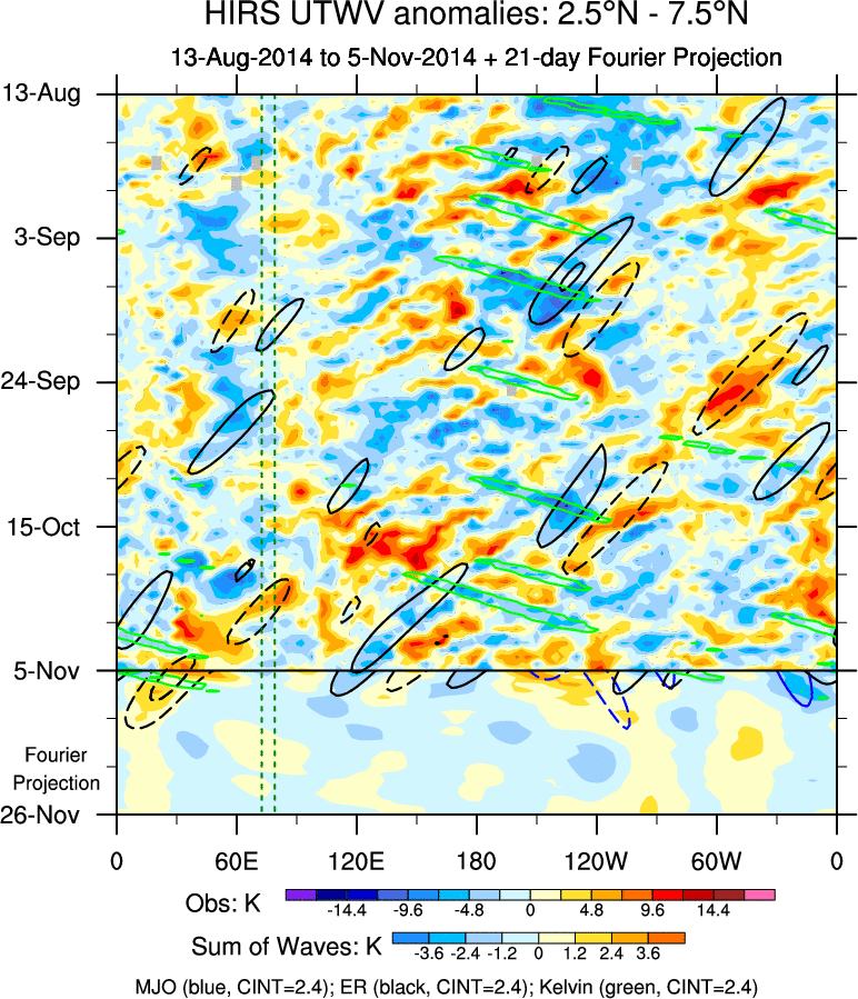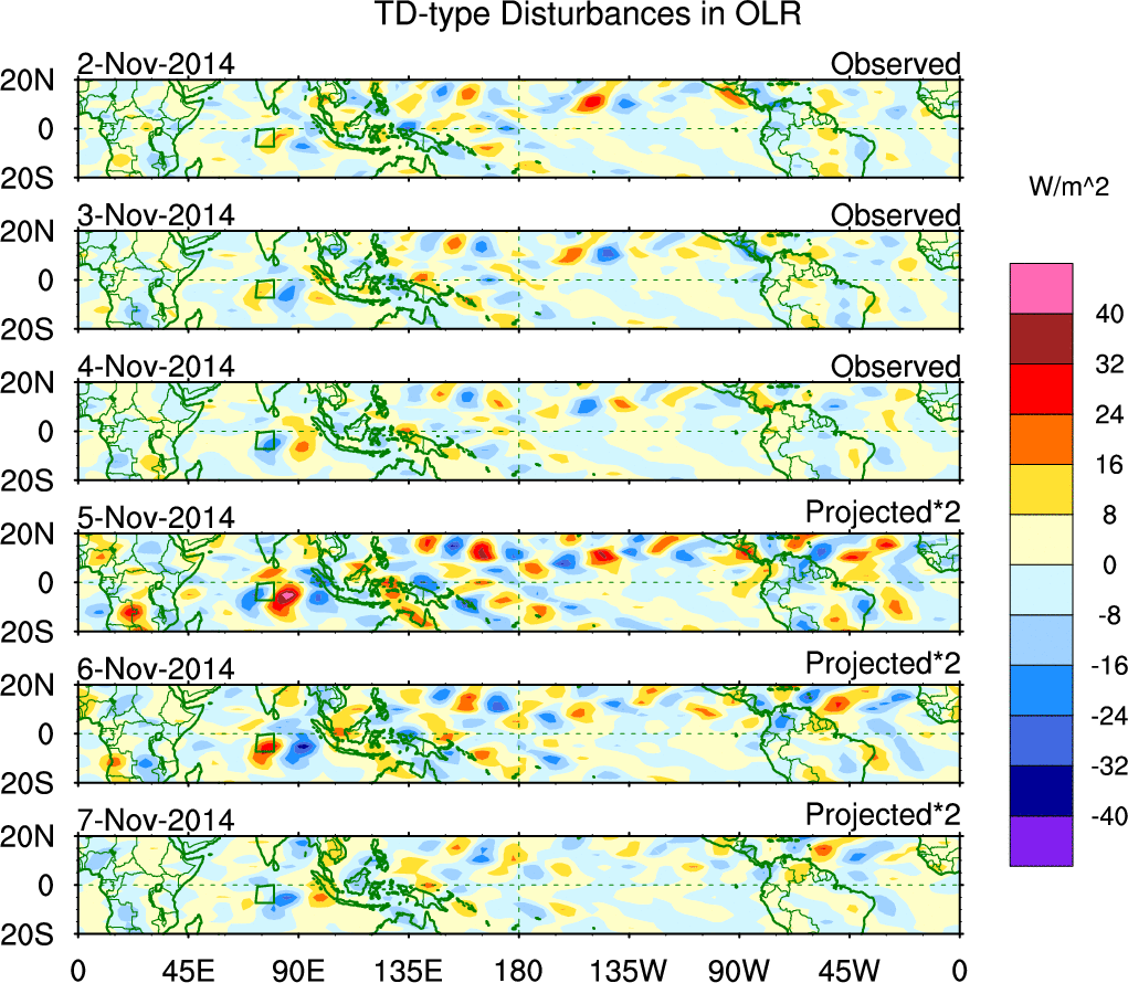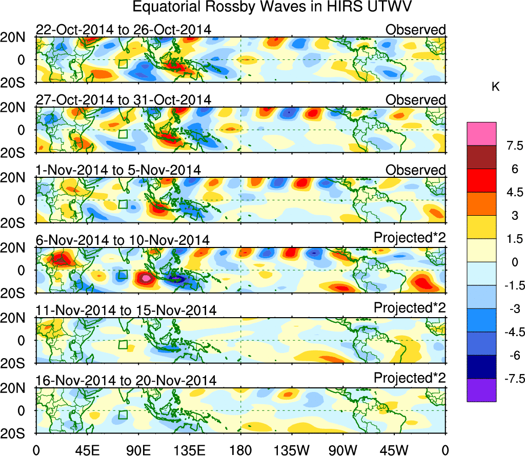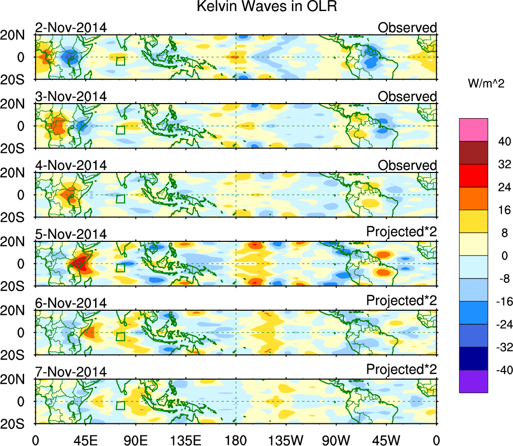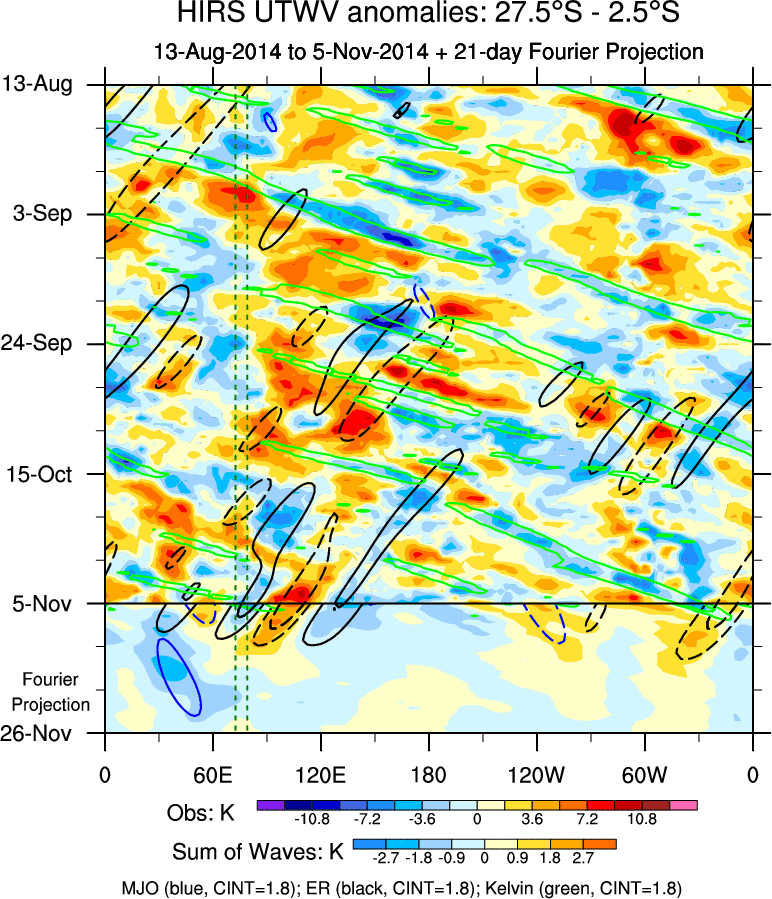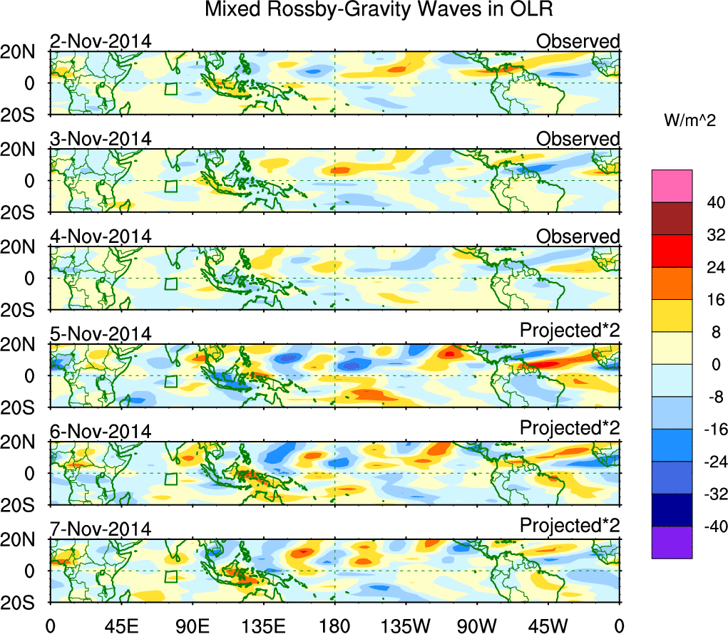 To identify tropical waves in near real-time, the OLR and UTWV data are filtered following Wheeler & Weickmann (2001 MWR). The daily anomalies are calculated using the first 3 harmonics of the seasonal cycle for 1979–2009. Missing values are then filled using linear interpolation in space and time. The most recent 365 days of anomalies are padded with 659 days of zeroes, and the result is filtered for each wave type.