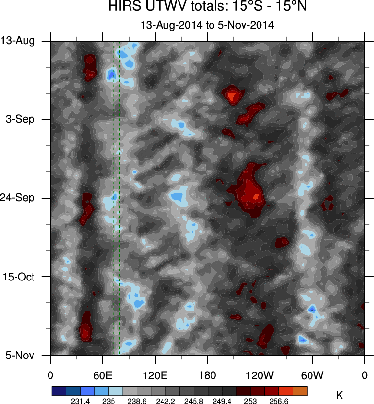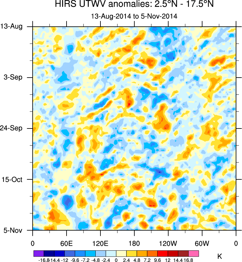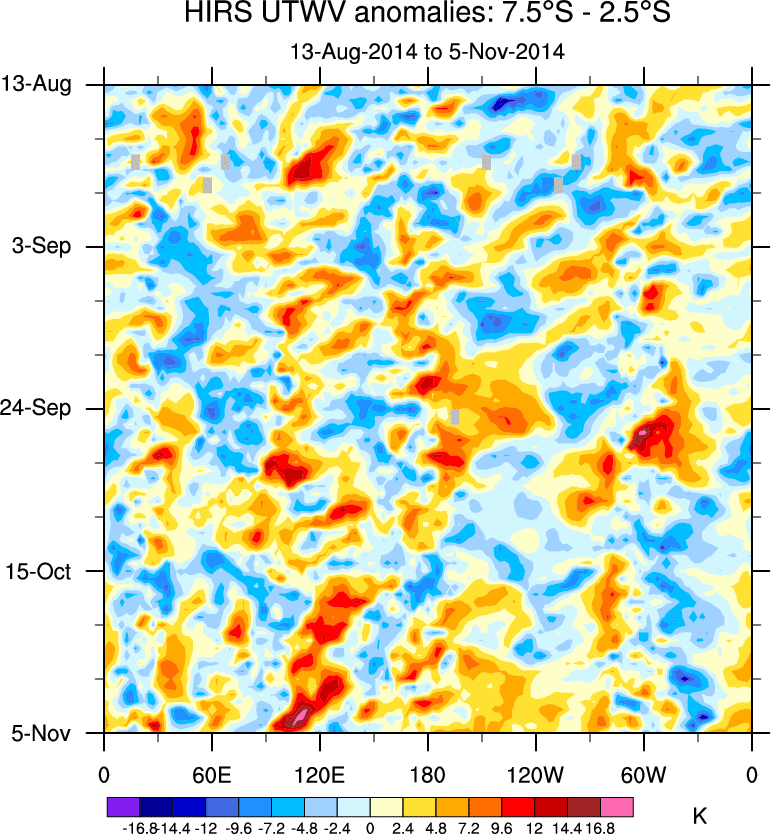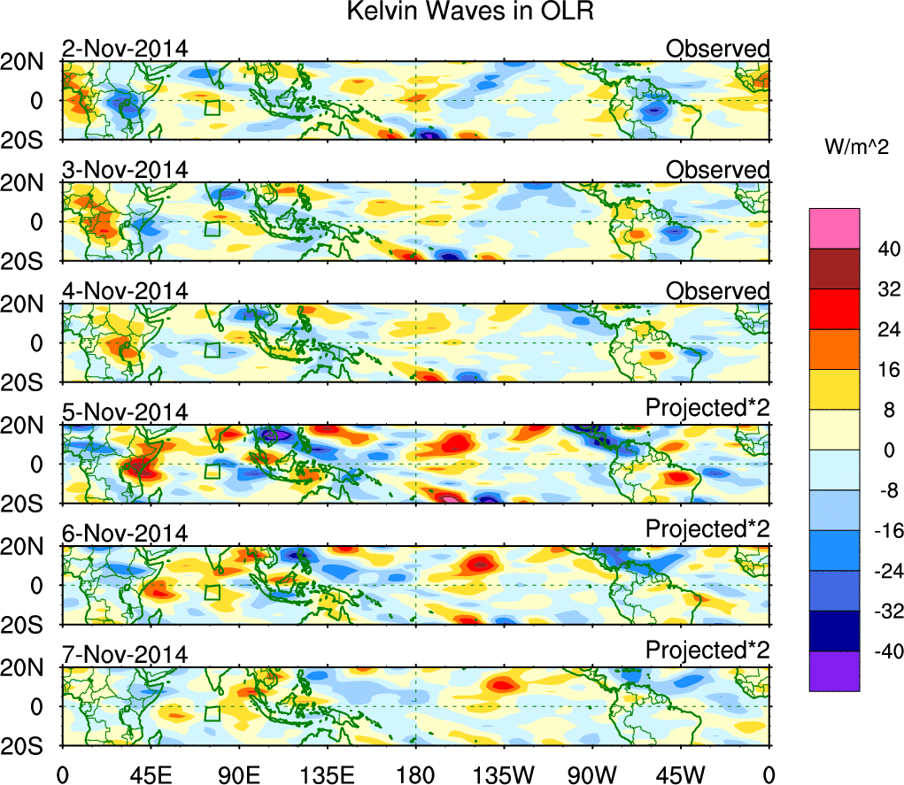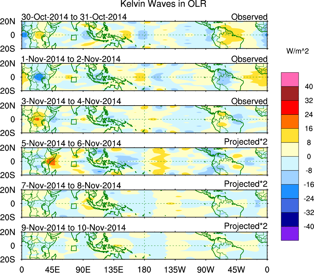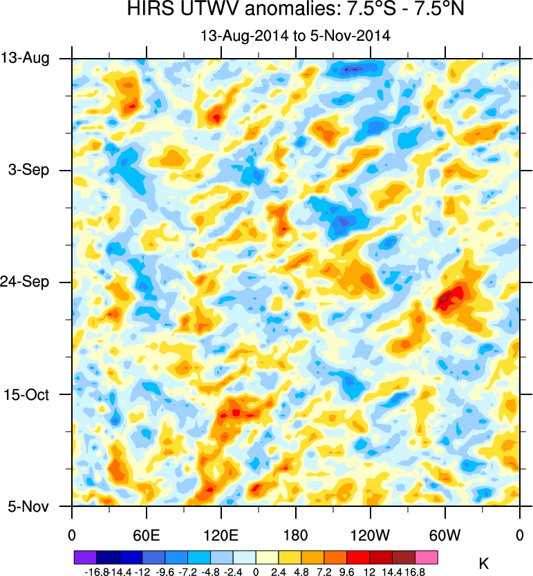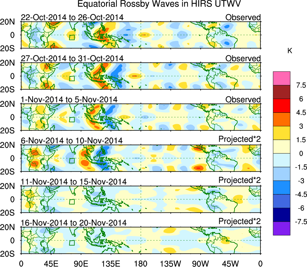To identify tropical waves in near real-time, the OLR and UTWV data are filtered following Wheeler & Weickmann (2001 MWR). The daily anomalies are calculated using the first 3 harmonics of the seasonal cycle for 1979–2009. Missing values are then filled using linear interpolation in space and time. The most recent 365 days of anomalies are padded with 659 days of zeroes, and the result is filtered for each wave type.