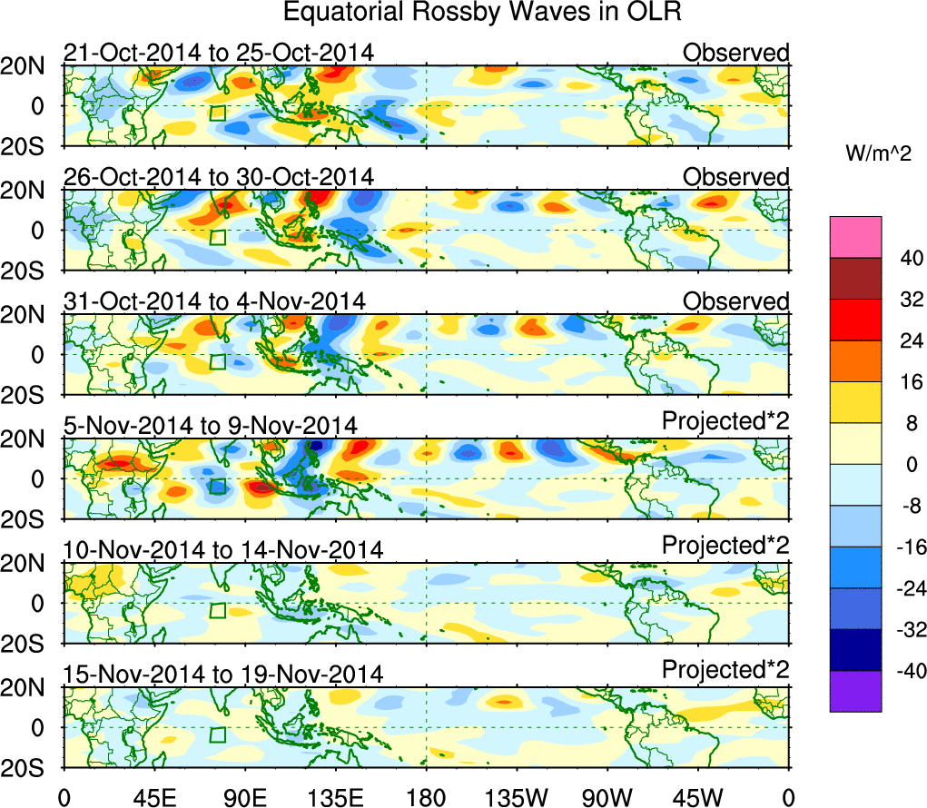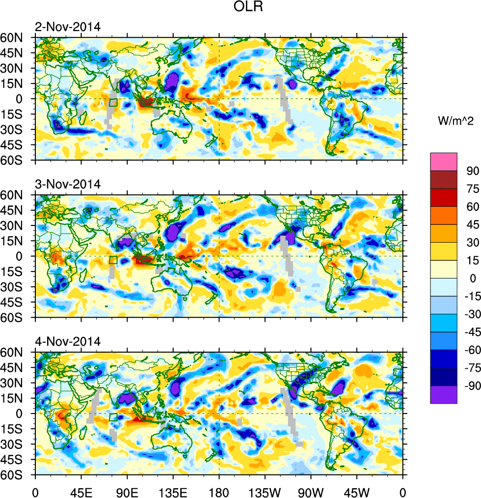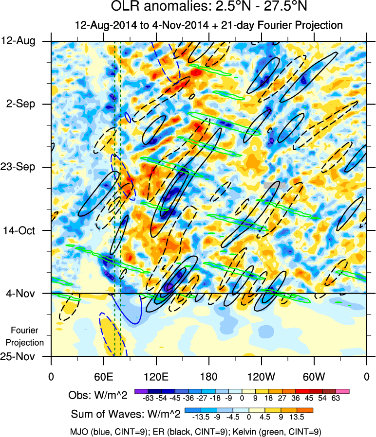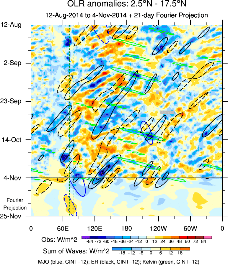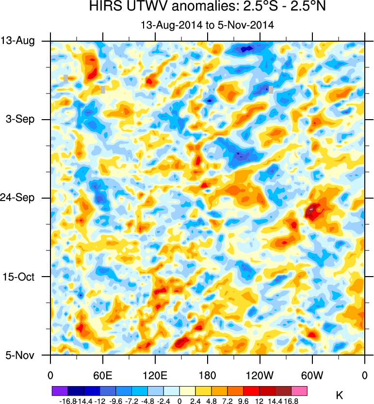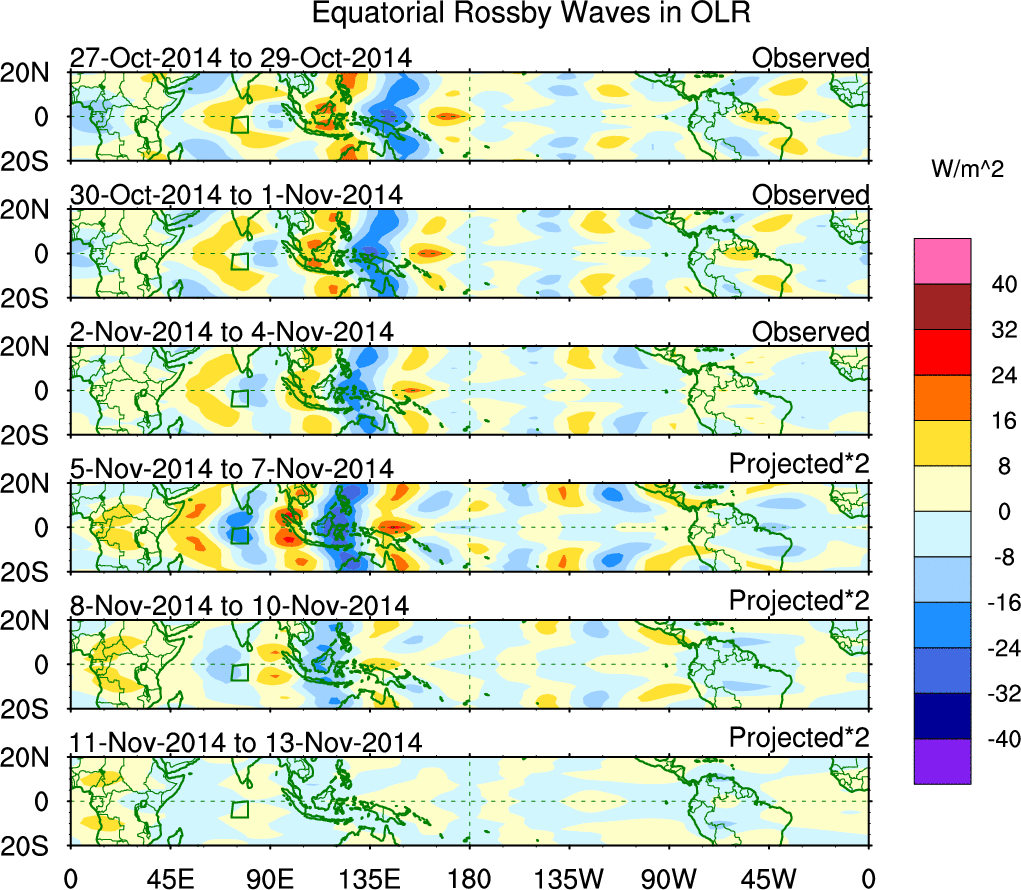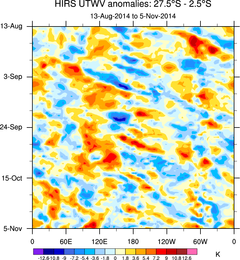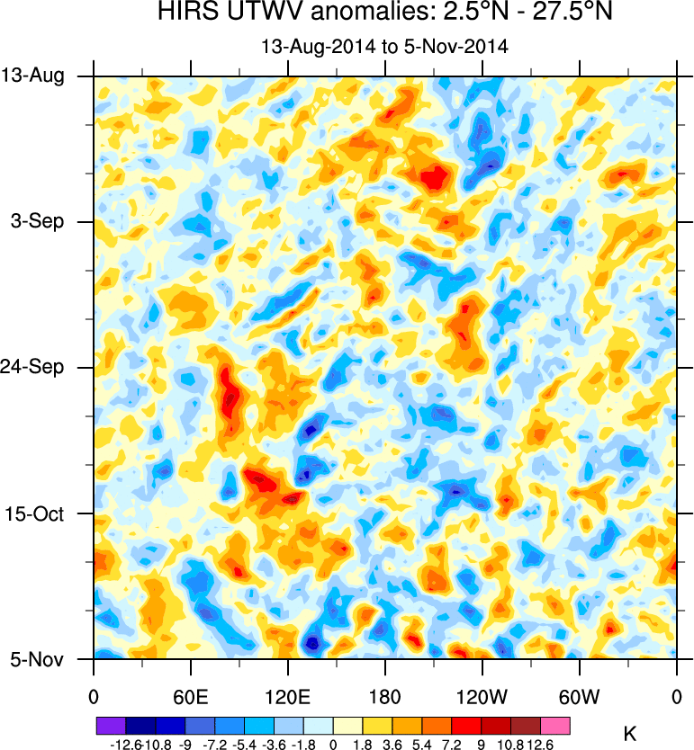 To identify tropical waves in near real-time, the OLR and UTWV data are filtered following Wheeler & Weickmann (2001 MWR). The daily anomalies are calculated using the first 3 harmonics of the seasonal cycle for 1979–2009. Missing values are then filled using linear interpolation in space and time. The most recent 365 days of anomalies are padded with 659 days of zeroes, and the result is filtered for each wave type.