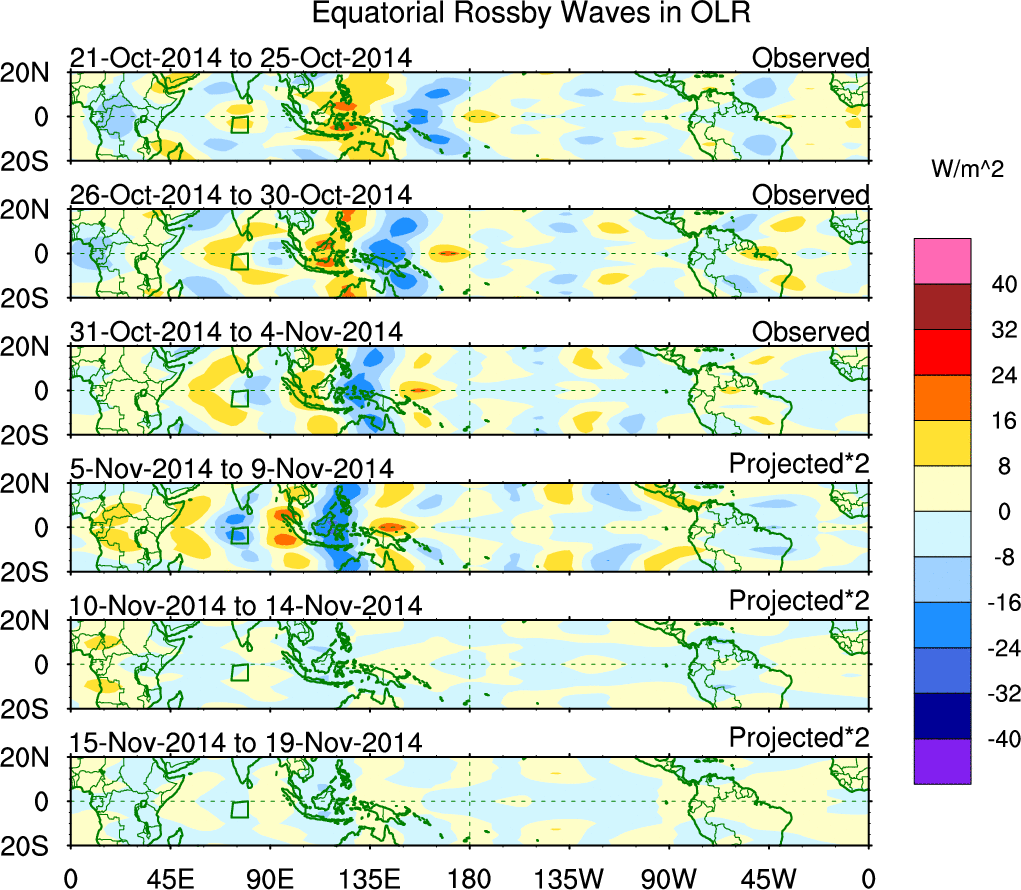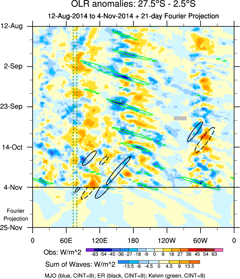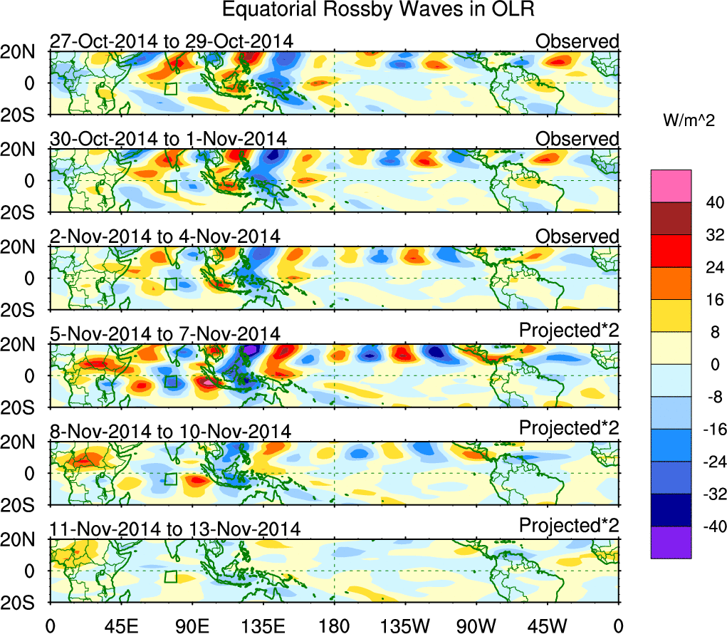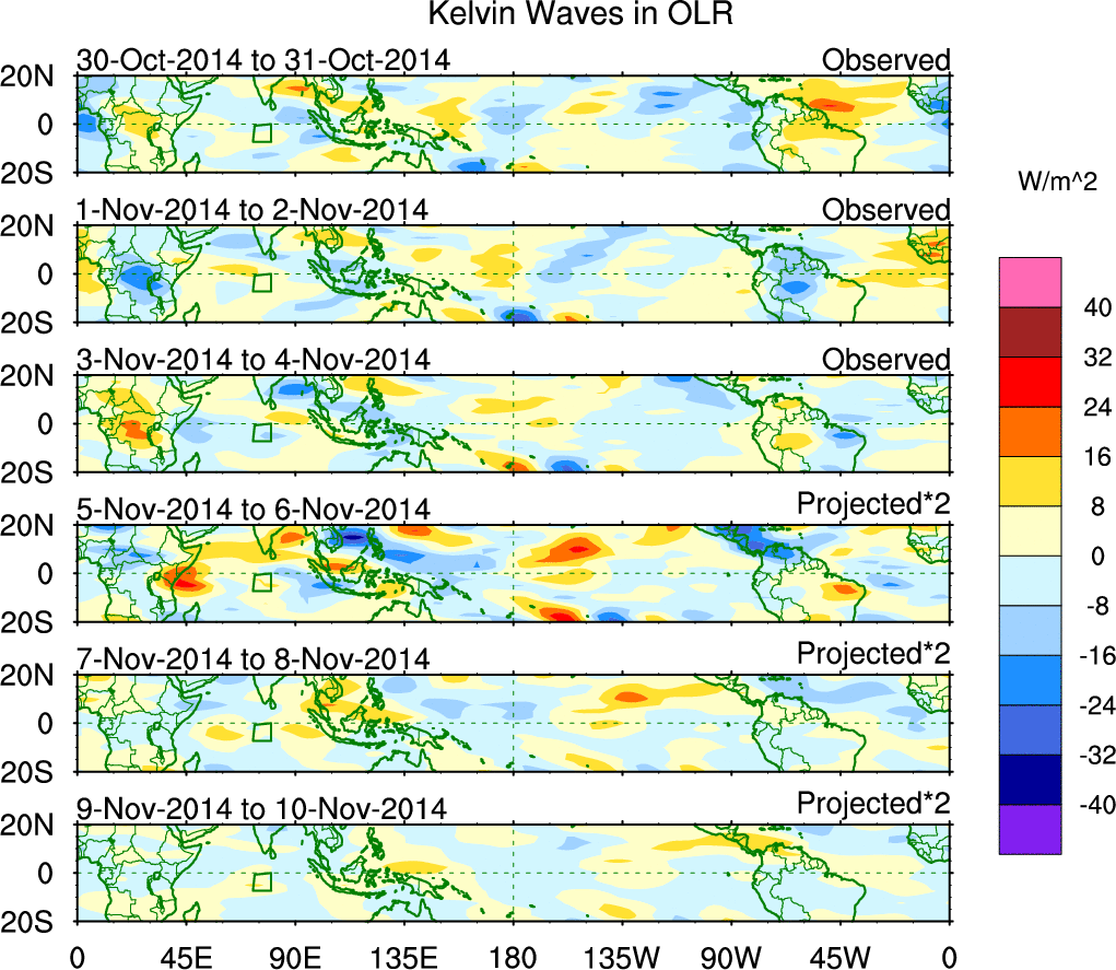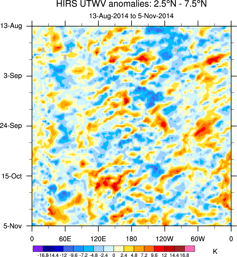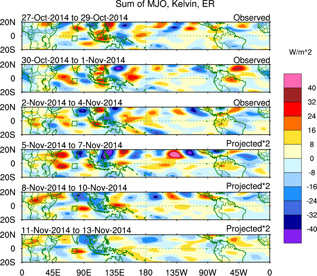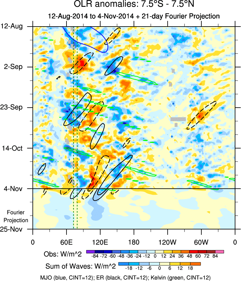To identify tropical waves in near real-time, the OLR and UTWV data are filtered following Wheeler & Weickmann (2001 MWR). The daily anomalies are calculated using the first 3 harmonics of the seasonal cycle for 1979–2009. Missing values are then filled using linear interpolation in space and time. The most recent 365 days of anomalies are padded with 659 days of zeroes, and the result is filtered for each wave type.