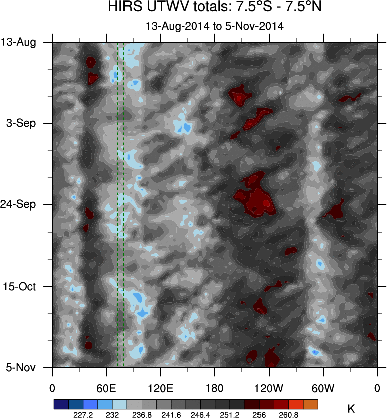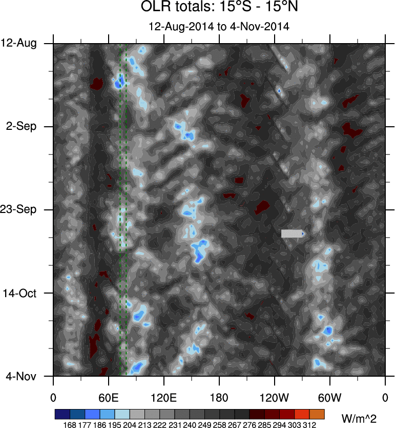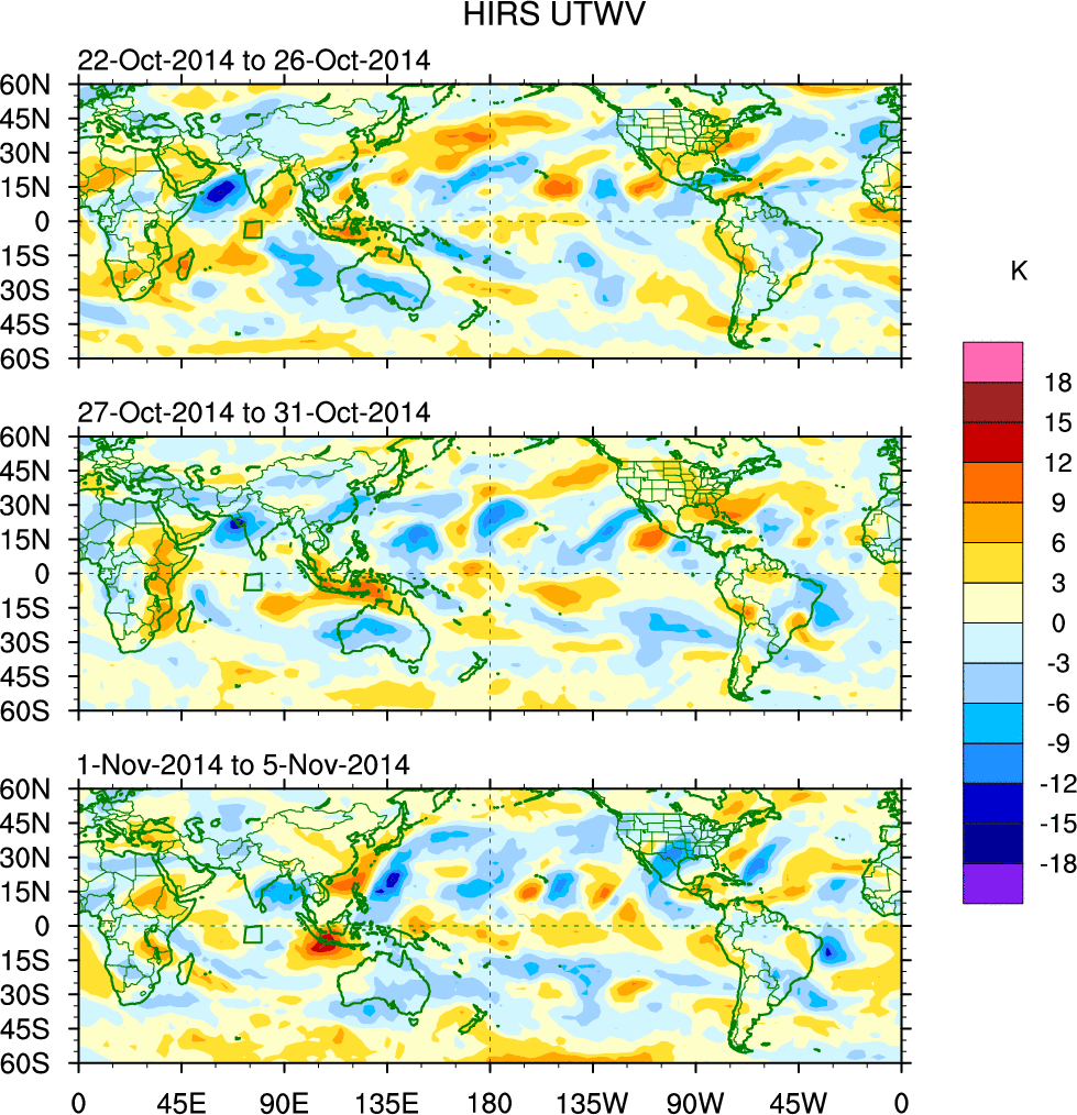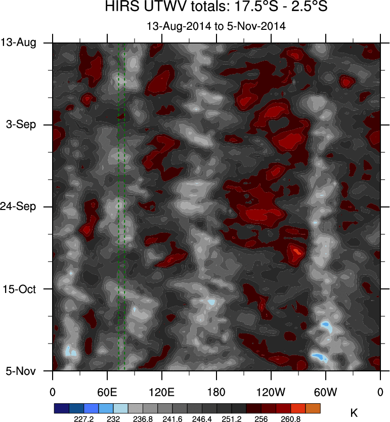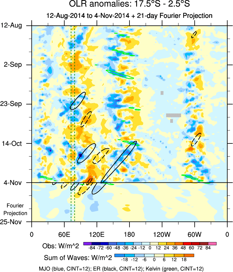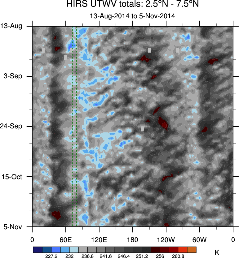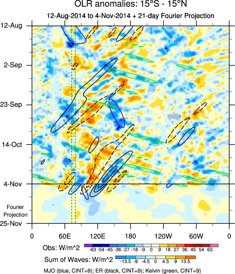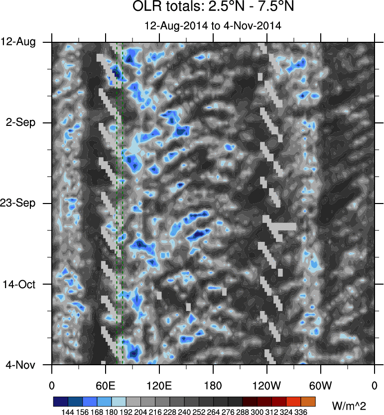To identify tropical waves in near real-time, the OLR and UTWV data are filtered following Wheeler & Weickmann (2001 MWR). The daily anomalies are calculated using the first 3 harmonics of the seasonal cycle for 1979–2009. Missing values are then filled using linear interpolation in space and time. The most recent 365 days of anomalies are padded with 659 days of zeroes, and the result is filtered for each wave type.