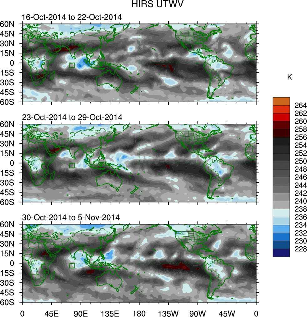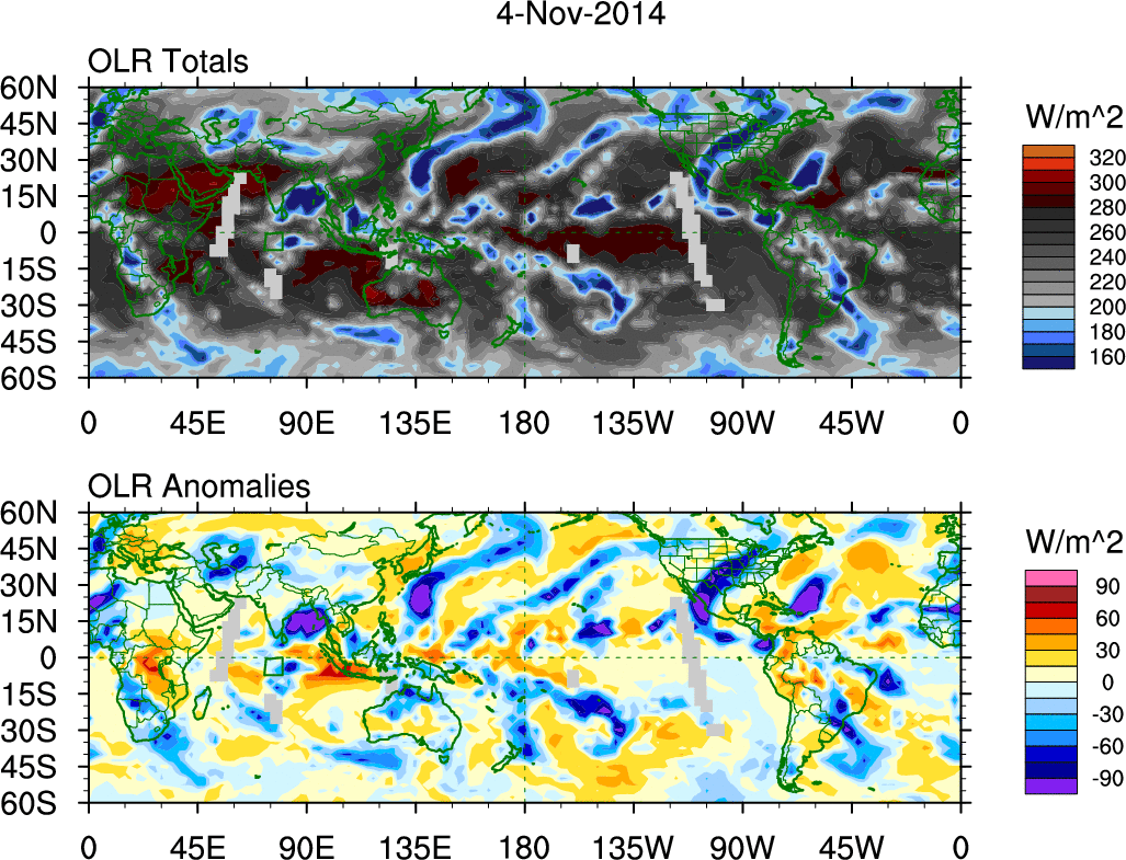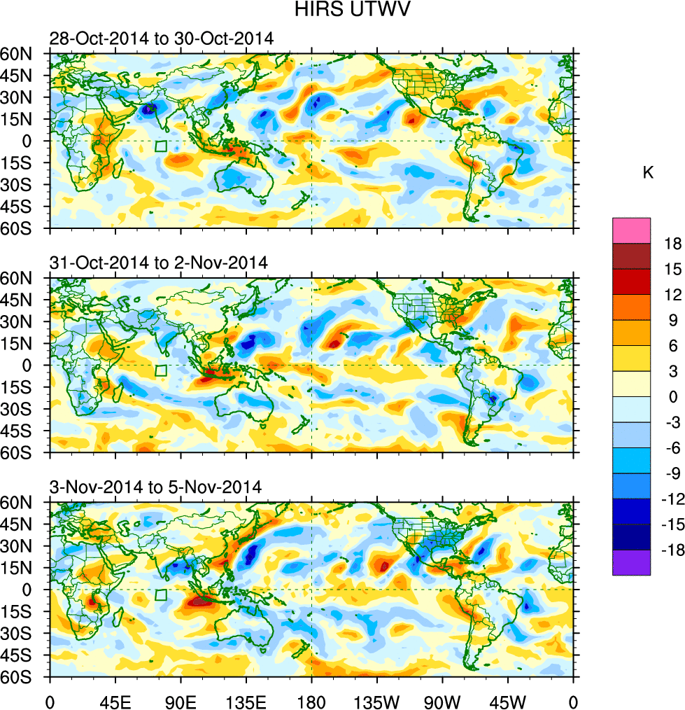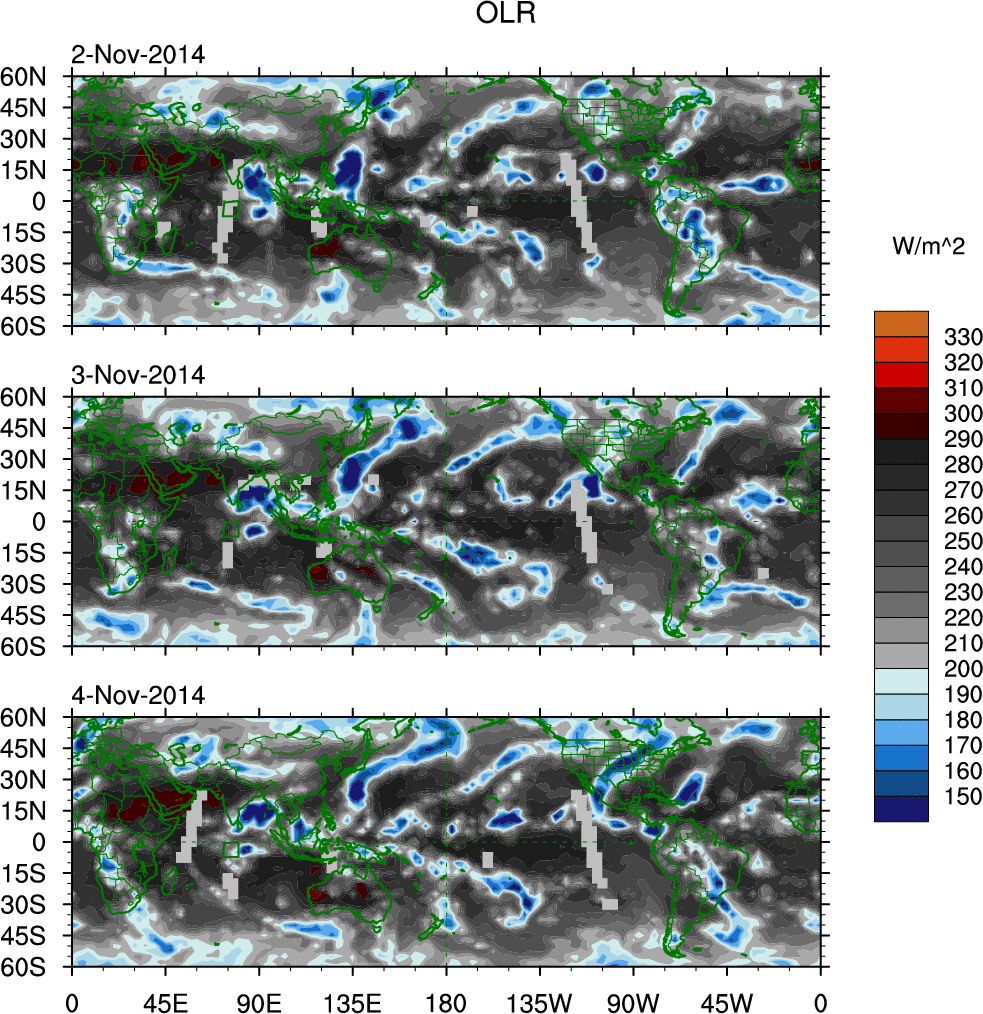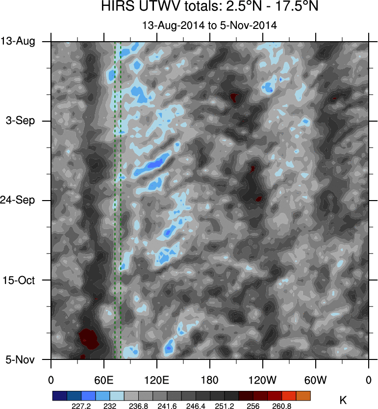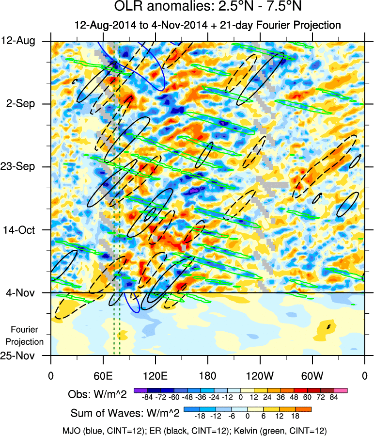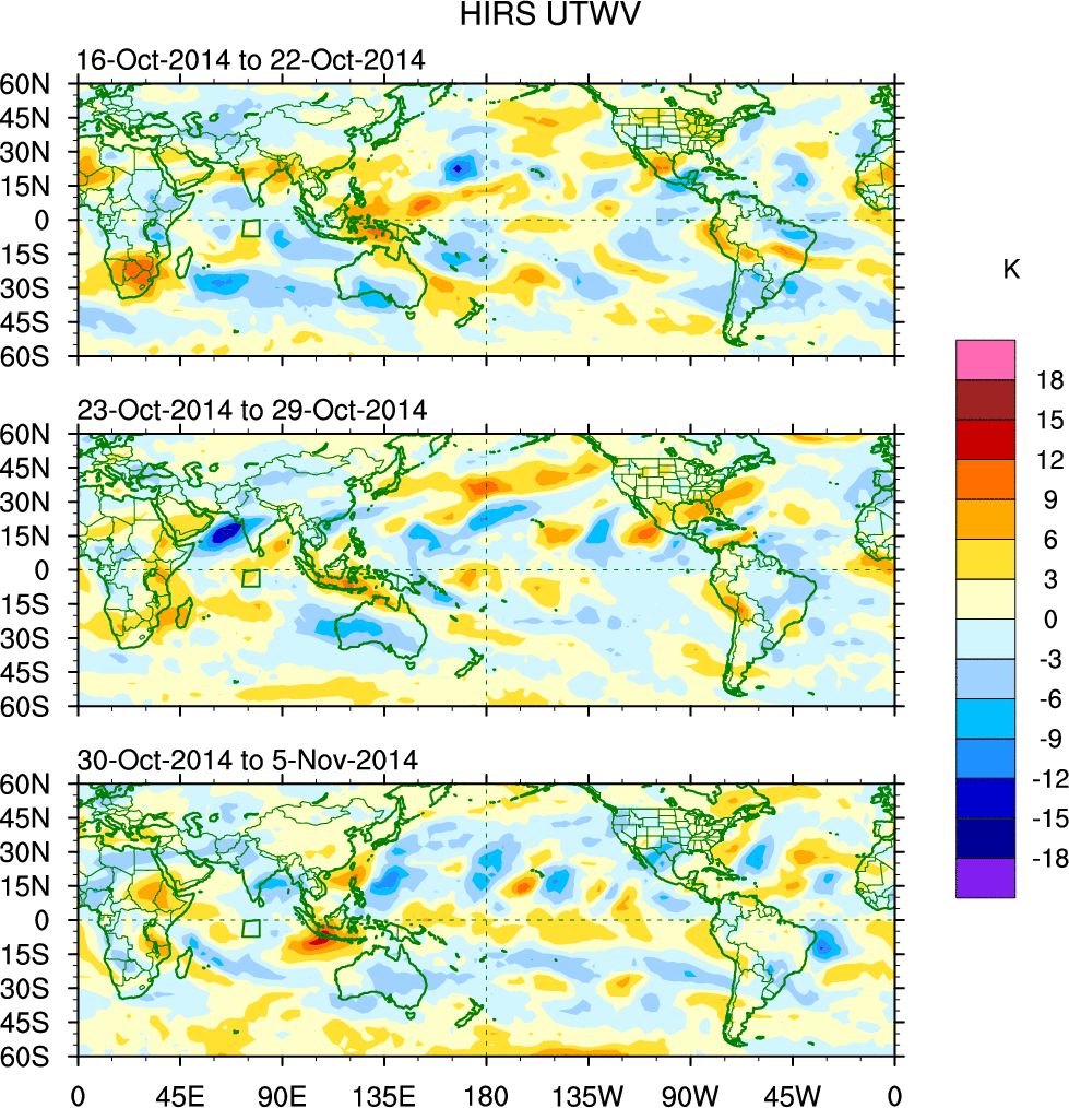 To identify tropical waves in near real-time, the OLR and UTWV data are filtered following Wheeler & Weickmann (2001 MWR). The daily anomalies are calculated using the first 3 harmonics of the seasonal cycle for 1979–2009. Missing values are then filled using linear interpolation in space and time. The most recent 365 days of anomalies are padded with 659 days of zeroes, and the result is filtered for each wave type.