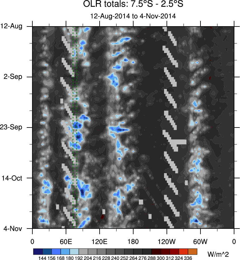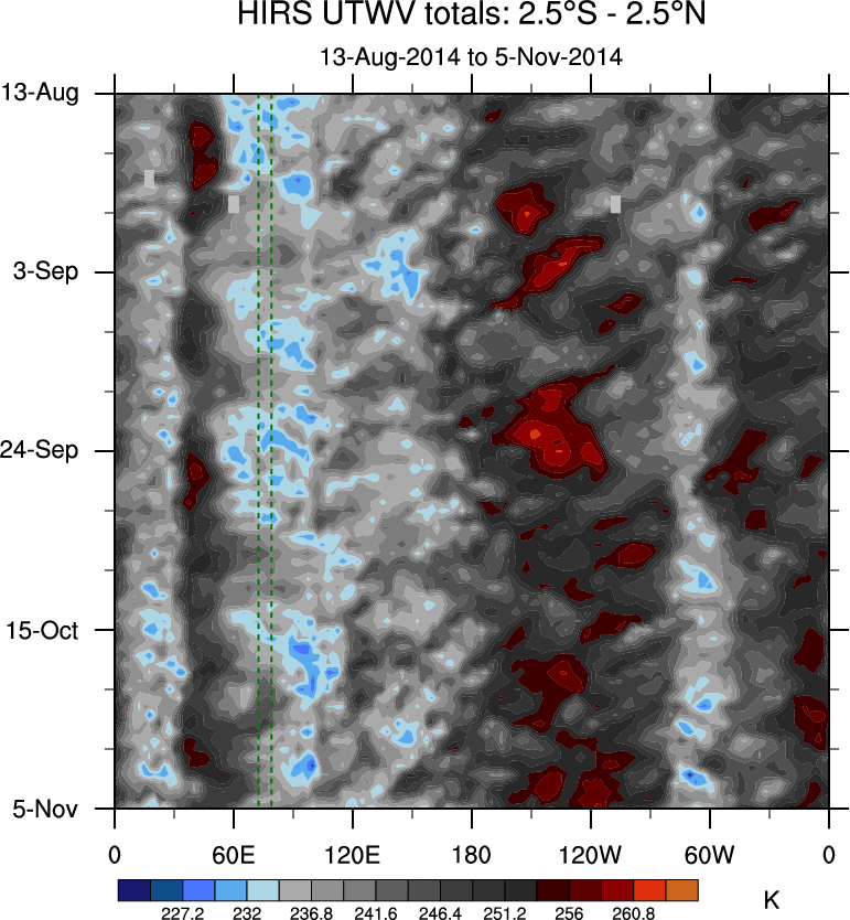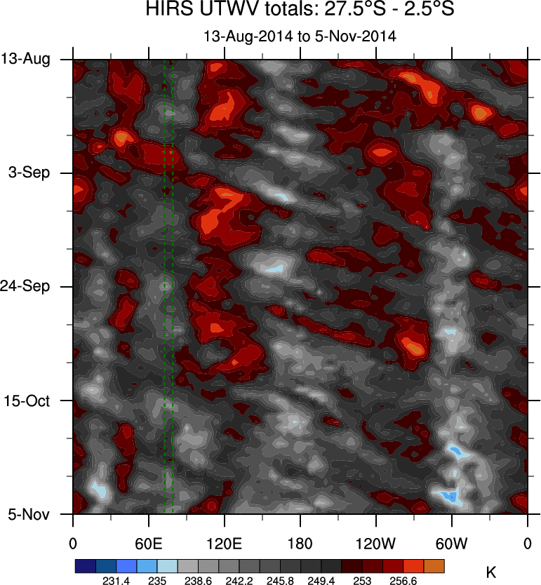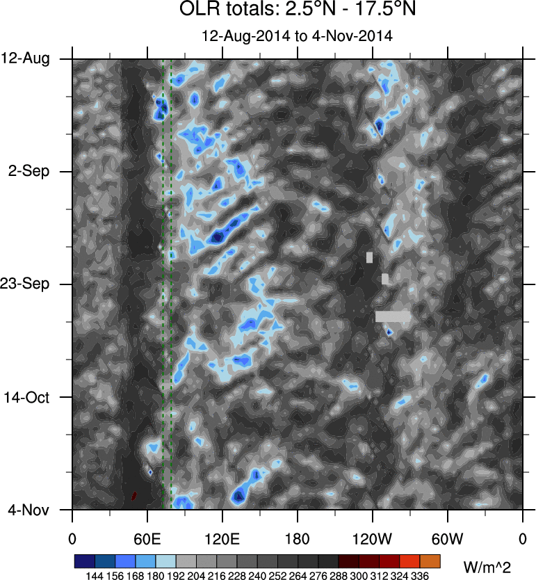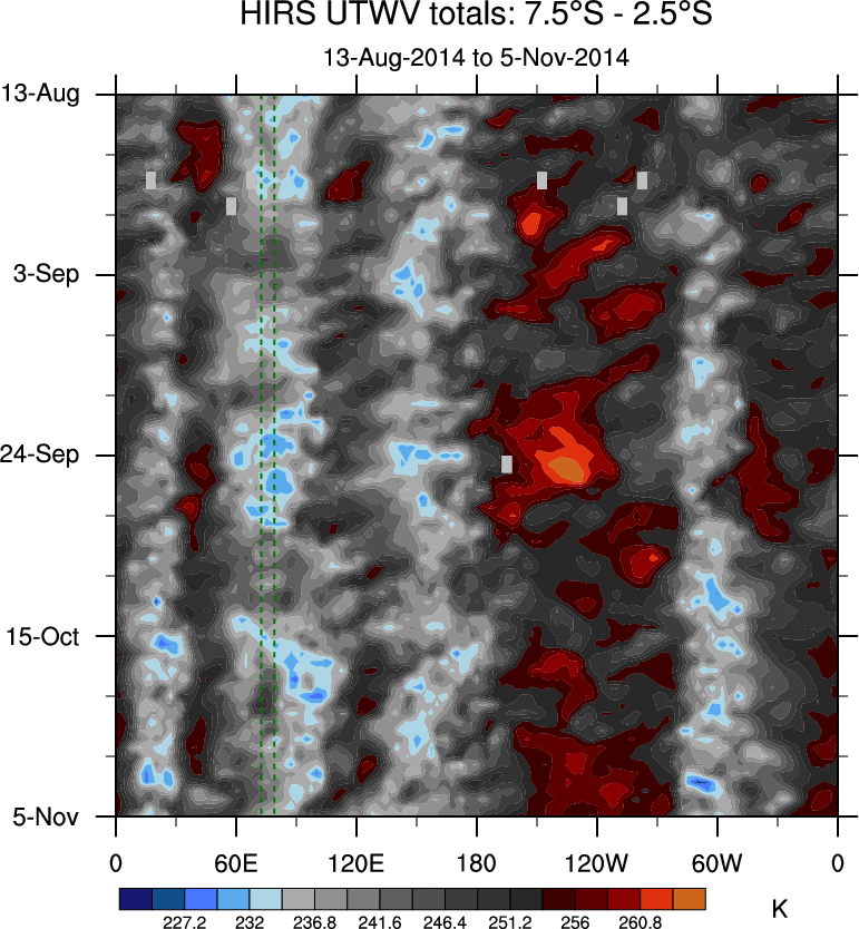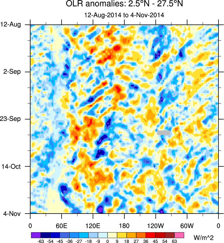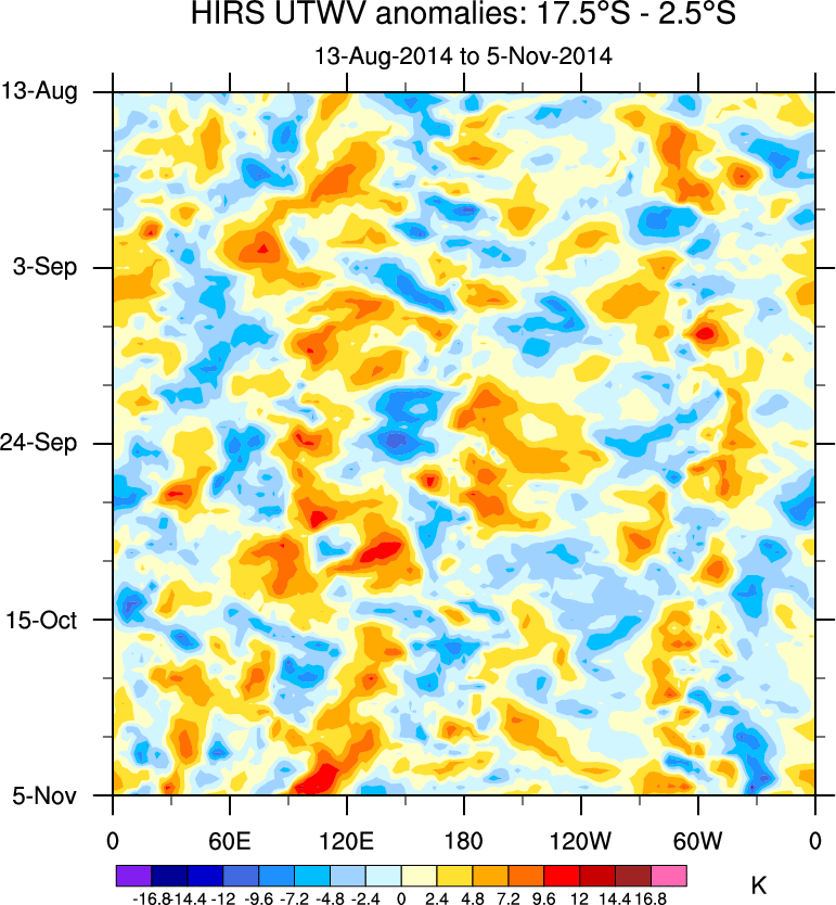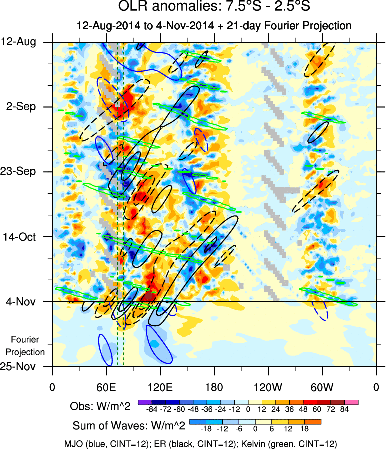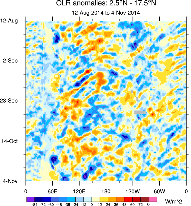 To identify tropical waves in near real-time, the OLR and UTWV data are filtered following Wheeler & Weickmann (2001 MWR). The daily anomalies are calculated using the first 3 harmonics of the seasonal cycle for 1979–2009. Missing values are then filled using linear interpolation in space and time. The most recent 365 days of anomalies are padded with 659 days of zeroes, and the result is filtered for each wave type.