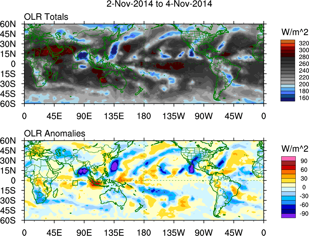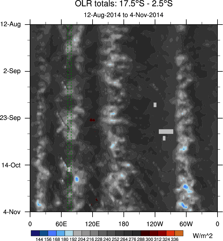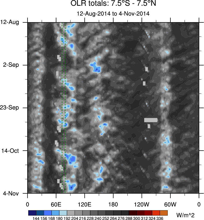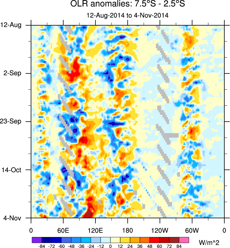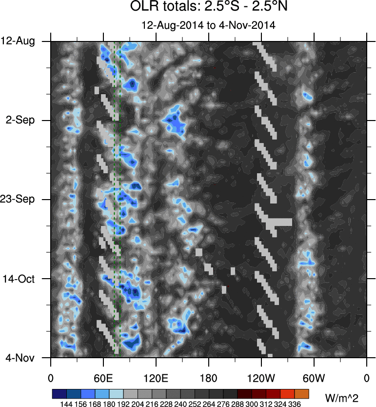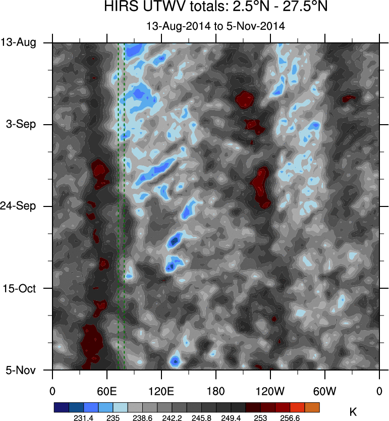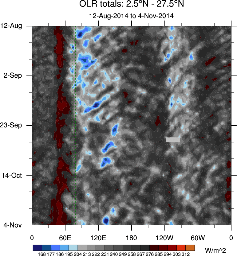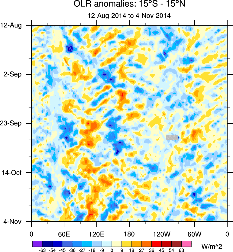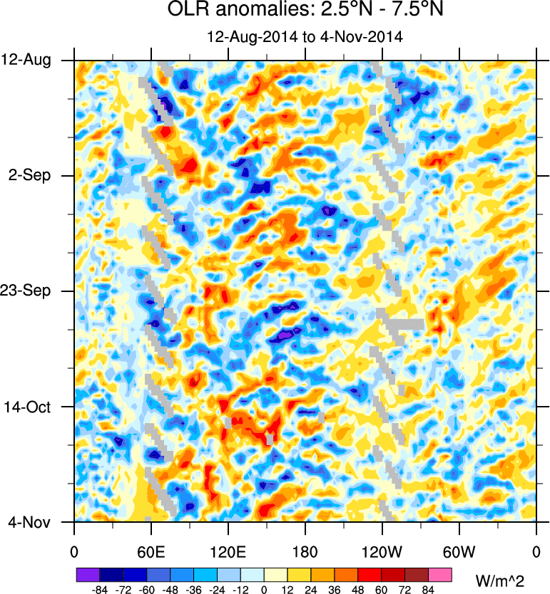 To identify tropical waves in near real-time, the OLR and UTWV data are filtered following Wheeler & Weickmann (2001 MWR). The daily anomalies are calculated using the first 3 harmonics of the seasonal cycle for 1979–2009. Missing values are then filled using linear interpolation in space and time. The most recent 365 days of anomalies are padded with 659 days of zeroes, and the result is filtered for each wave type.