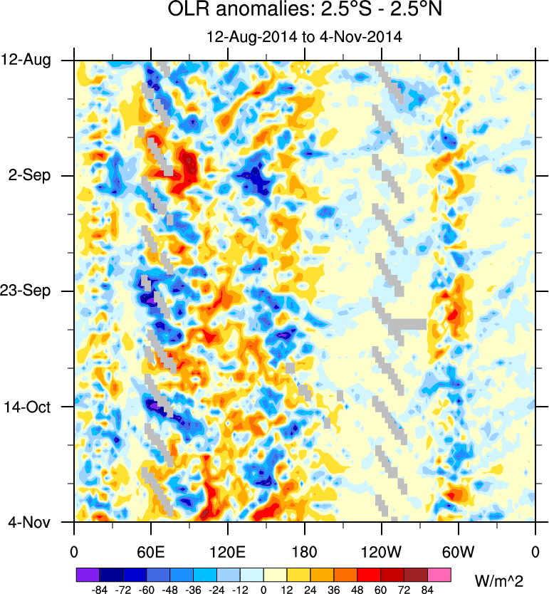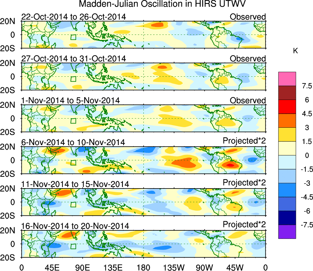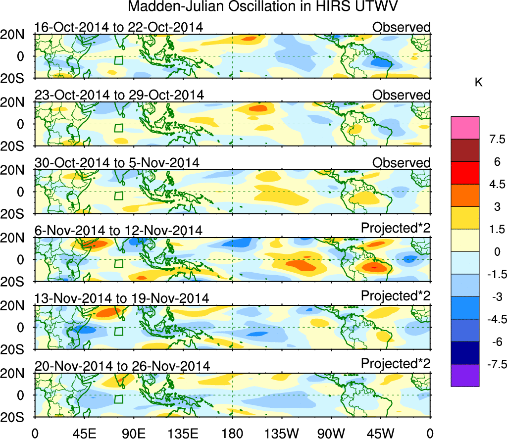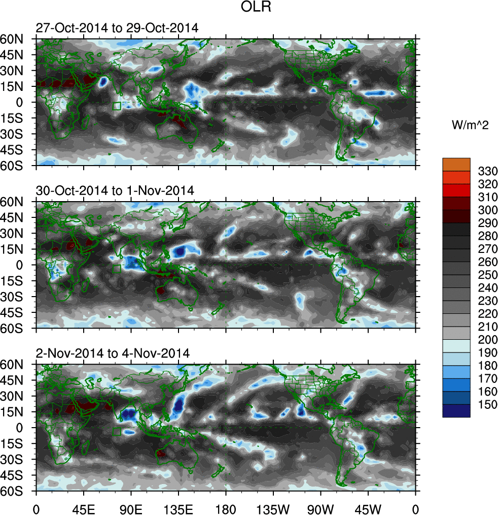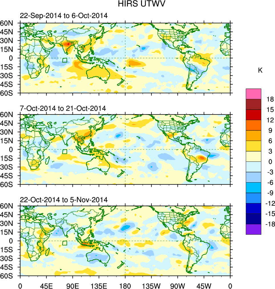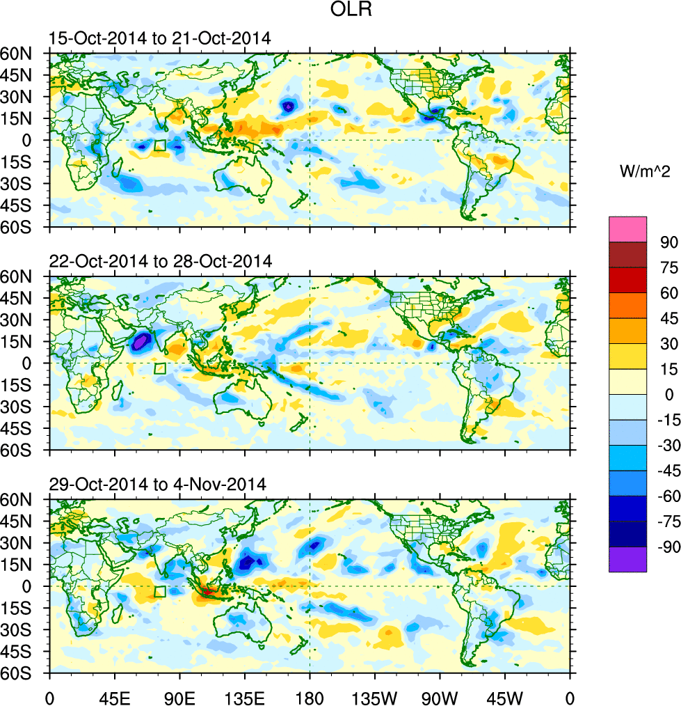 To identify tropical waves in near real-time, the OLR and UTWV data are filtered following Wheeler & Weickmann (2001 MWR). The daily anomalies are calculated using the first 3 harmonics of the seasonal cycle for 1979–2009. Missing values are then filled using linear interpolation in space and time. The most recent 365 days of anomalies are padded with 659 days of zeroes, and the result is filtered for each wave type.