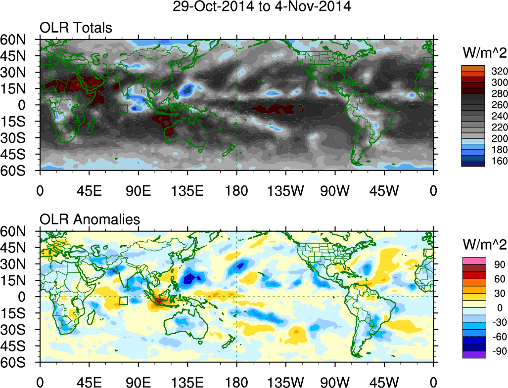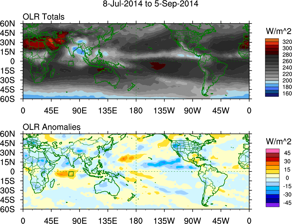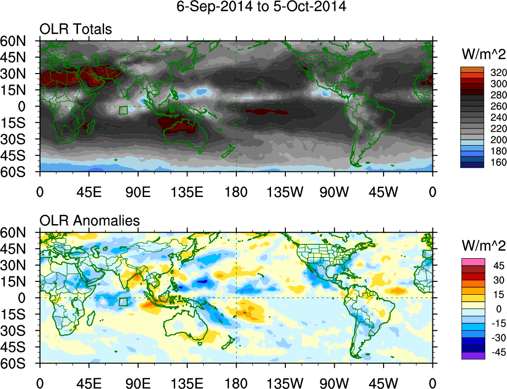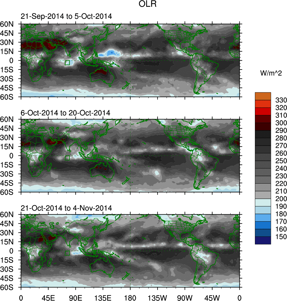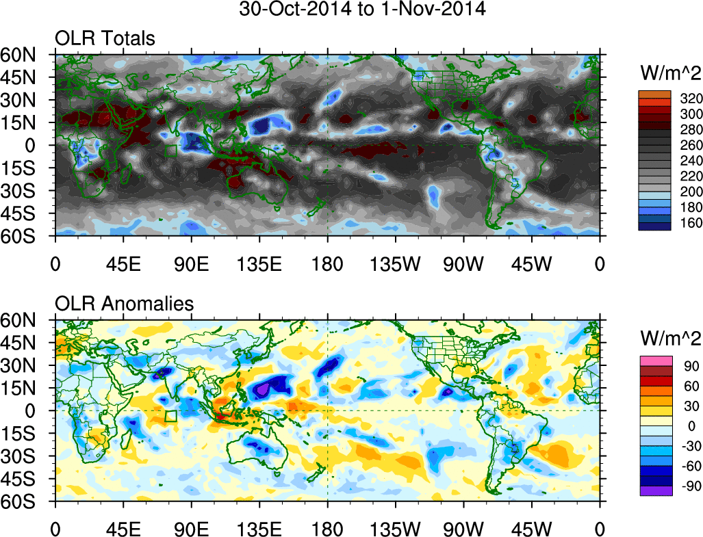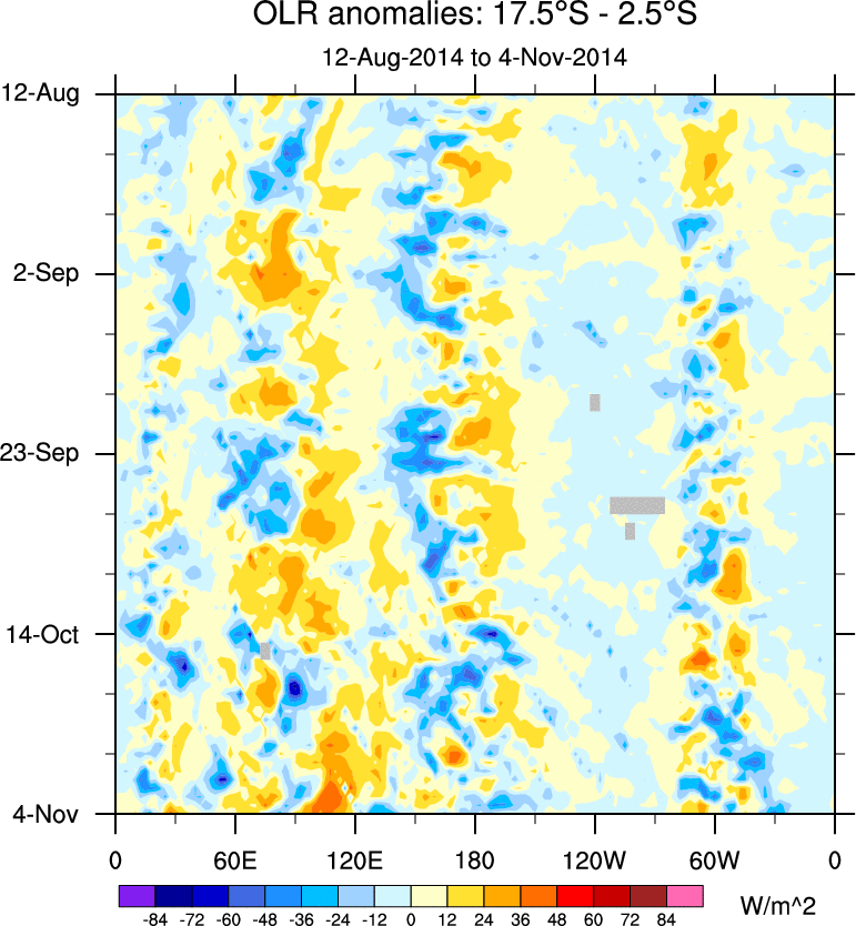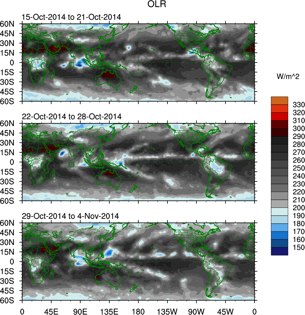To identify tropical waves in near real-time, the OLR and UTWV data are filtered following Wheeler & Weickmann (2001 MWR). The daily anomalies are calculated using the first 3 harmonics of the seasonal cycle for 1979–2009. Missing values are then filled using linear interpolation in space and time. The most recent 365 days of anomalies are padded with 659 days of zeroes, and the result is filtered for each wave type.