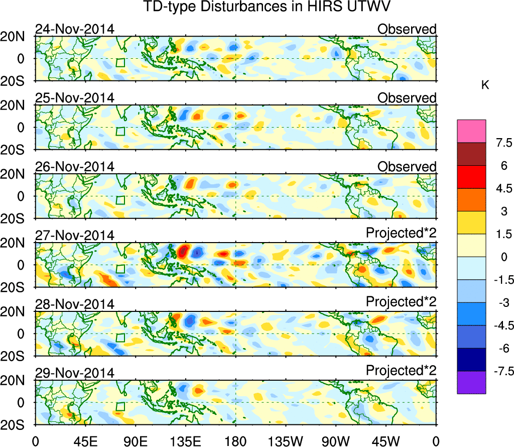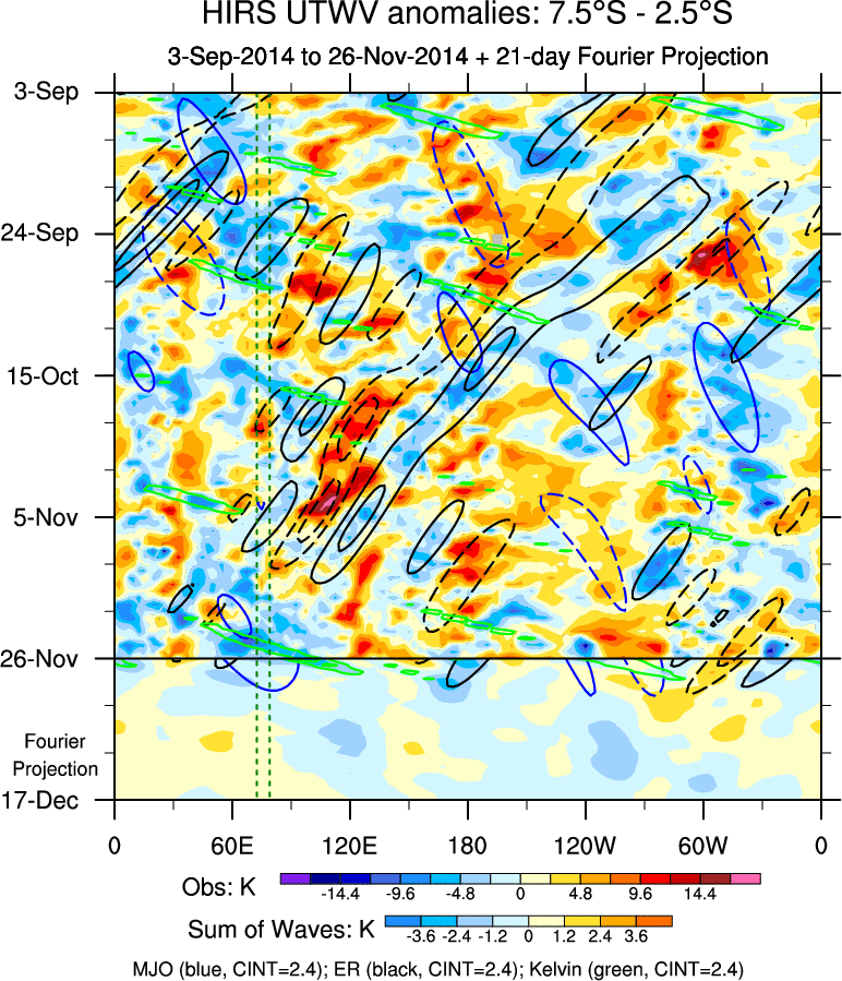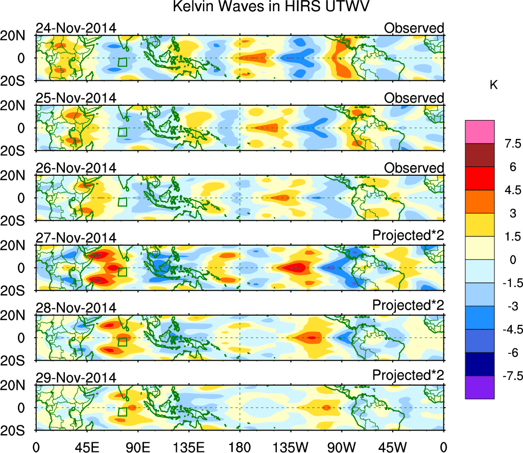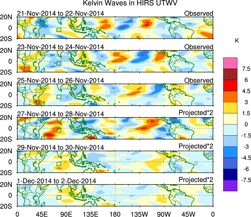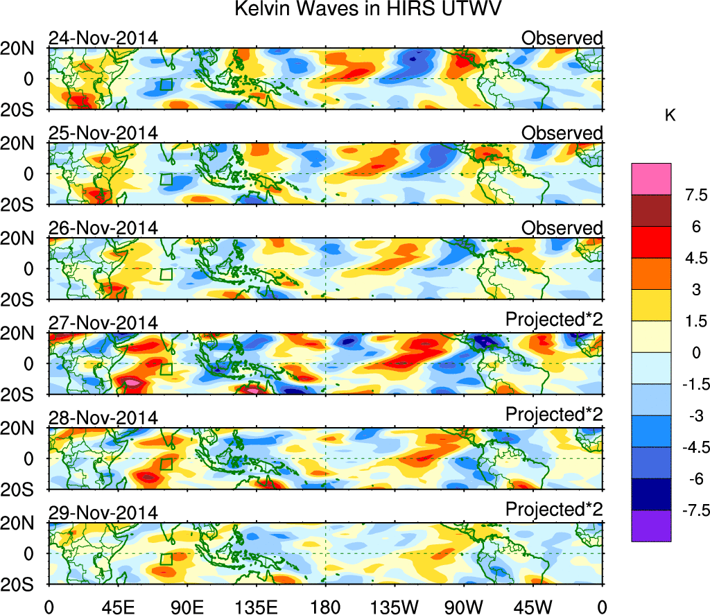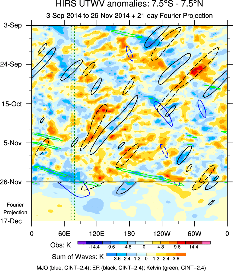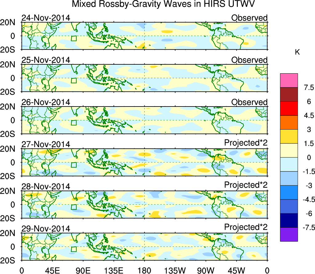 To identify tropical waves in near real-time, the OLR and UTWV data are filtered following Wheeler & Weickmann (2001 MWR). The daily anomalies are calculated using the first 3 harmonics of the seasonal cycle for 1979–2009. Missing values are then filled using linear interpolation in space and time. The most recent 365 days of anomalies are padded with 659 days of zeroes, and the result is filtered for each wave type.