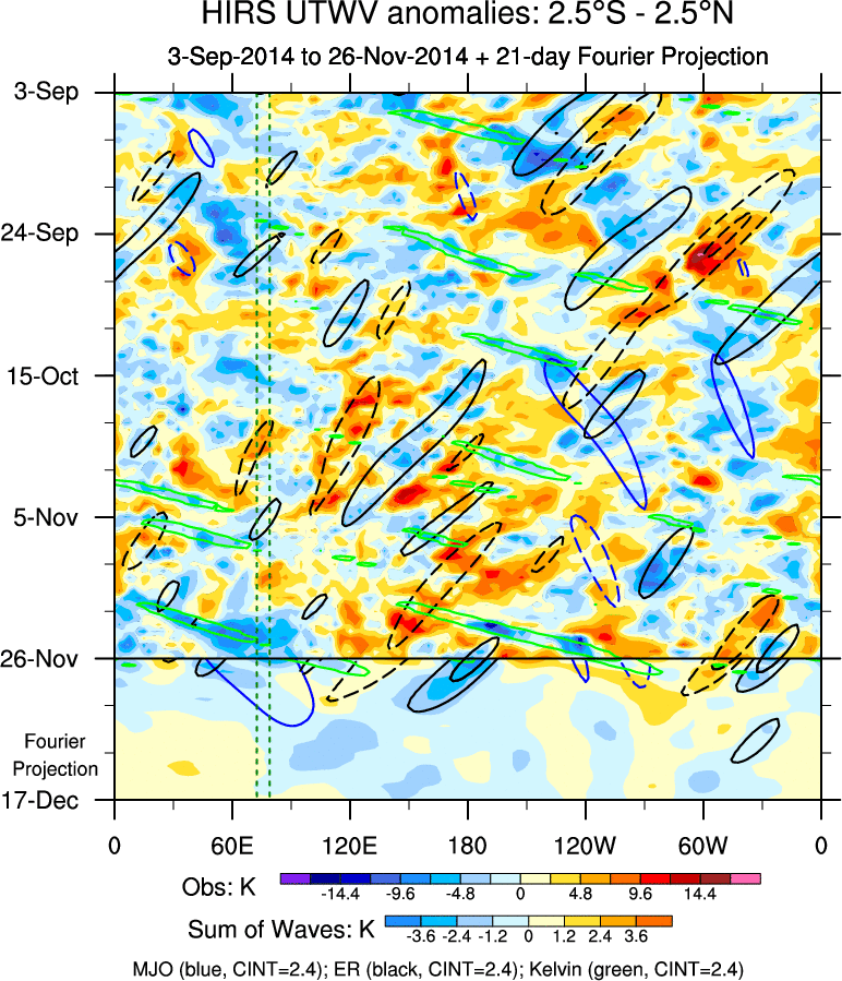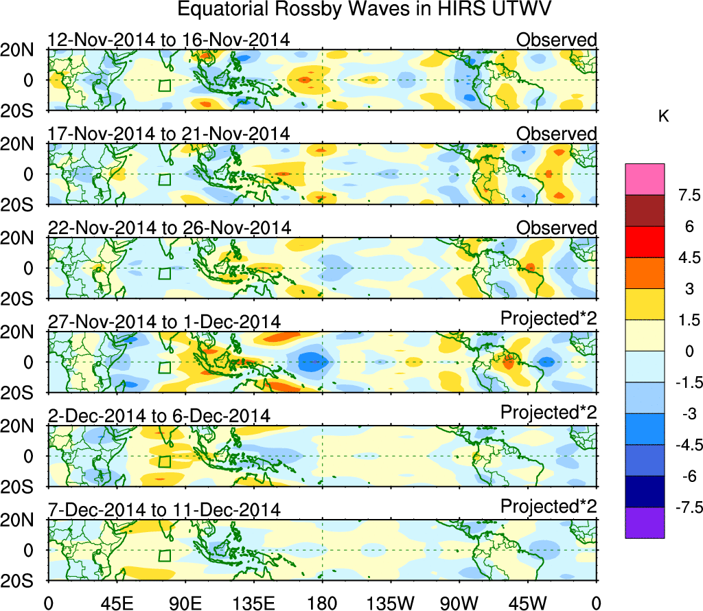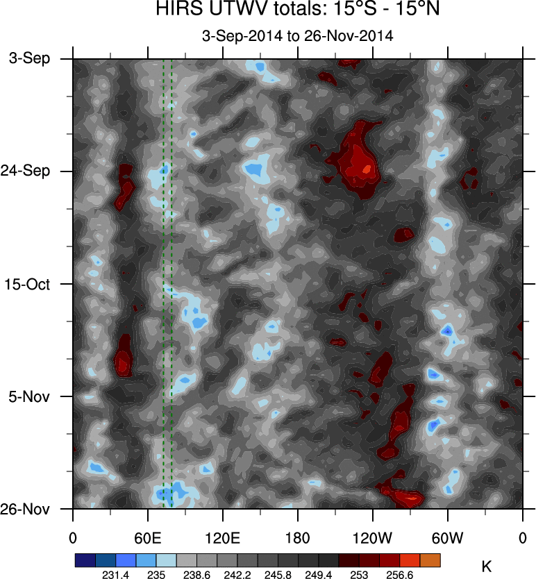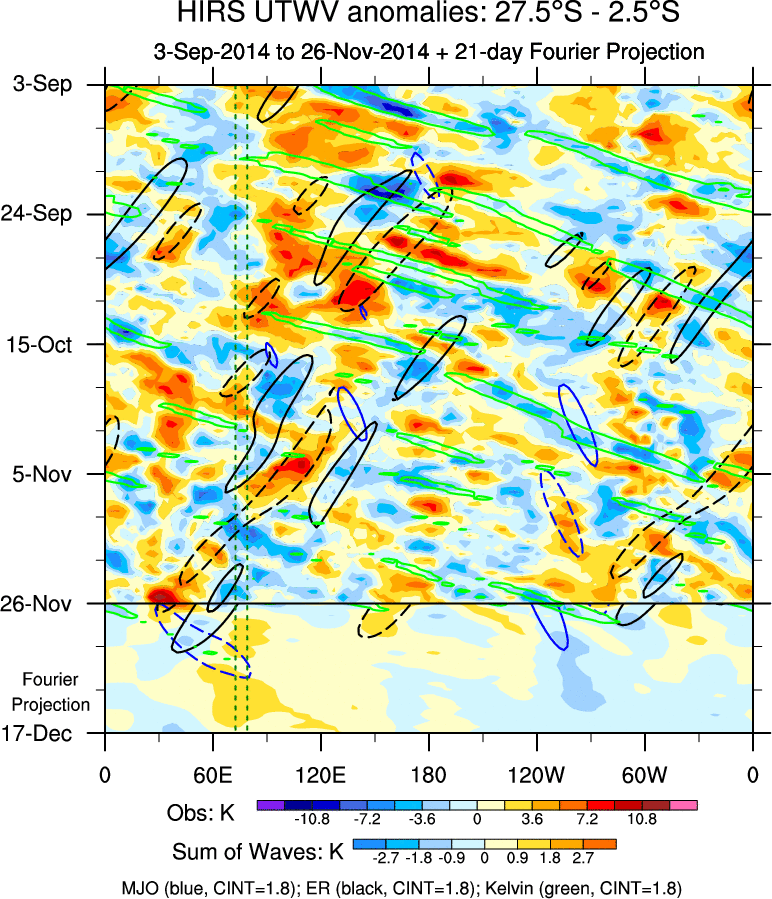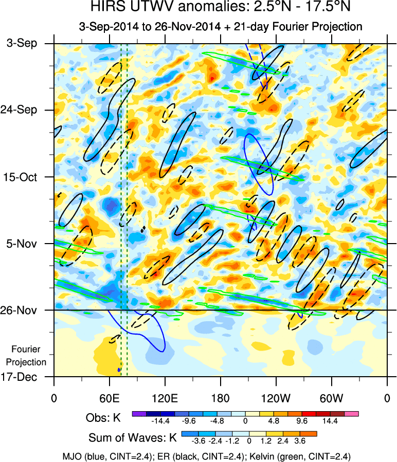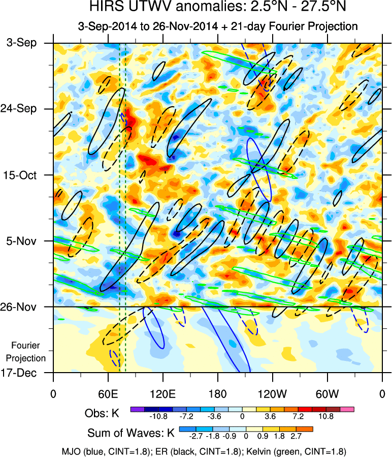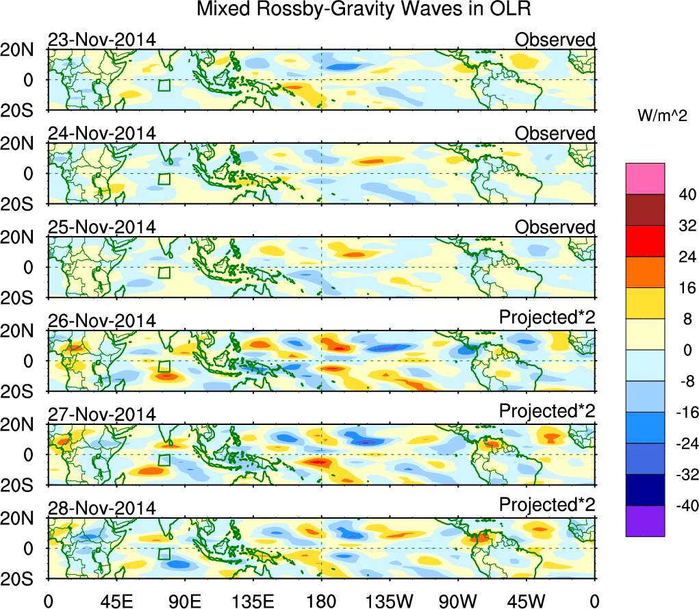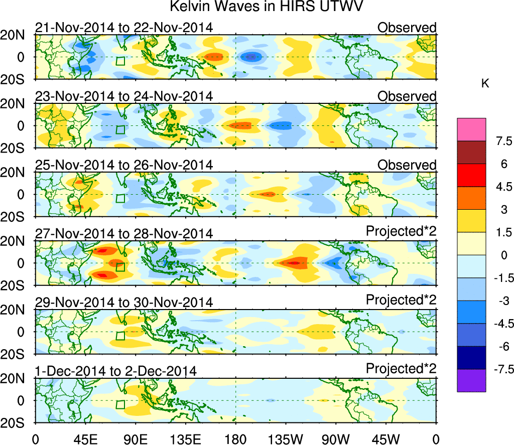 To identify tropical waves in near real-time, the OLR and UTWV data are filtered following Wheeler & Weickmann (2001 MWR). The daily anomalies are calculated using the first 3 harmonics of the seasonal cycle for 1979–2009. Missing values are then filled using linear interpolation in space and time. The most recent 365 days of anomalies are padded with 659 days of zeroes, and the result is filtered for each wave type.