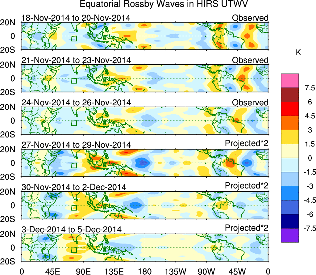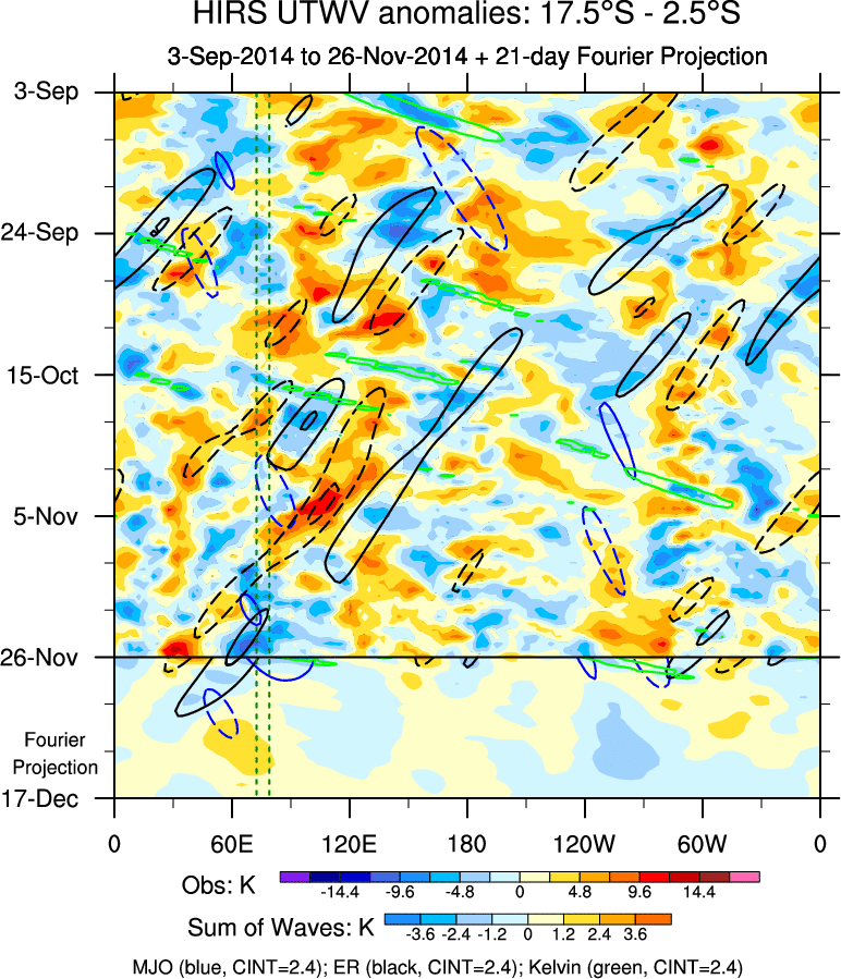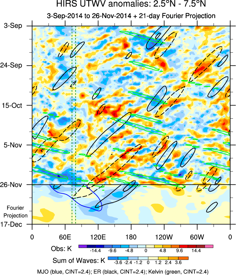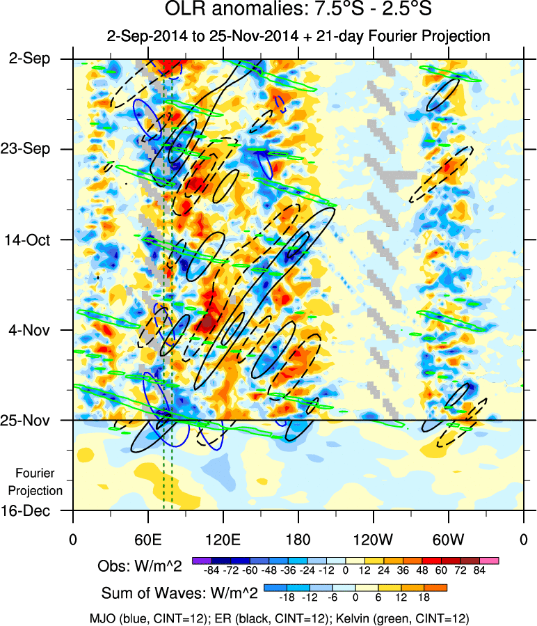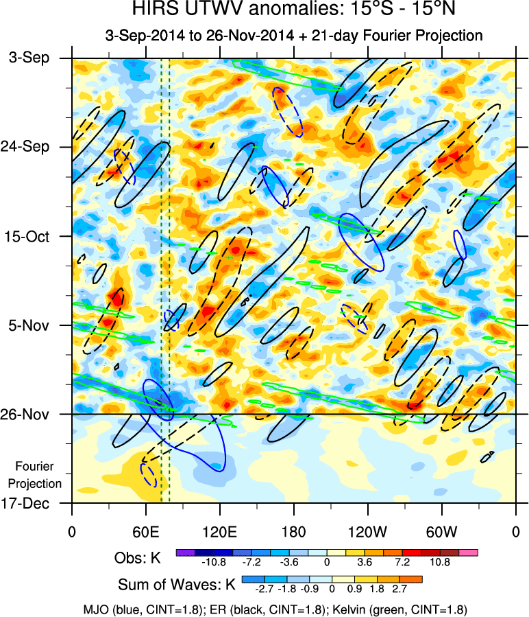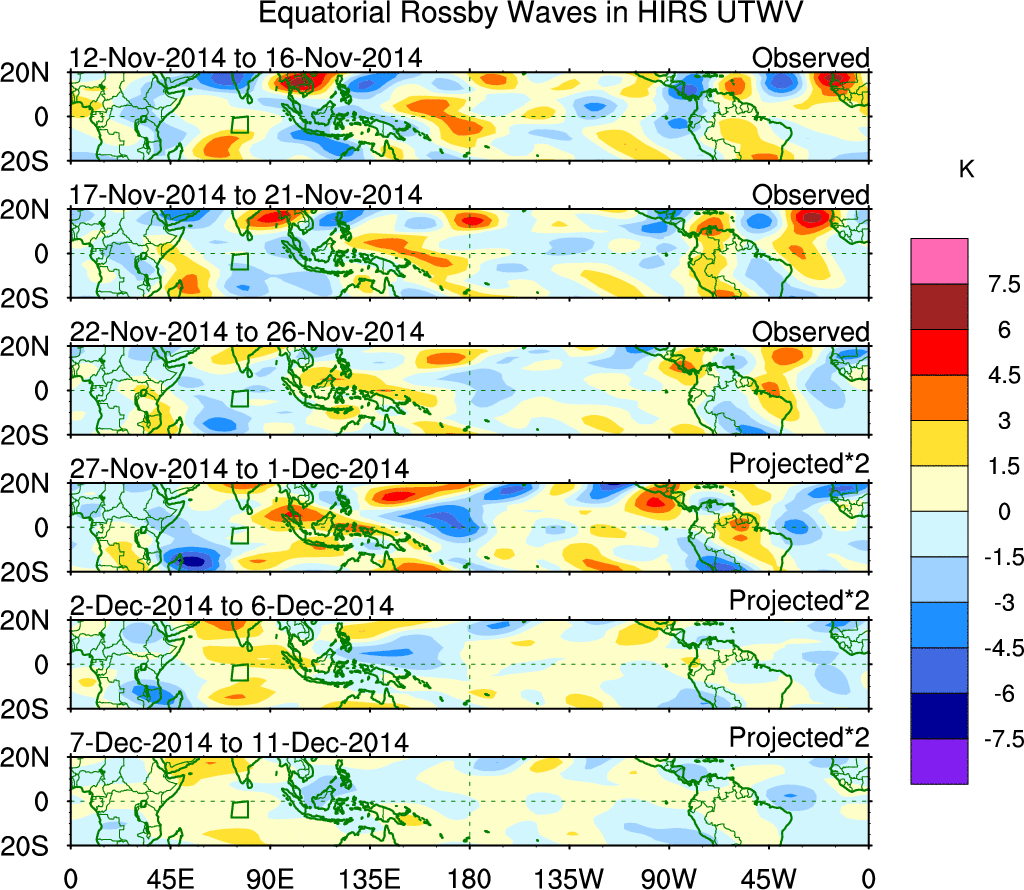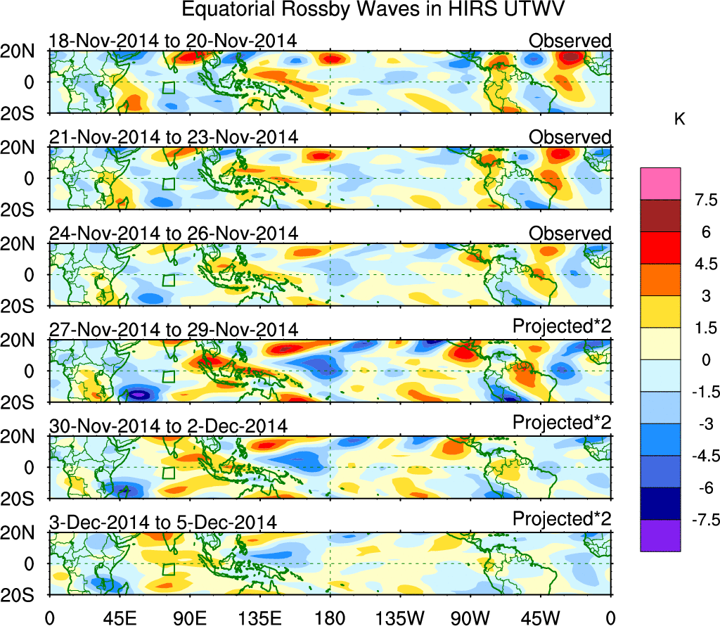 To identify tropical waves in near real-time, the OLR and UTWV data are filtered following Wheeler & Weickmann (2001 MWR). The daily anomalies are calculated using the first 3 harmonics of the seasonal cycle for 1979–2009. Missing values are then filled using linear interpolation in space and time. The most recent 365 days of anomalies are padded with 659 days of zeroes, and the result is filtered for each wave type.