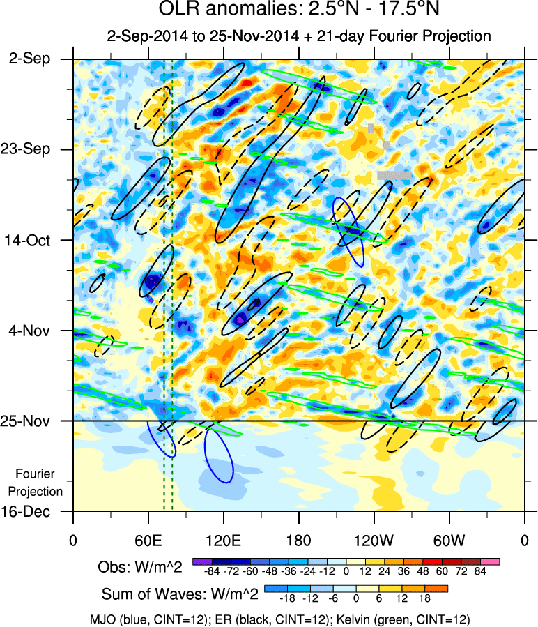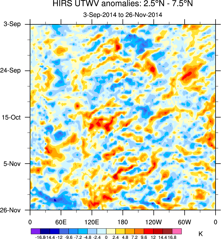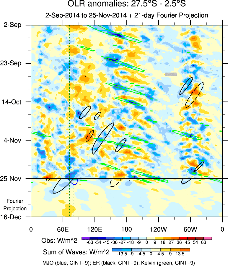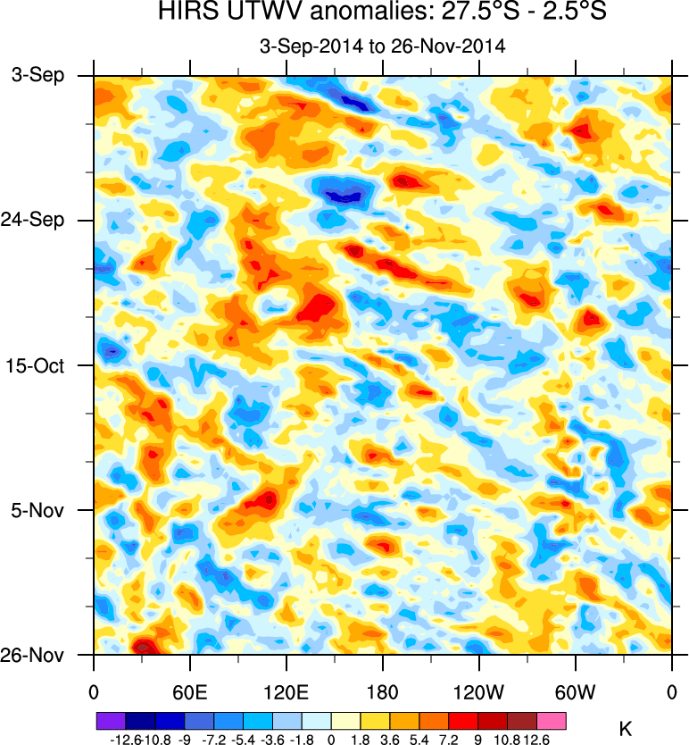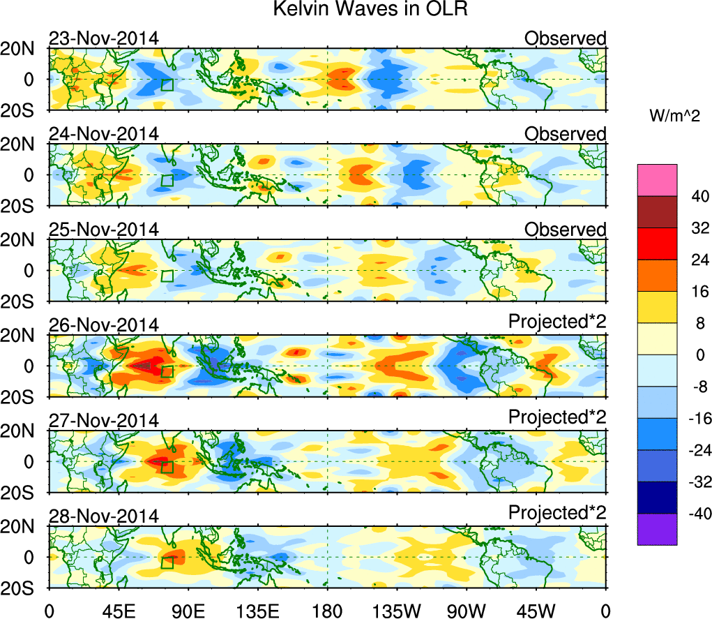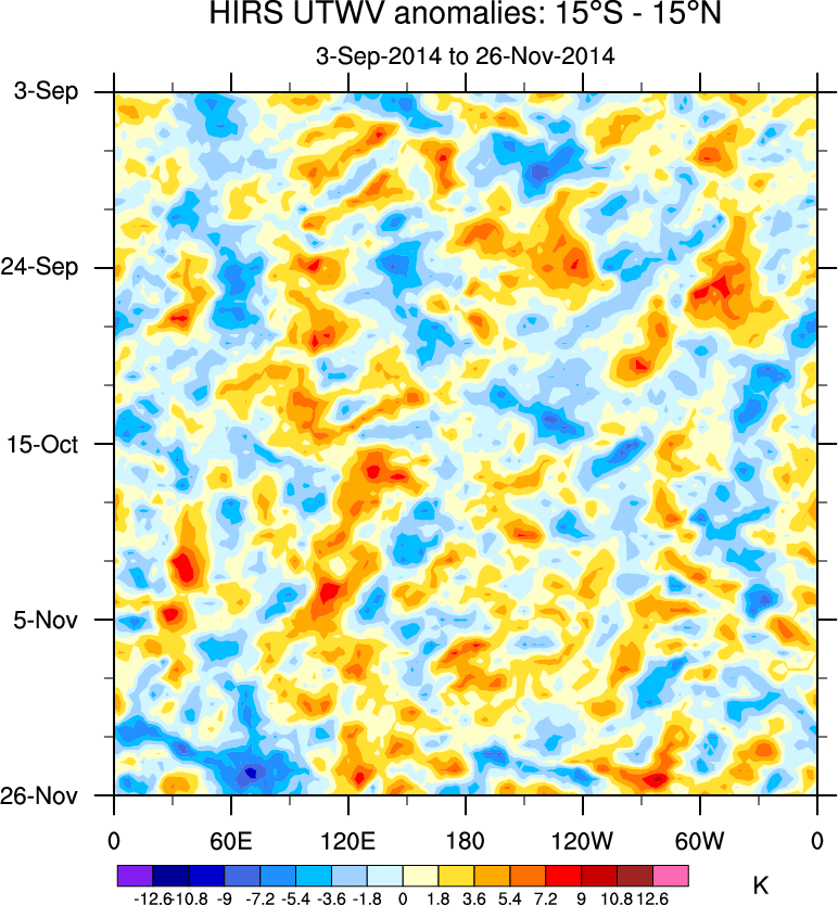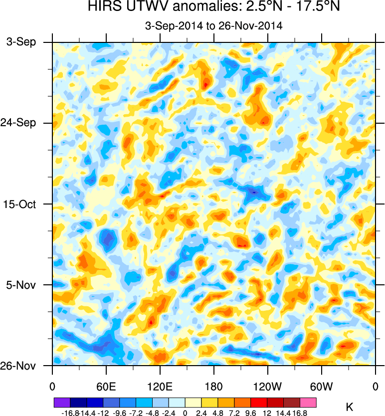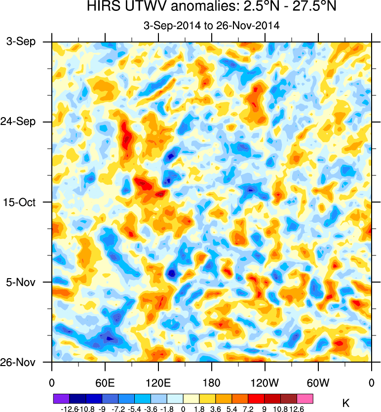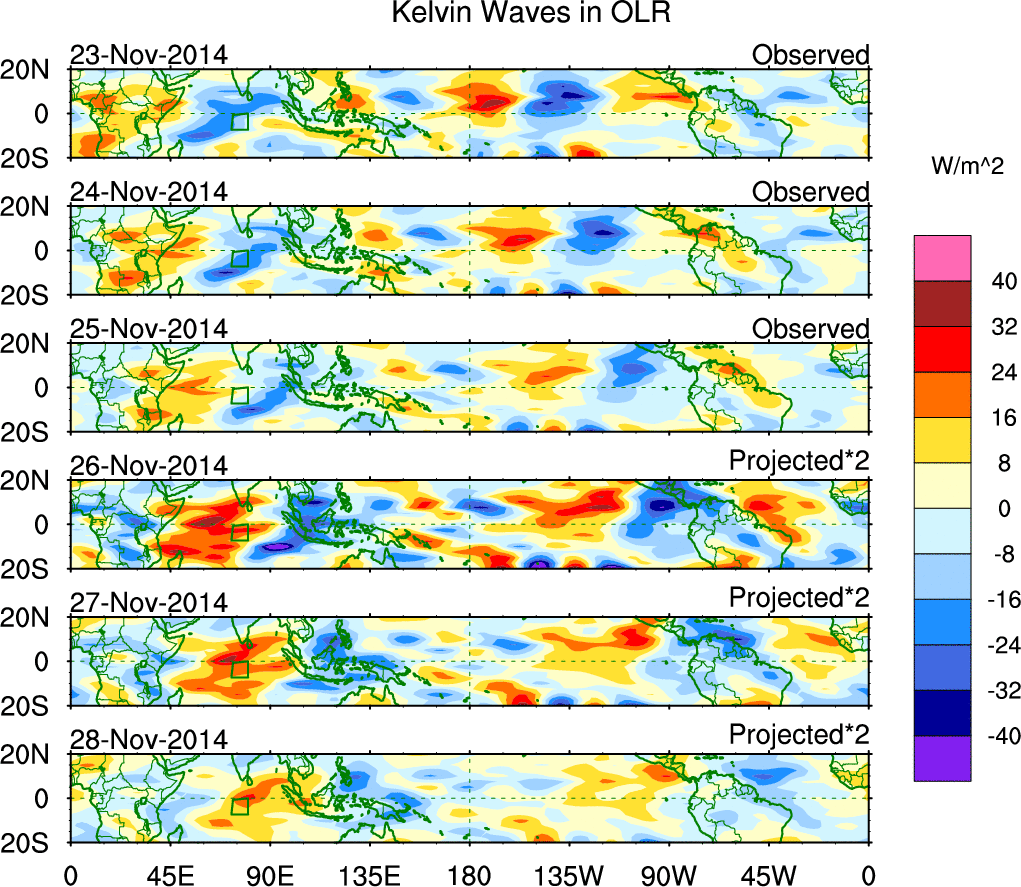 To identify tropical waves in near real-time, the OLR and UTWV data are filtered following Wheeler & Weickmann (2001 MWR). The daily anomalies are calculated using the first 3 harmonics of the seasonal cycle for 1979–2009. Missing values are then filled using linear interpolation in space and time. The most recent 365 days of anomalies are padded with 659 days of zeroes, and the result is filtered for each wave type.