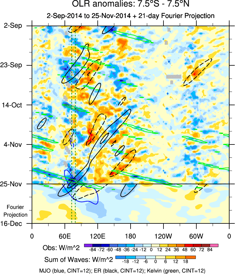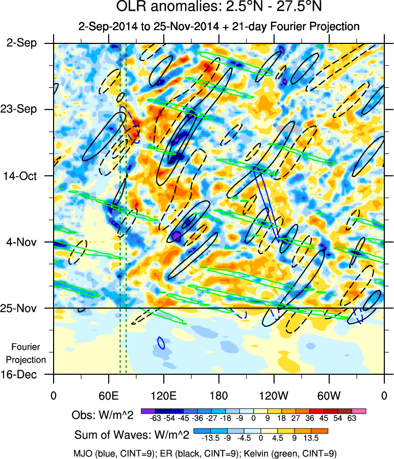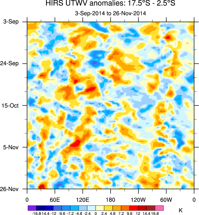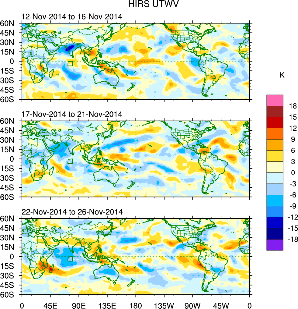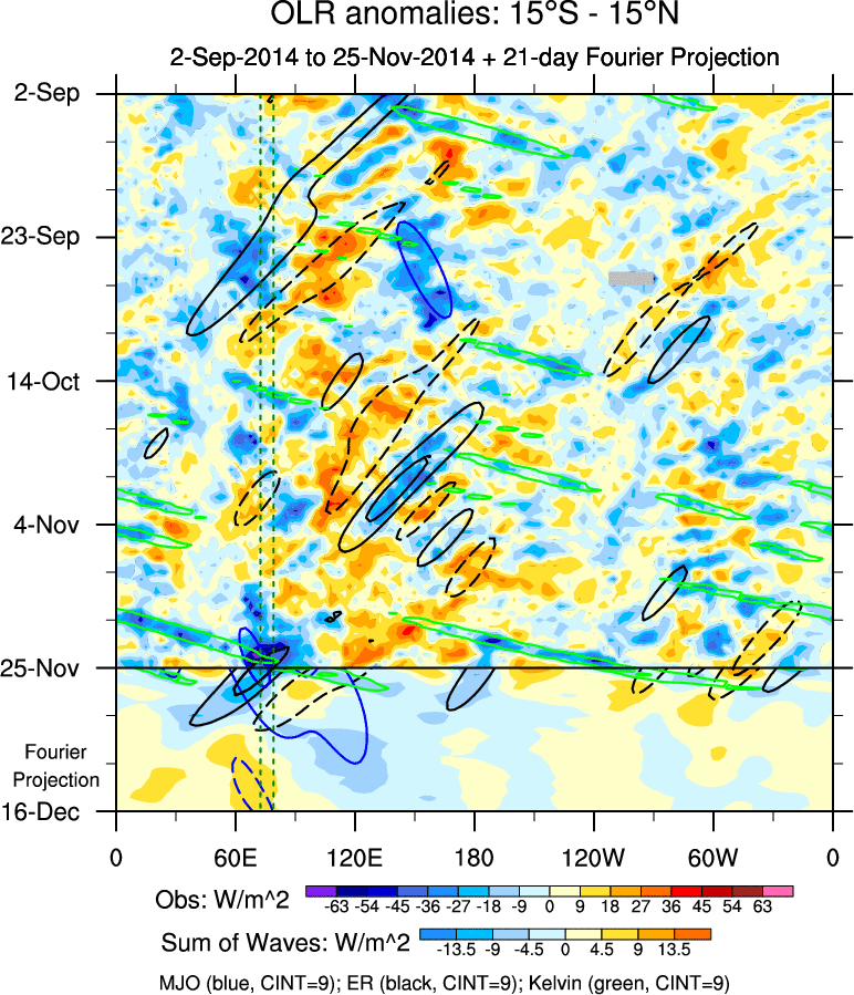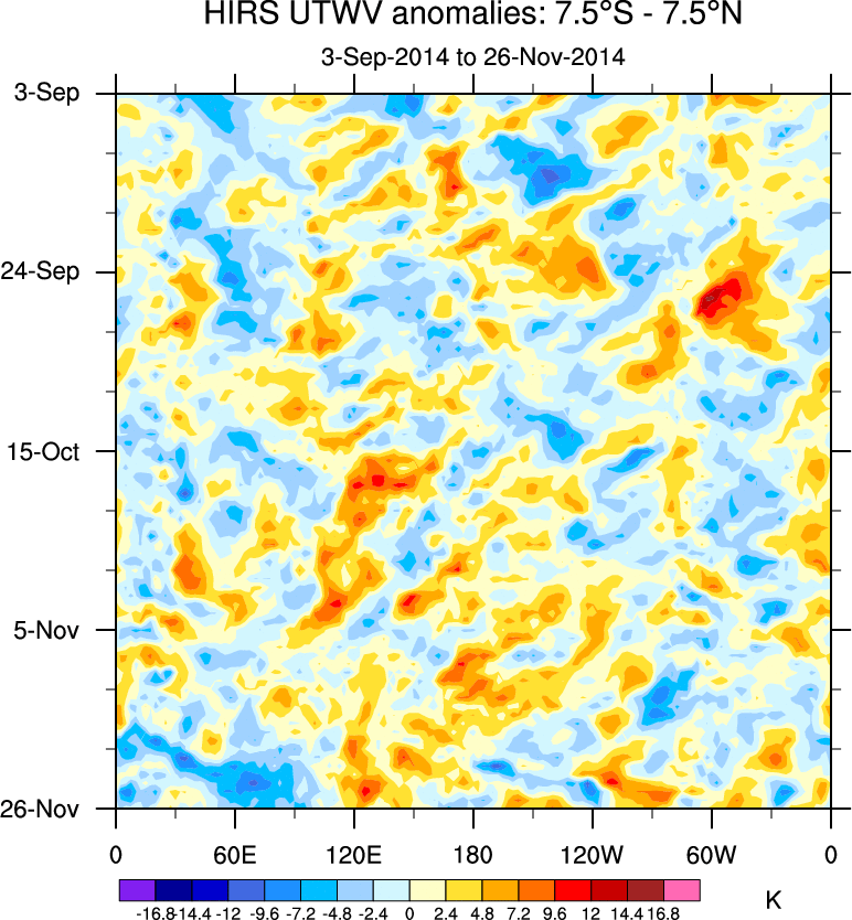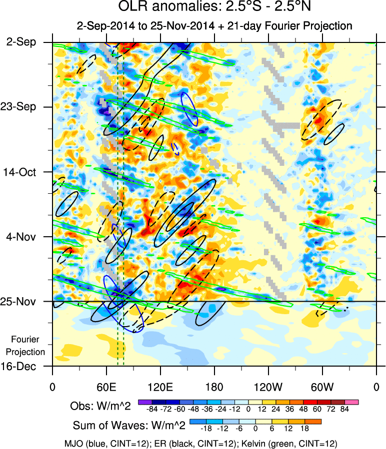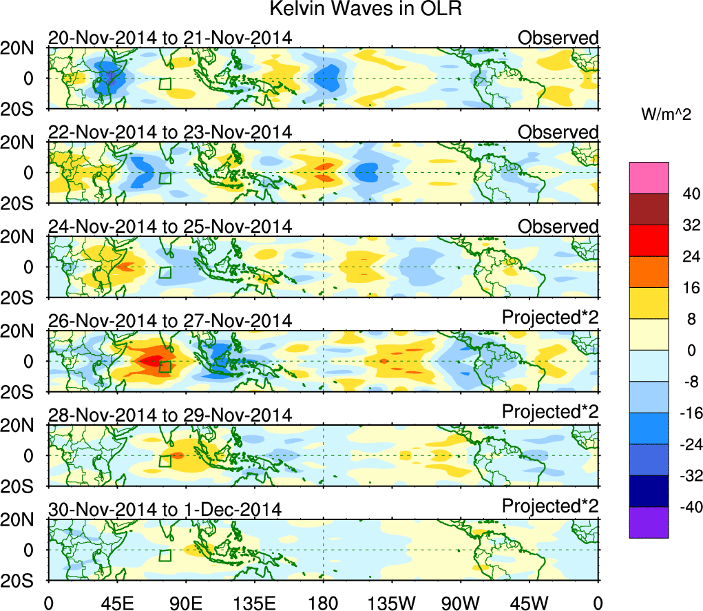 To identify tropical waves in near real-time, the OLR and UTWV data are filtered following Wheeler & Weickmann (2001 MWR). The daily anomalies are calculated using the first 3 harmonics of the seasonal cycle for 1979–2009. Missing values are then filled using linear interpolation in space and time. The most recent 365 days of anomalies are padded with 659 days of zeroes, and the result is filtered for each wave type.