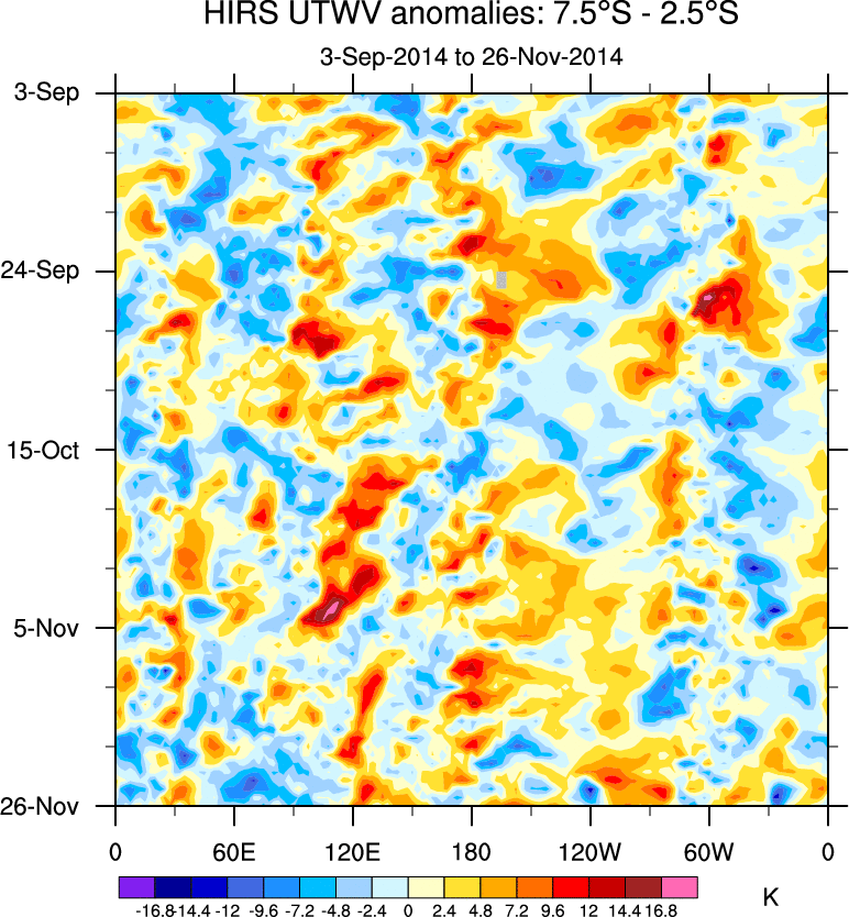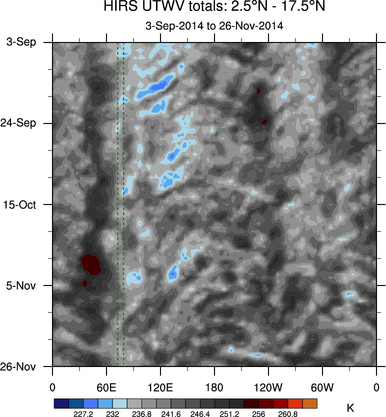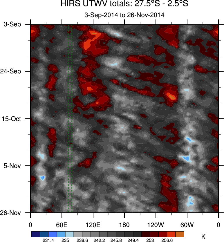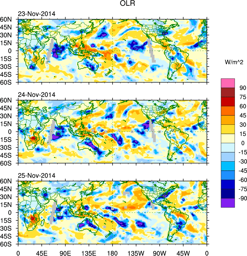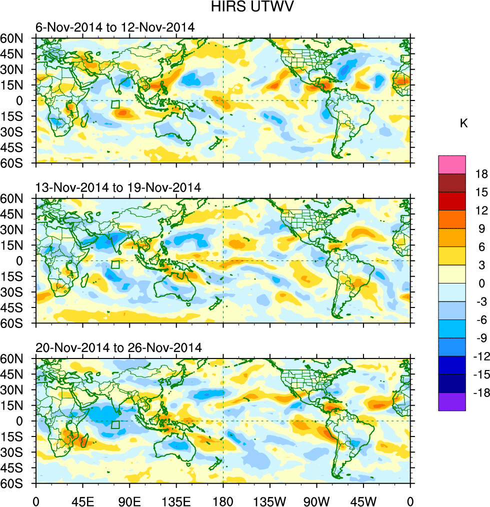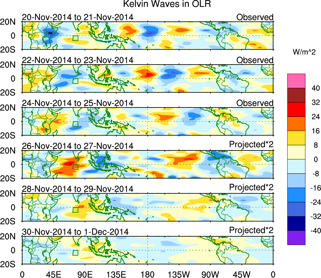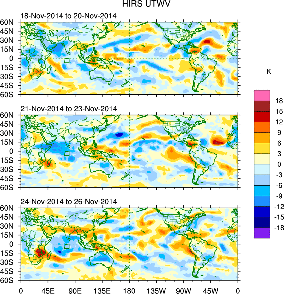 To identify tropical waves in near real-time, the OLR and UTWV data are filtered following Wheeler & Weickmann (2001 MWR). The daily anomalies are calculated using the first 3 harmonics of the seasonal cycle for 1979–2009. Missing values are then filled using linear interpolation in space and time. The most recent 365 days of anomalies are padded with 659 days of zeroes, and the result is filtered for each wave type.
