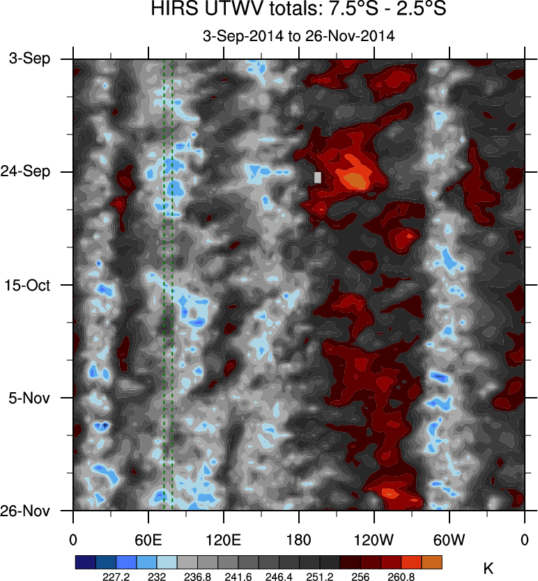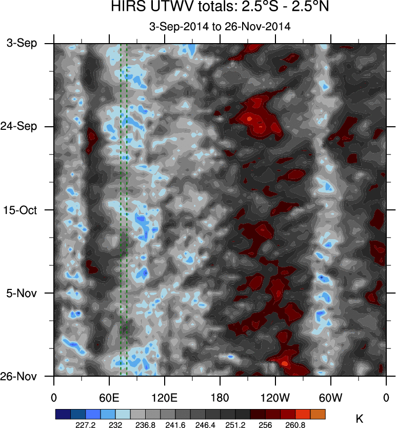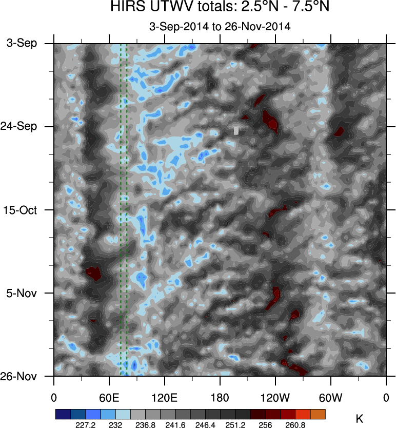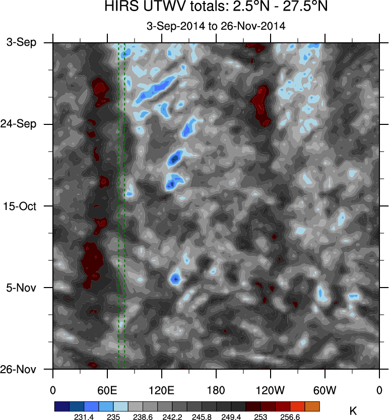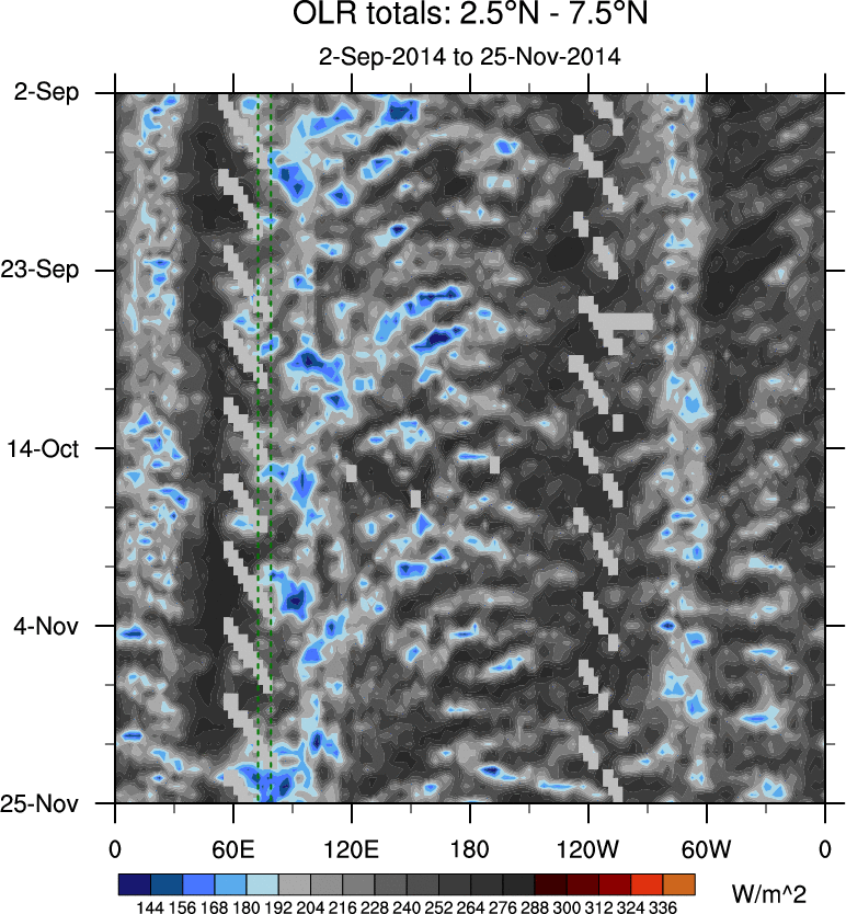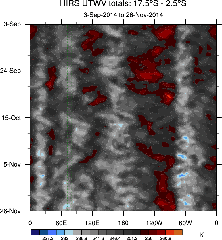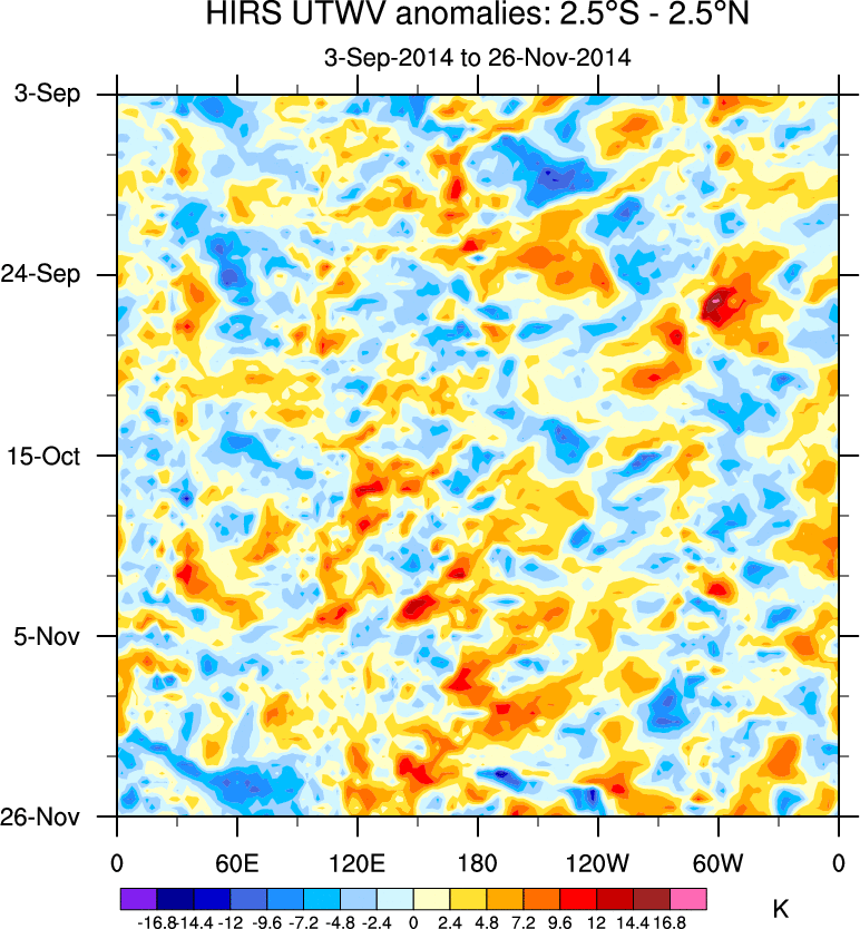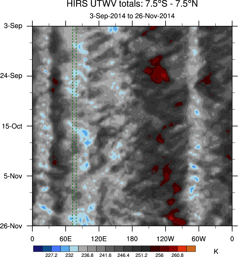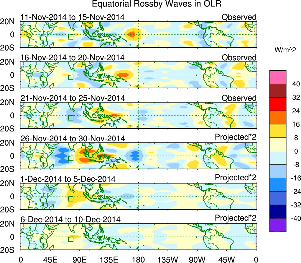 To identify tropical waves in near real-time, the OLR and UTWV data are filtered following Wheeler & Weickmann (2001 MWR). The daily anomalies are calculated using the first 3 harmonics of the seasonal cycle for 1979–2009. Missing values are then filled using linear interpolation in space and time. The most recent 365 days of anomalies are padded with 659 days of zeroes, and the result is filtered for each wave type.