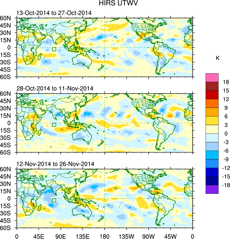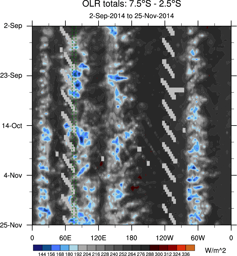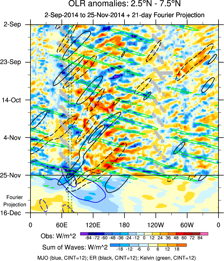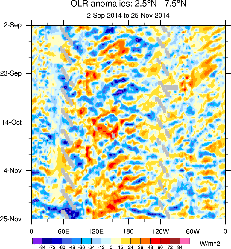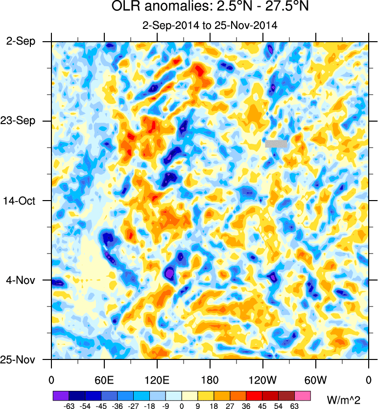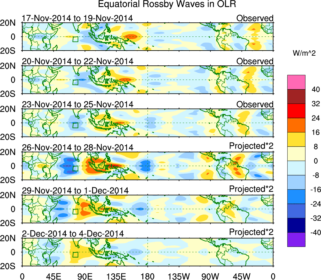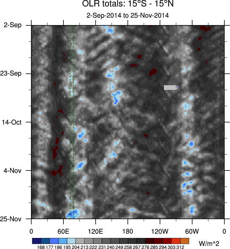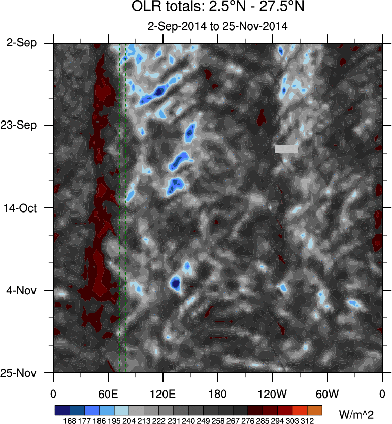 To identify tropical waves in near real-time, the OLR and UTWV data are filtered following Wheeler & Weickmann (2001 MWR). The daily anomalies are calculated using the first 3 harmonics of the seasonal cycle for 1979–2009. Missing values are then filled using linear interpolation in space and time. The most recent 365 days of anomalies are padded with 659 days of zeroes, and the result is filtered for each wave type.