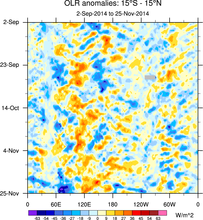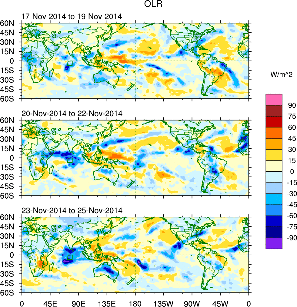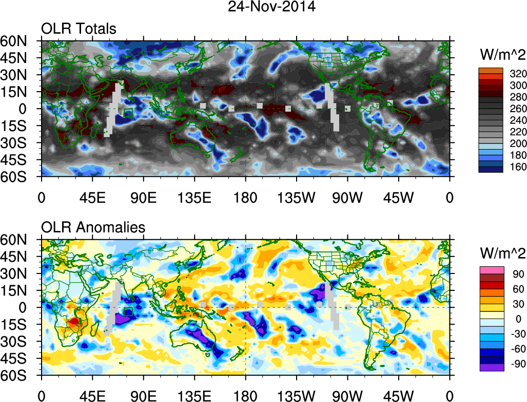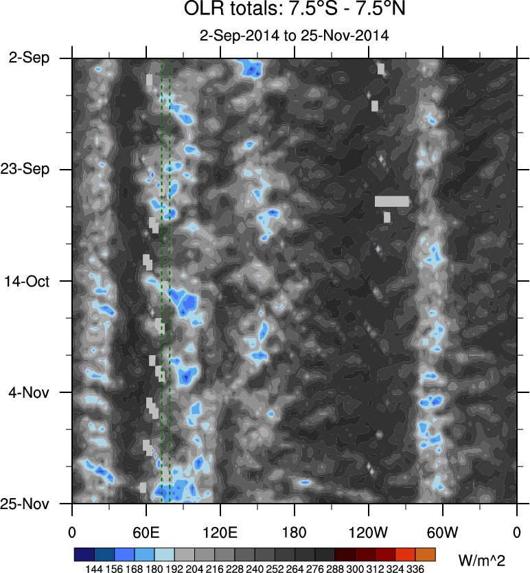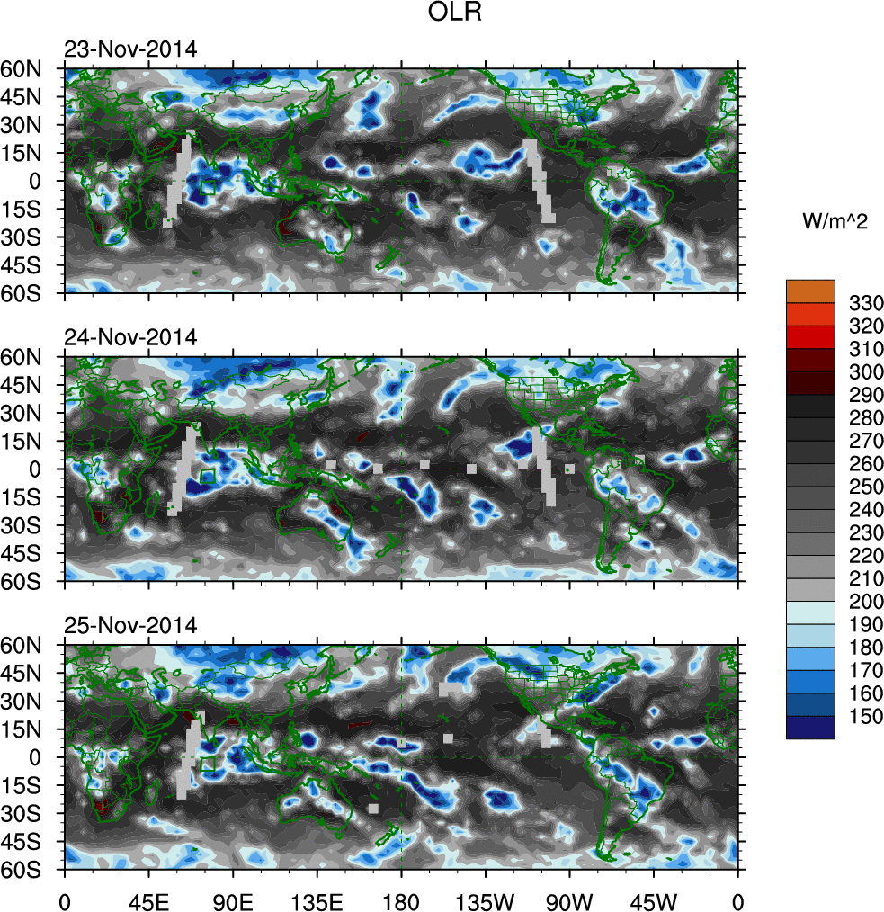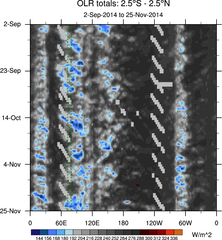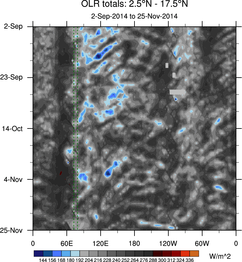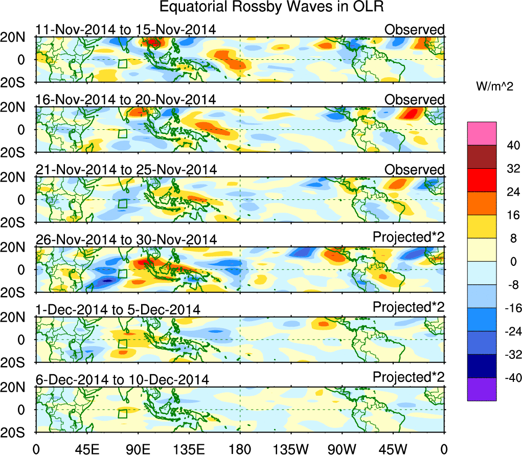 To identify tropical waves in near real-time, the OLR and UTWV data are filtered following Wheeler & Weickmann (2001 MWR). The daily anomalies are calculated using the first 3 harmonics of the seasonal cycle for 1979–2009. Missing values are then filled using linear interpolation in space and time. The most recent 365 days of anomalies are padded with 659 days of zeroes, and the result is filtered for each wave type.