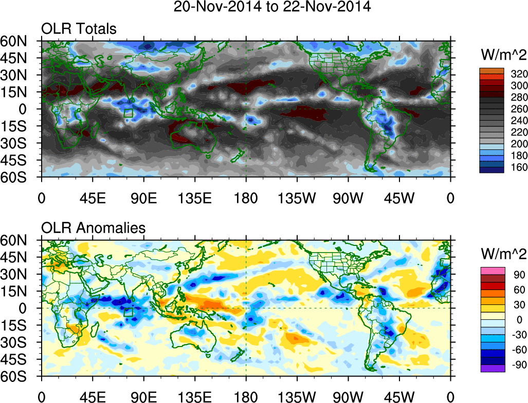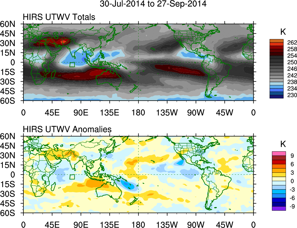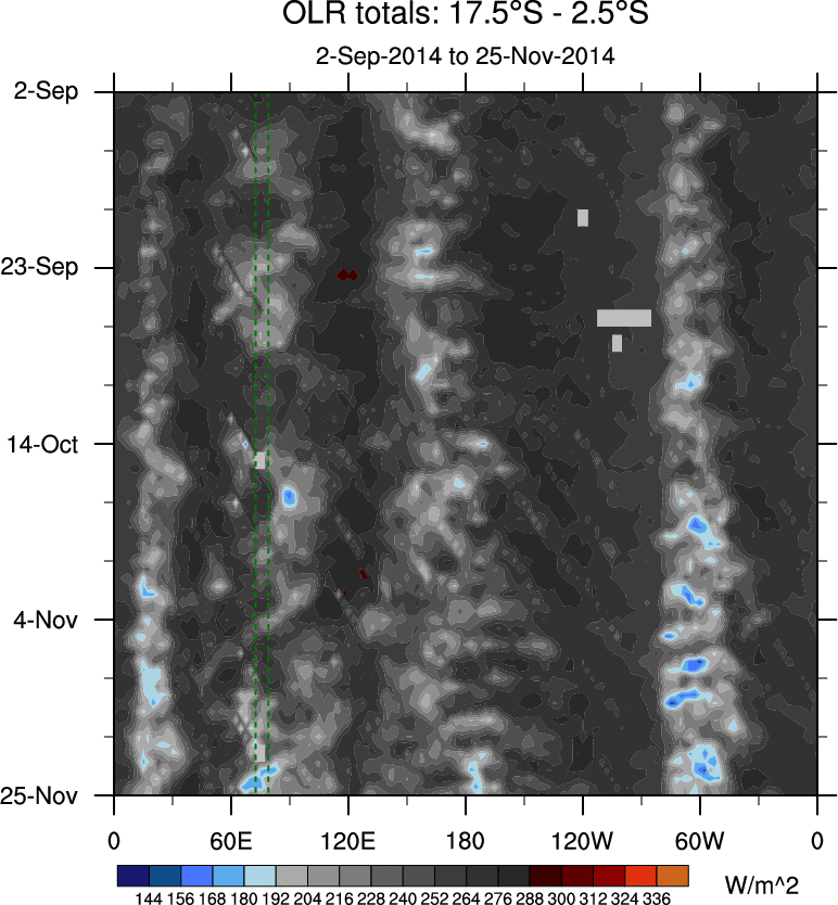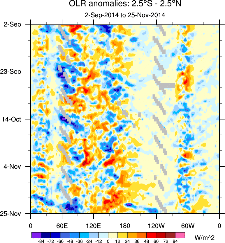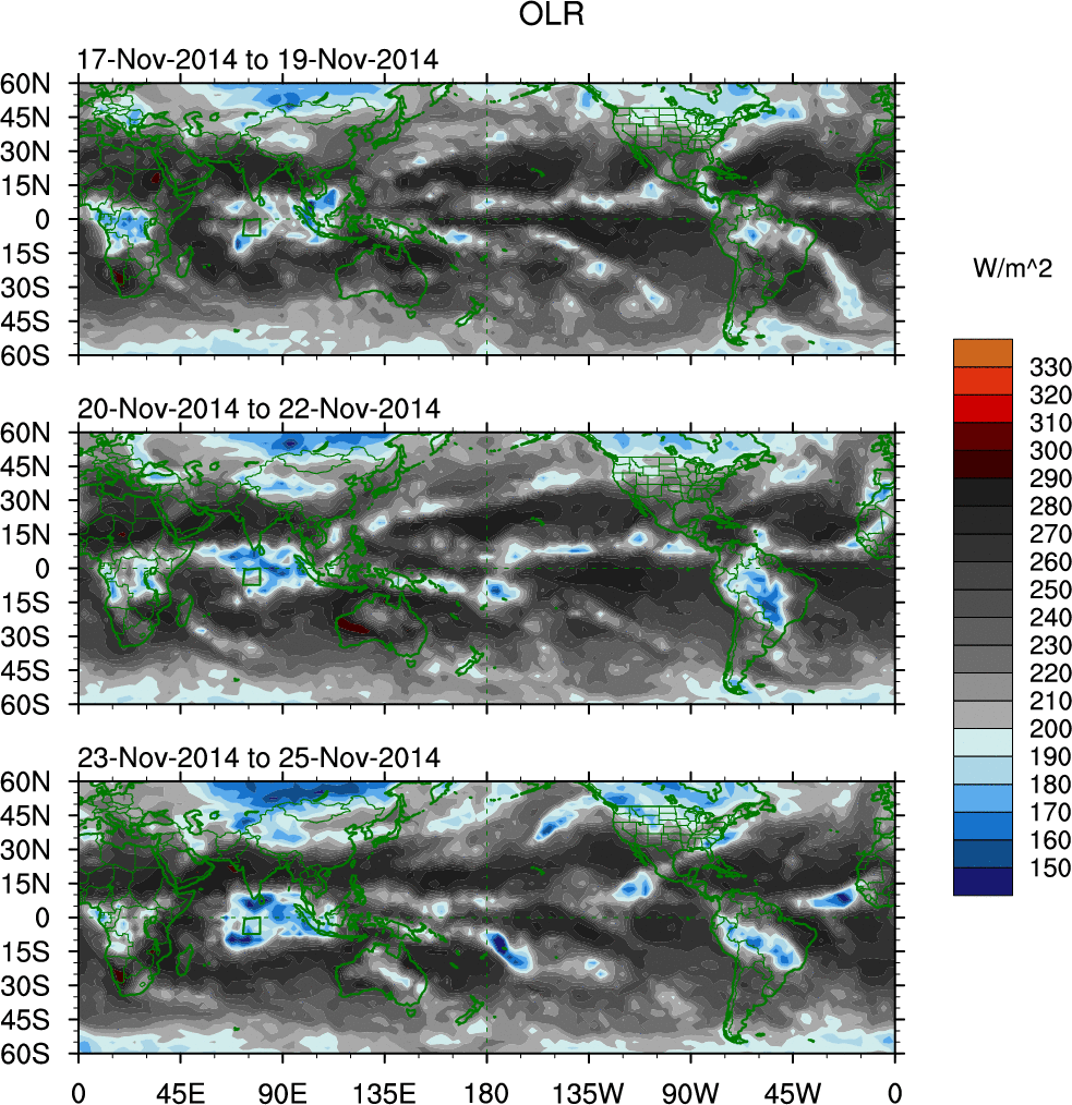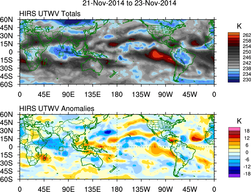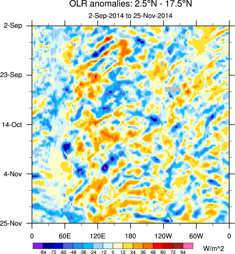 To identify tropical waves in near real-time, the OLR and UTWV data are filtered following Wheeler & Weickmann (2001 MWR). The daily anomalies are calculated using the first 3 harmonics of the seasonal cycle for 1979–2009. Missing values are then filled using linear interpolation in space and time. The most recent 365 days of anomalies are padded with 659 days of zeroes, and the result is filtered for each wave type.