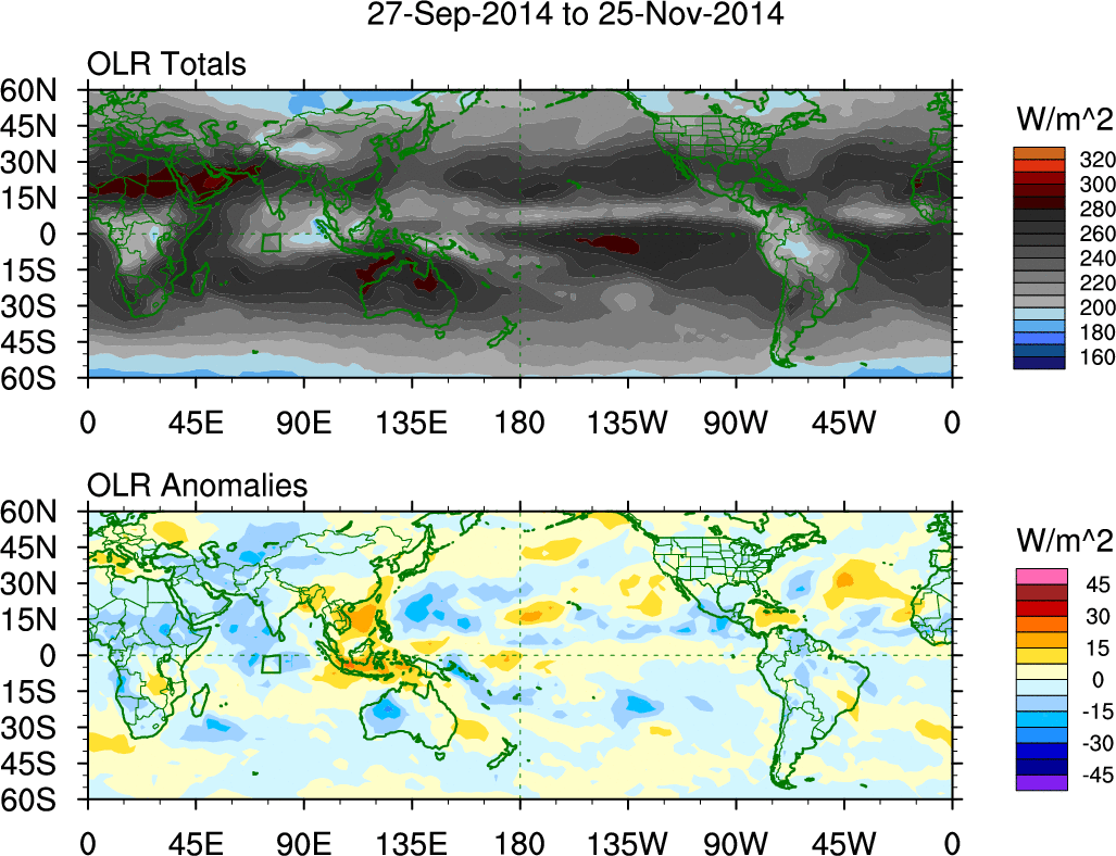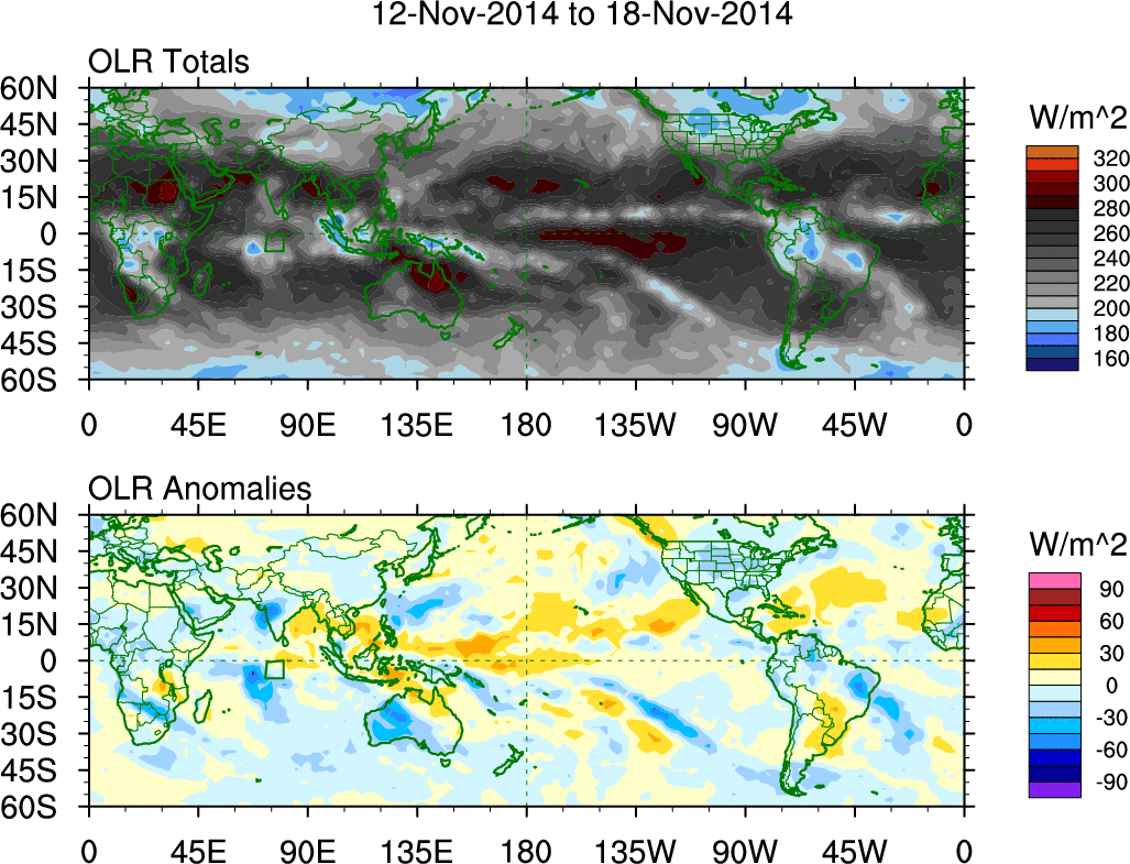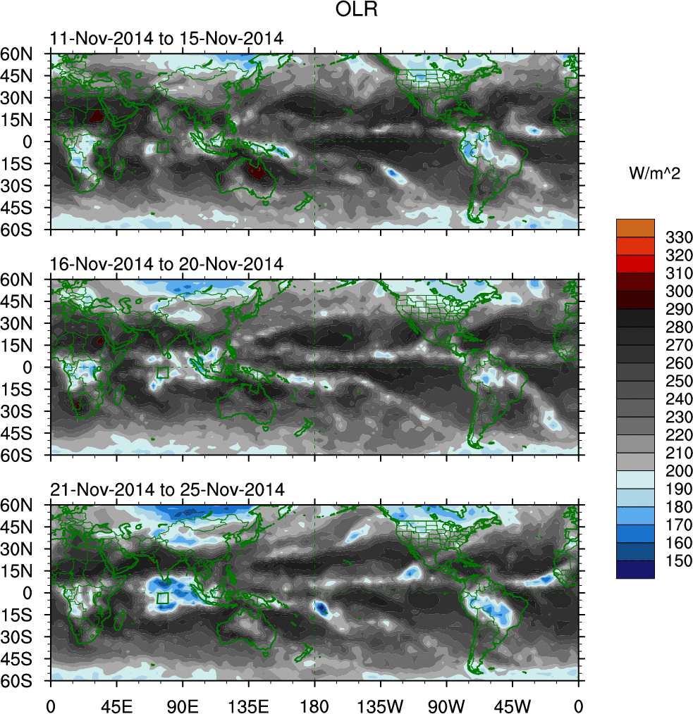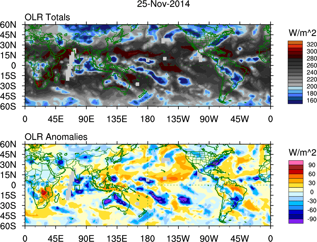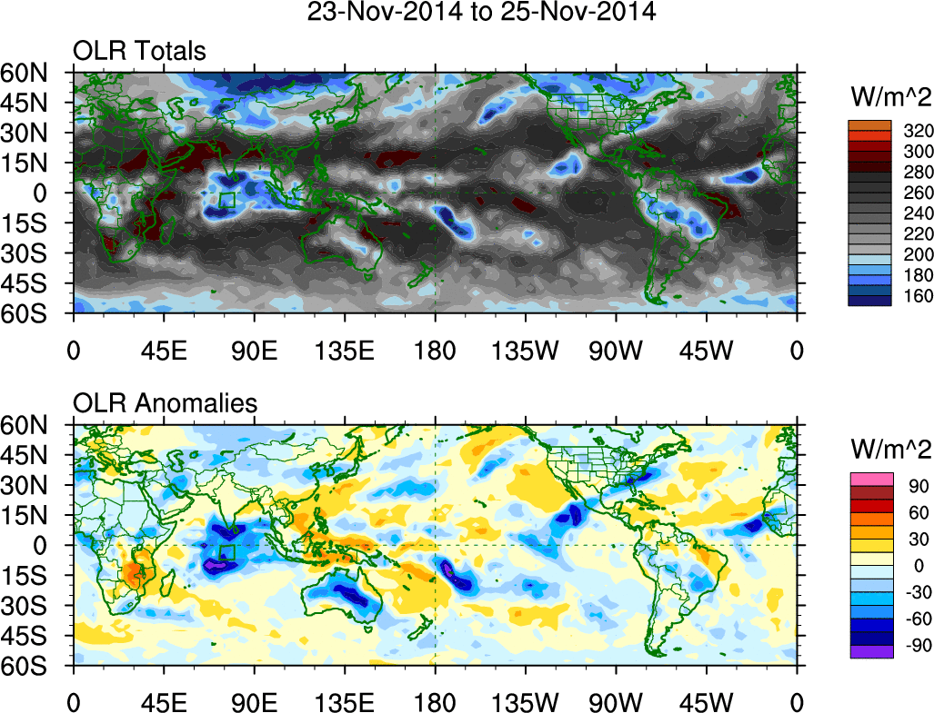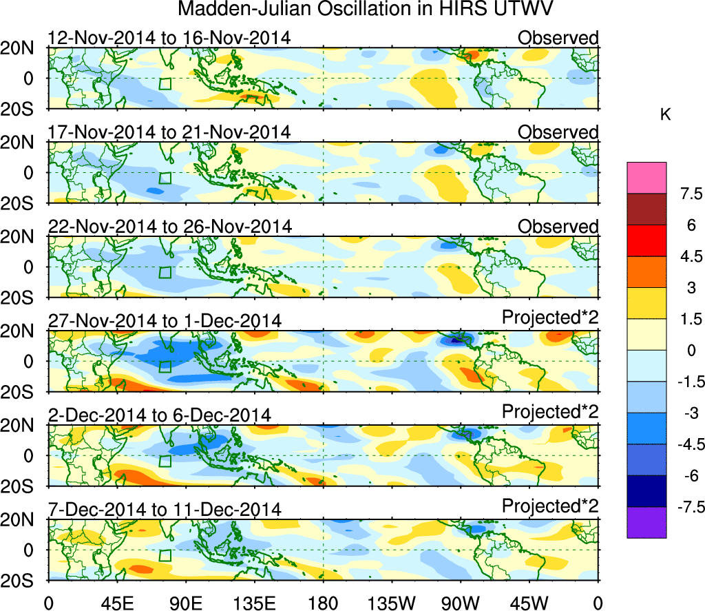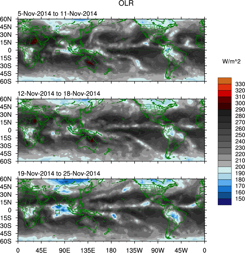 To identify tropical waves in near real-time, the OLR and UTWV data are filtered following Wheeler & Weickmann (2001 MWR). The daily anomalies are calculated using the first 3 harmonics of the seasonal cycle for 1979–2009. Missing values are then filled using linear interpolation in space and time. The most recent 365 days of anomalies are padded with 659 days of zeroes, and the result is filtered for each wave type.
