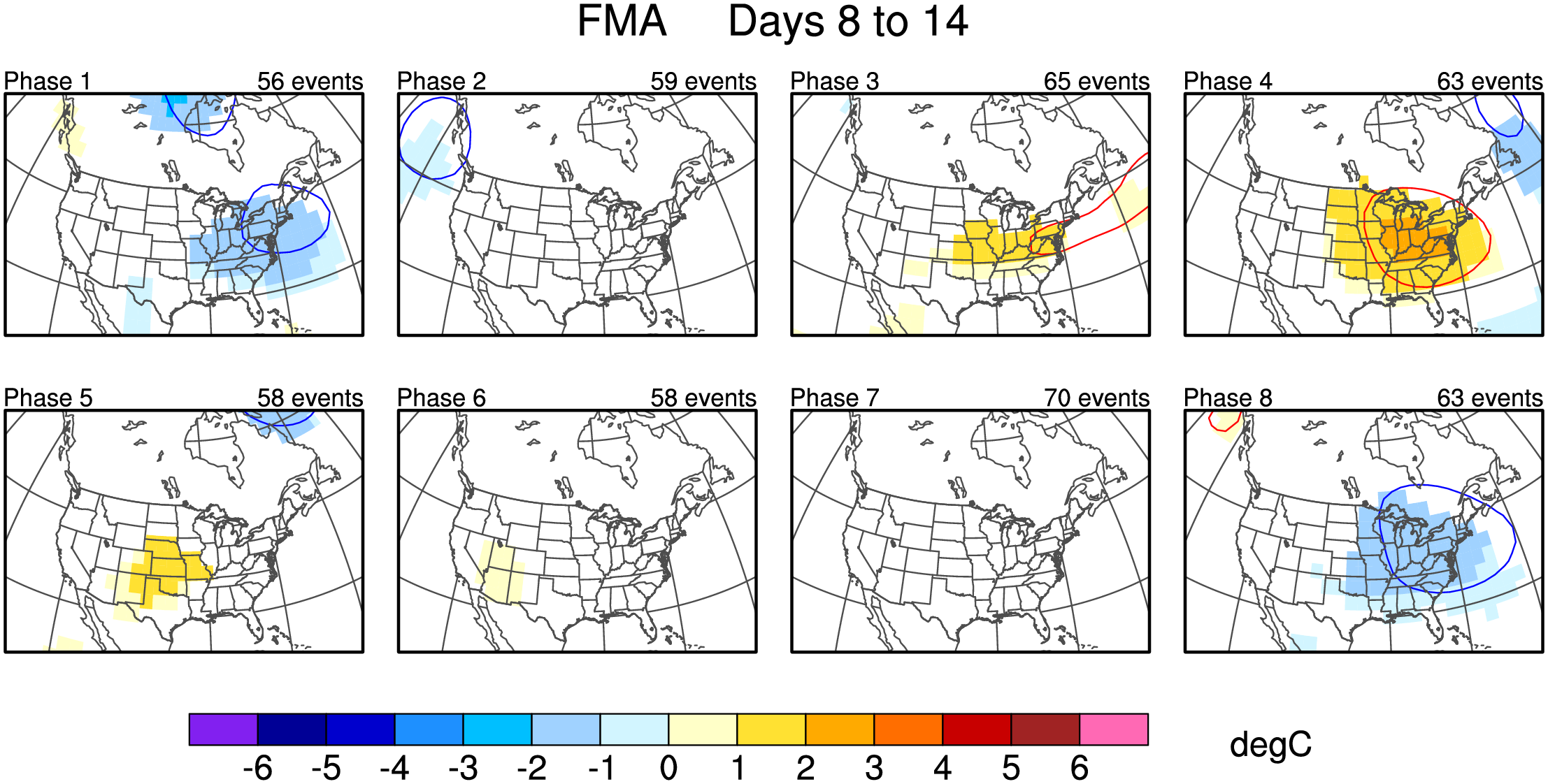 Maps of 500-hPa geopotential height anomalies (contoured every 30 m) and significant 850-hPa temperature anomalies, as shown in Schreck et al. (2013).