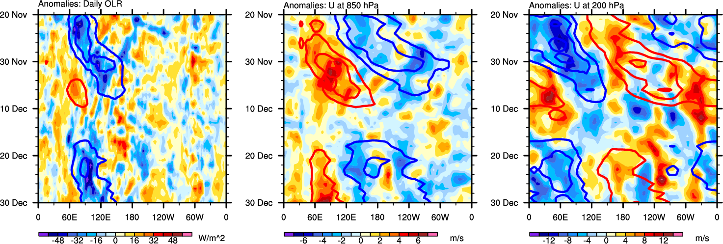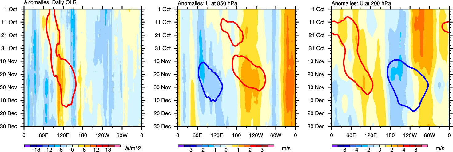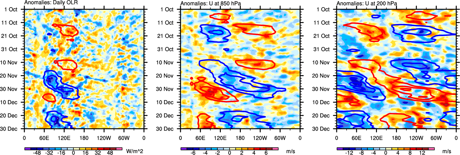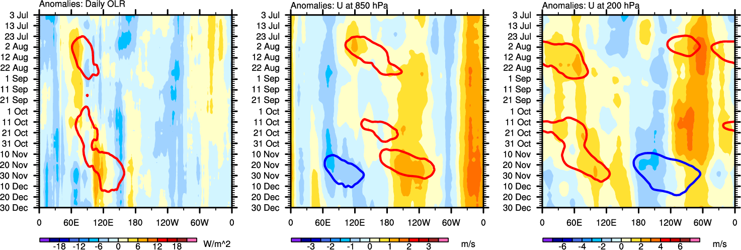 The Hovmöllers show longitude-time plots for OLR, U-850, and U-200. The shading indicates the observed anomalies, while the contours are the projection of those anomalies onto the RMM EOFs.