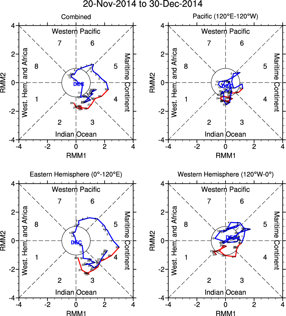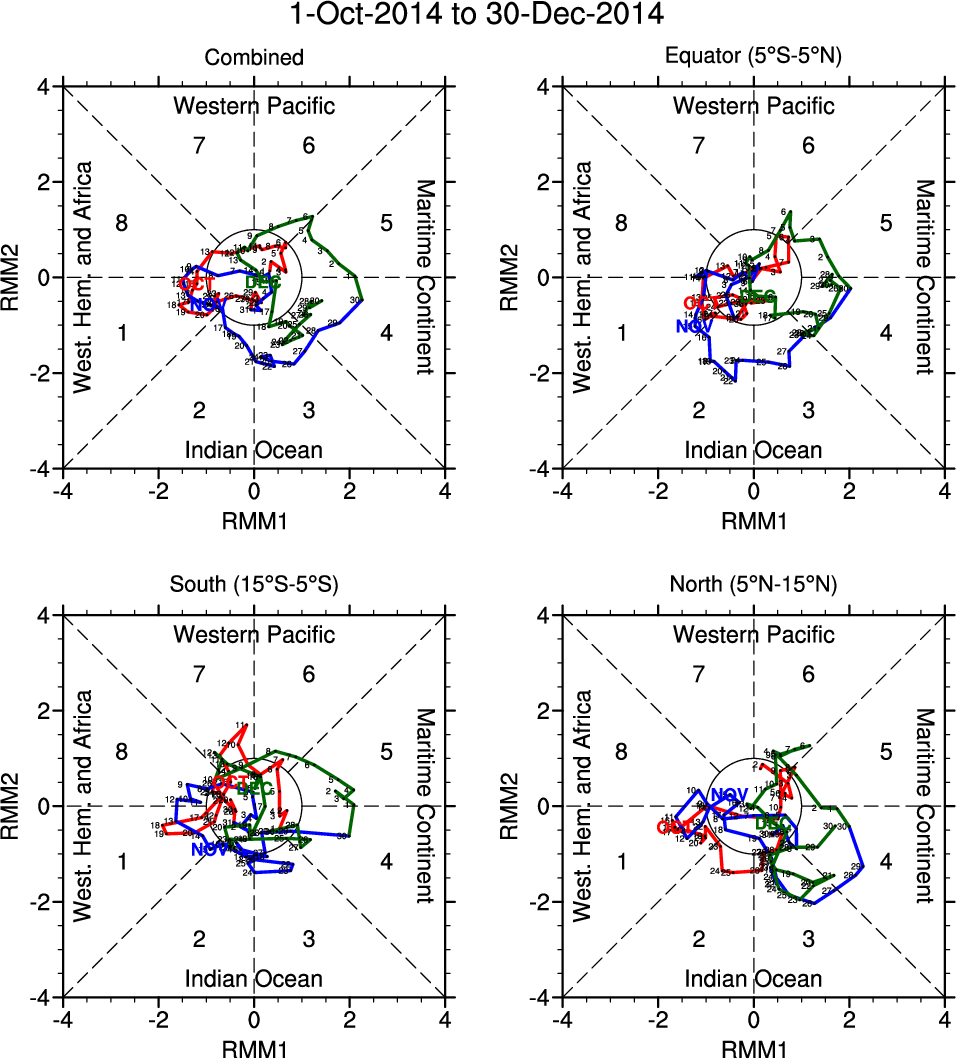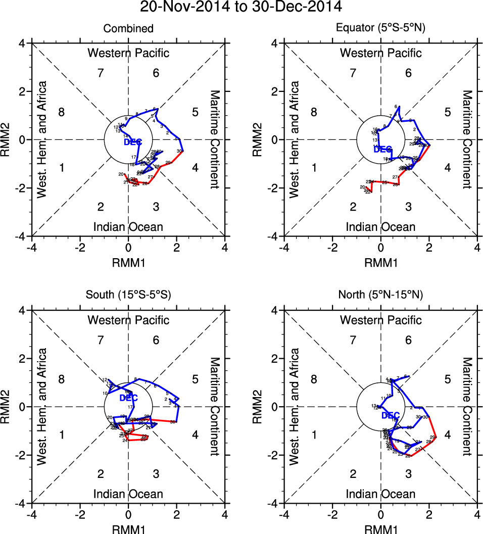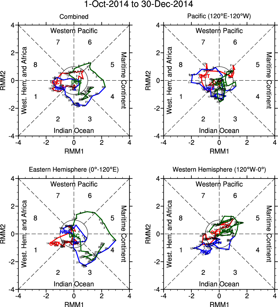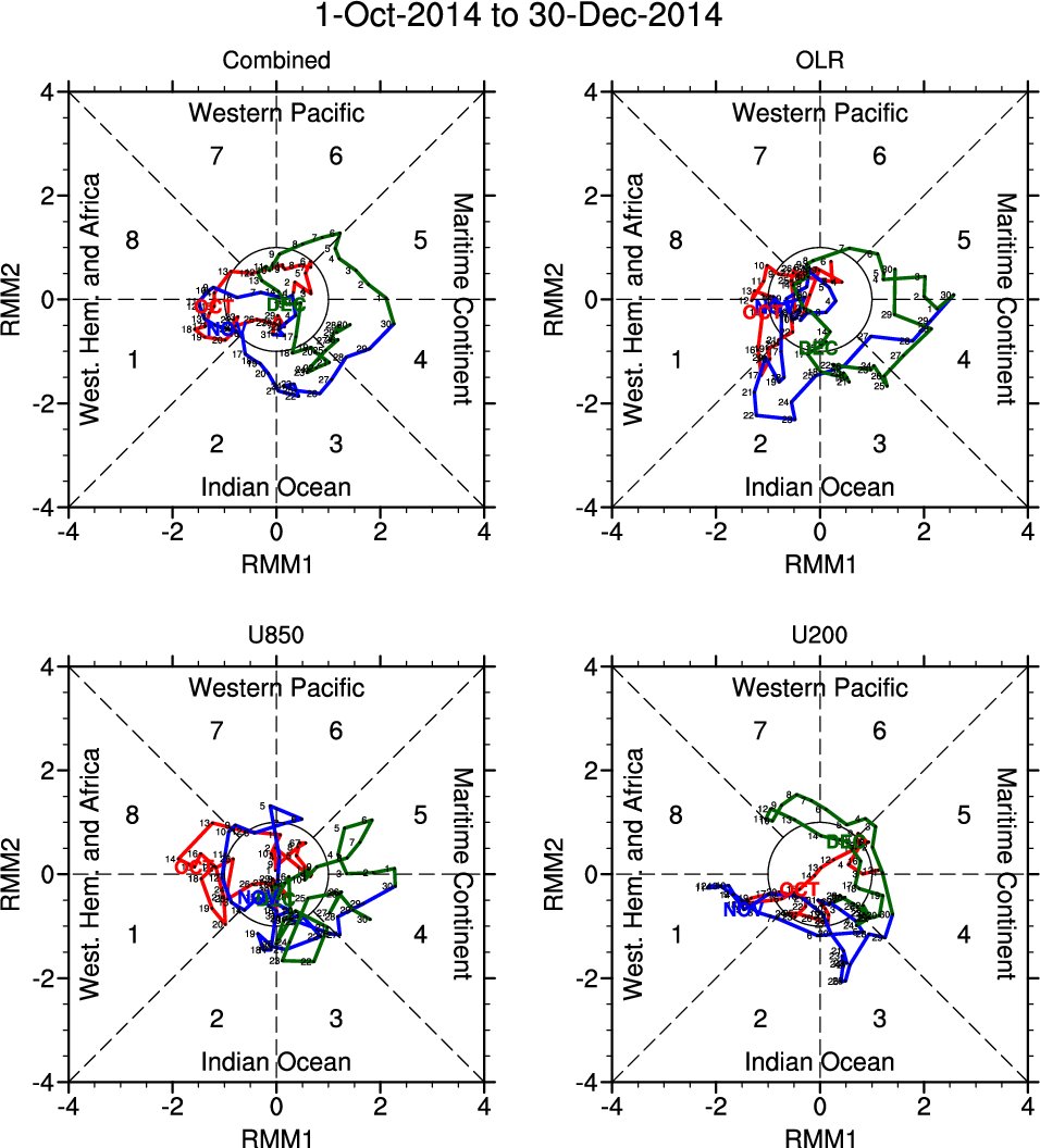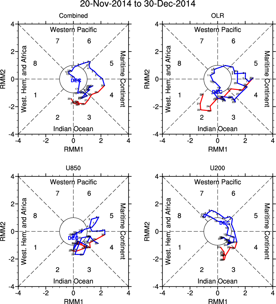 Wheeler and Hendon (2004) constructed the RMM index for monitoring the MJO. This index consists of the first two principal components (PCs) of OLR, 850-hPa zonal wind, and 200-hPa zonal wind averaged 15S-15N.
