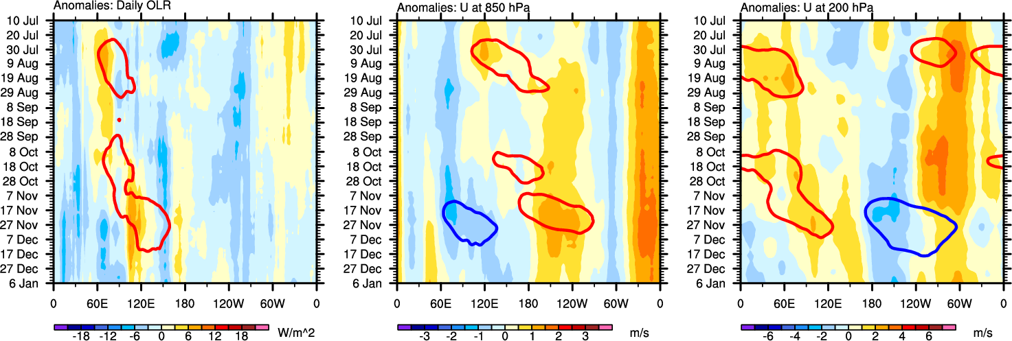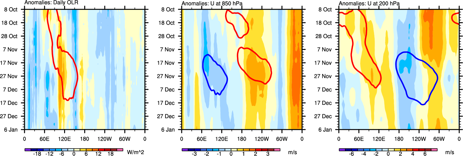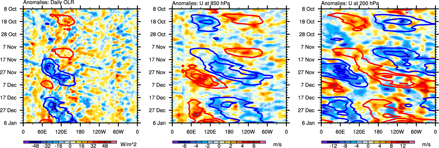 The Hovmöllers show longitude-time plots for OLR, U-850, and U-200. The shading indicates the observed anomalies, while the contours are the projection of those anomalies onto the RMM EOFs.