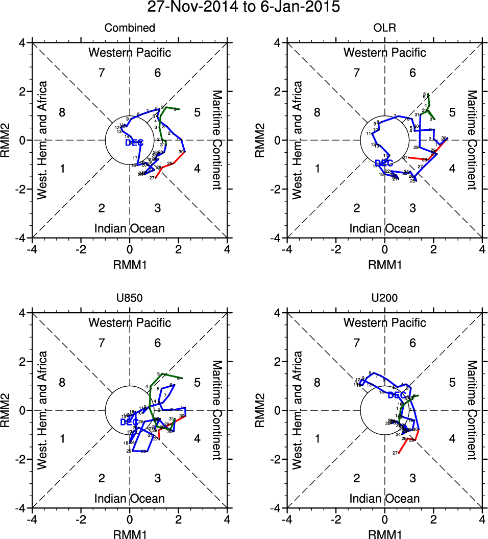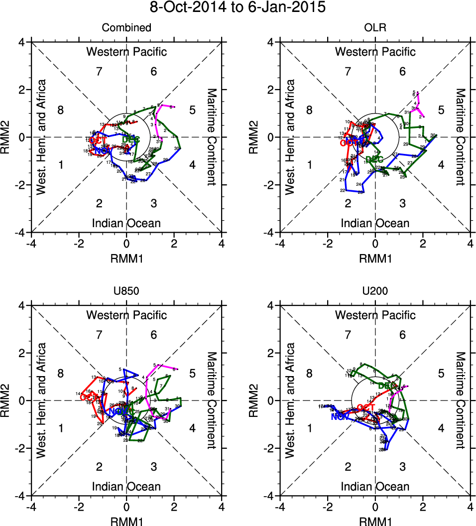 Wheeler and Hendon (2004) constructed the RMM index for monitoring the MJO. This index consists of the first two principal components (PCs) of OLR, 850-hPa zonal wind, and 200-hPa zonal wind averaged 15S-15N.
