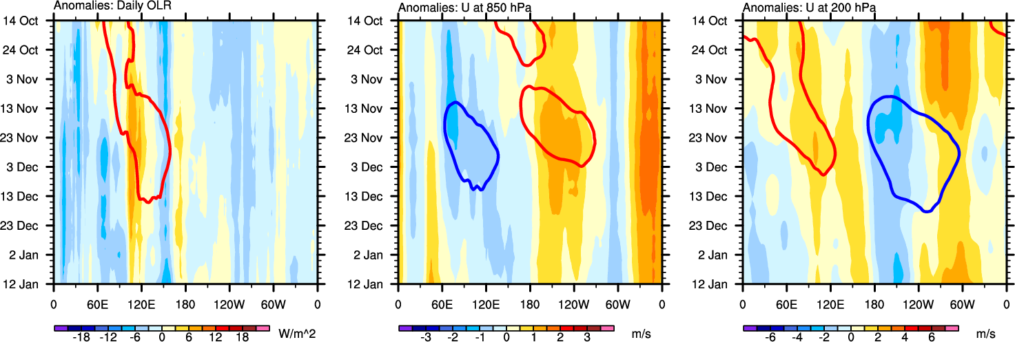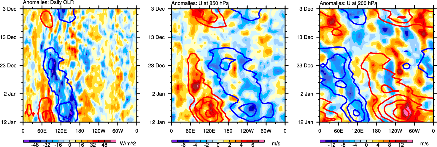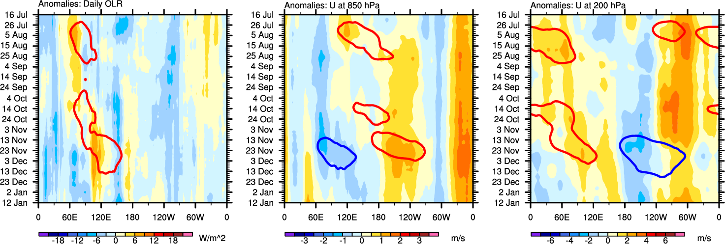 The Hovmöllers show longitude-time plots for OLR, U-850, and U-200. The shading indicates the observed anomalies, while the contours are the projection of those anomalies onto the RMM EOFs.