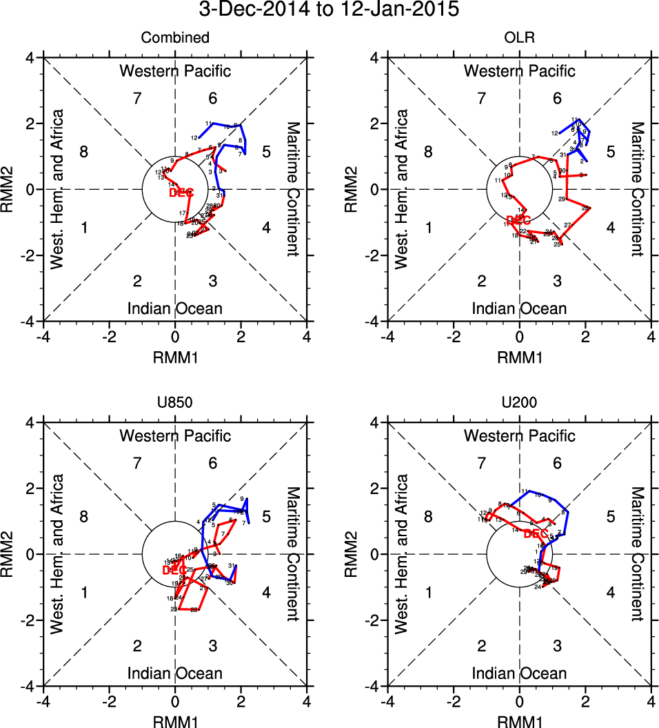 Wheeler and Hendon (2004) constructed the RMM index for monitoring the MJO. This index consists of the first two principal components (PCs) of OLR, 850-hPa zonal wind, and 200-hPa zonal wind averaged 15S-15N.