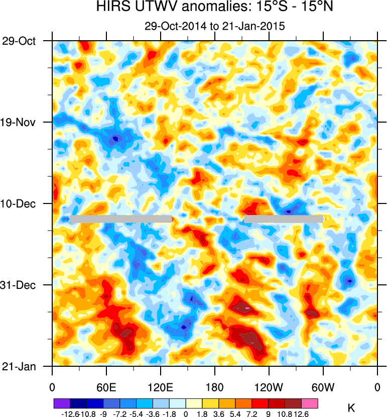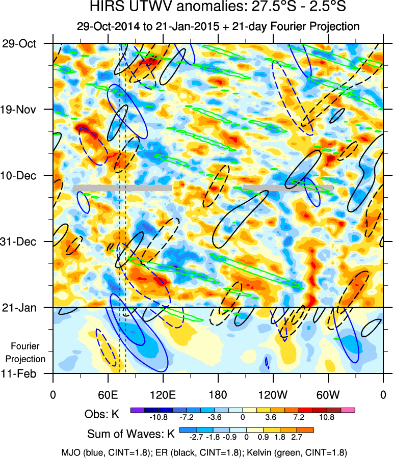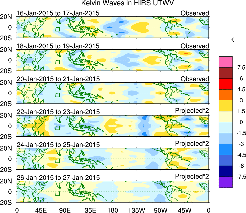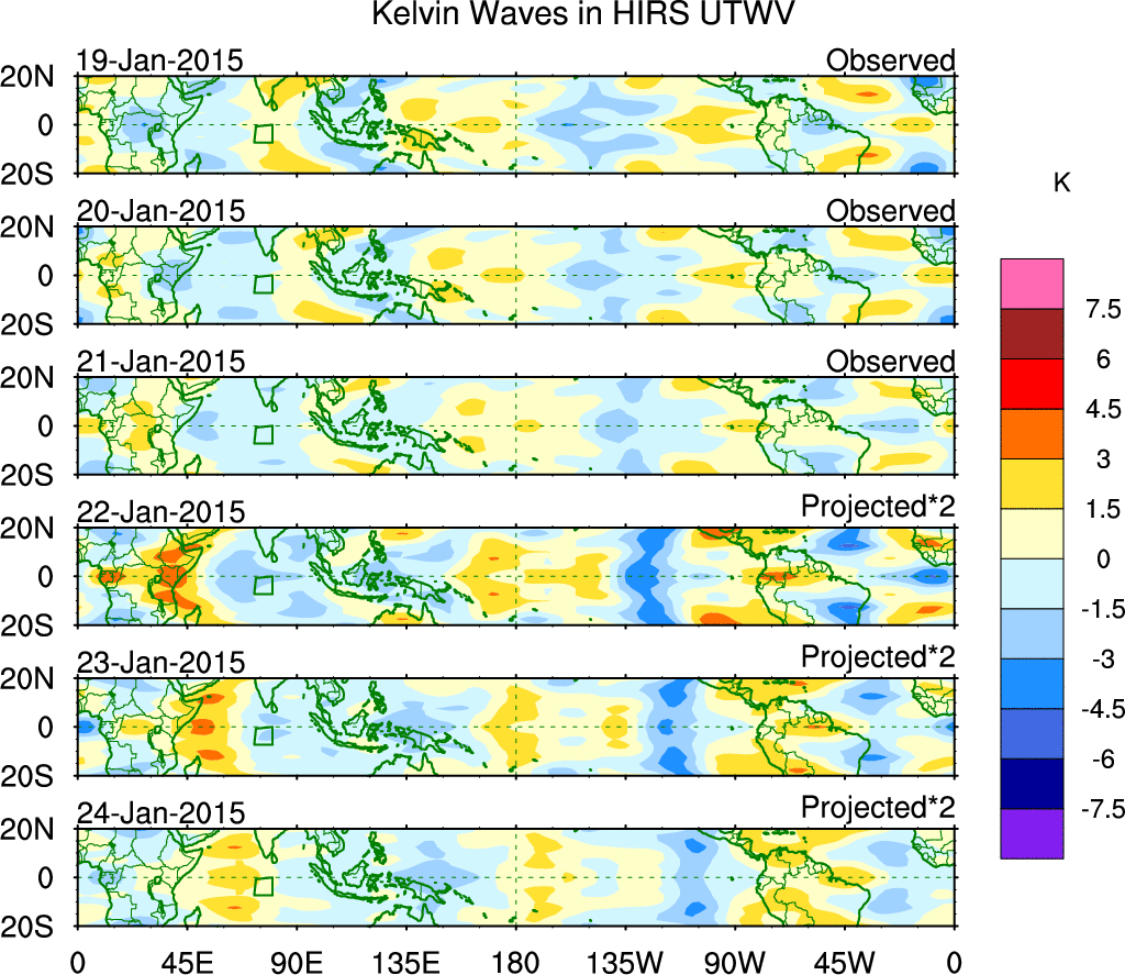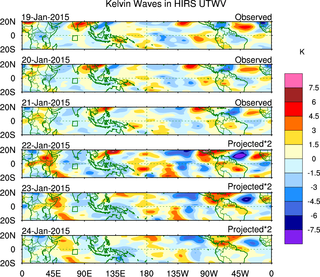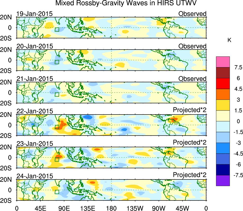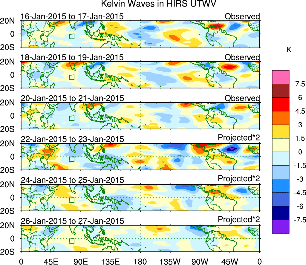 To identify tropical waves in near real-time, the OLR and UTWV data are filtered following Wheeler & Weickmann (2001 MWR). The daily anomalies are calculated using the first 3 harmonics of the seasonal cycle for 1979–2009. Missing values are then filled using linear interpolation in space and time. The most recent 365 days of anomalies are padded with 659 days of zeroes, and the result is filtered for each wave type.