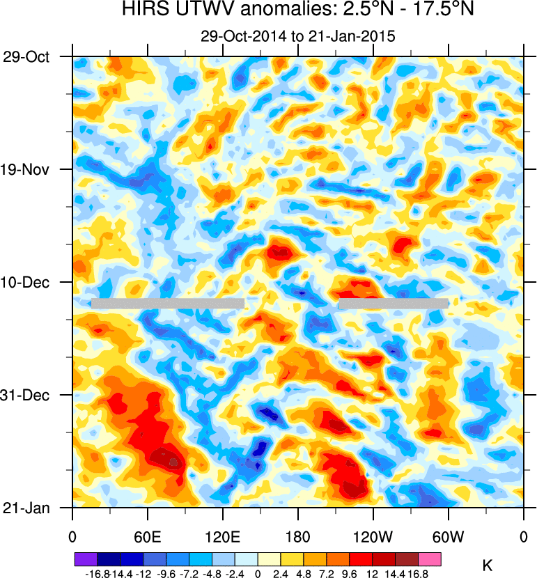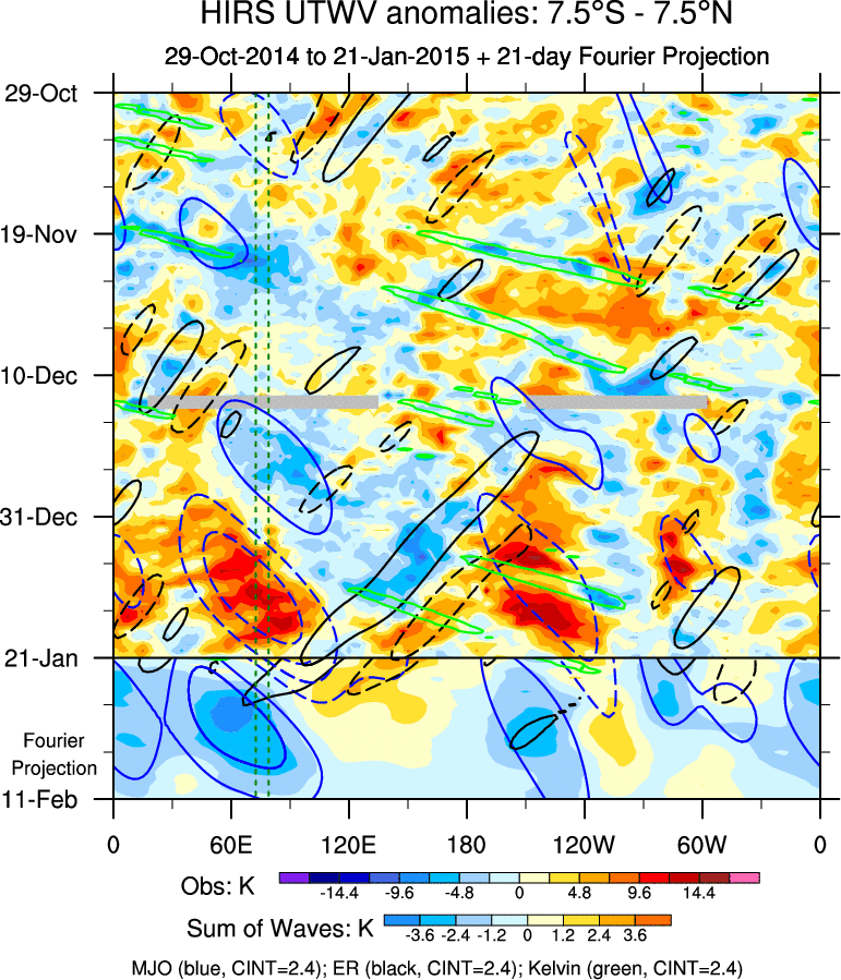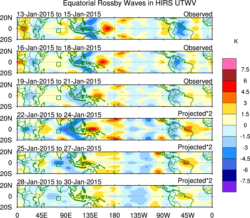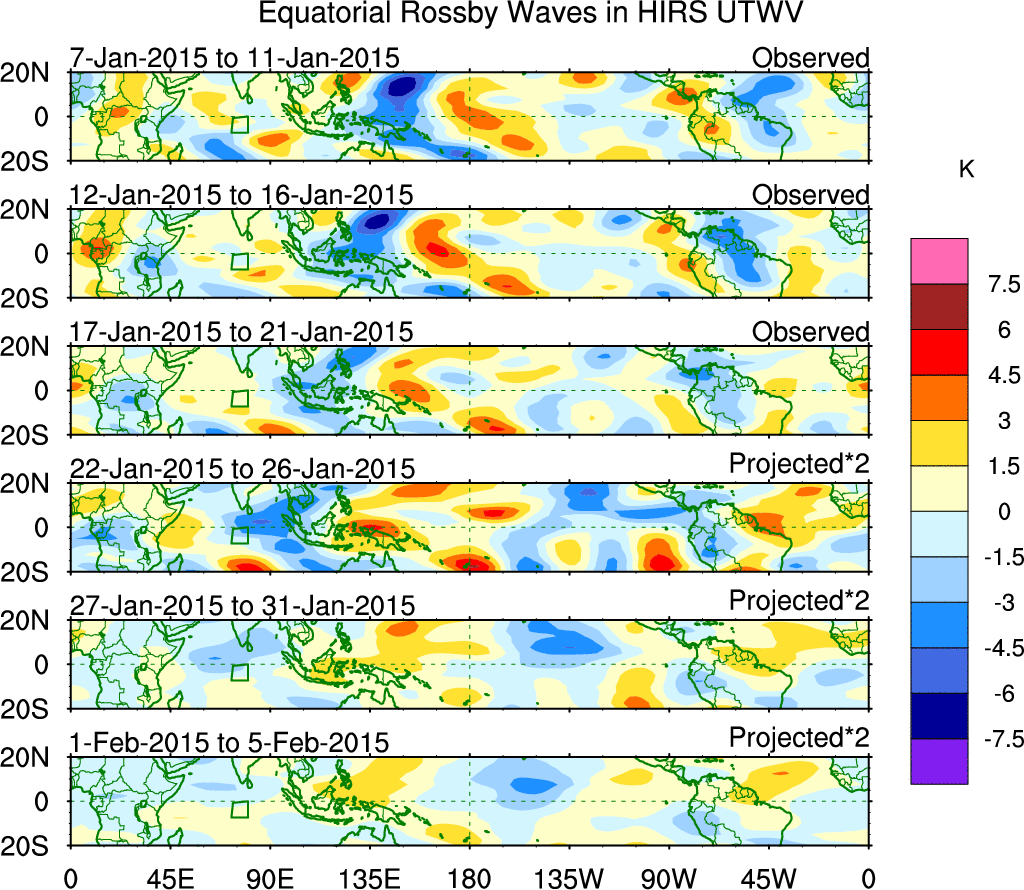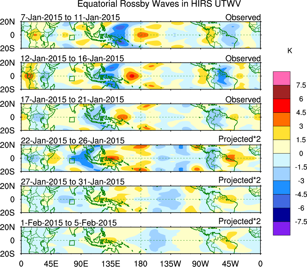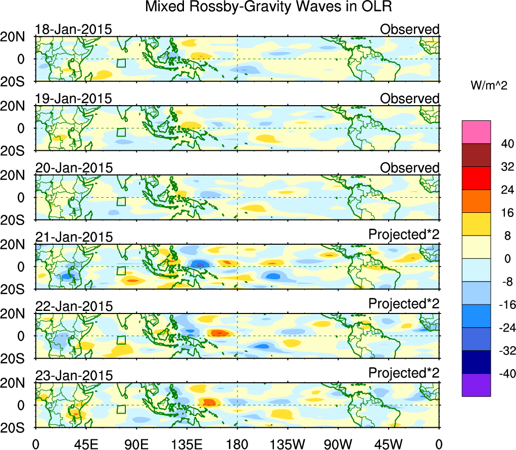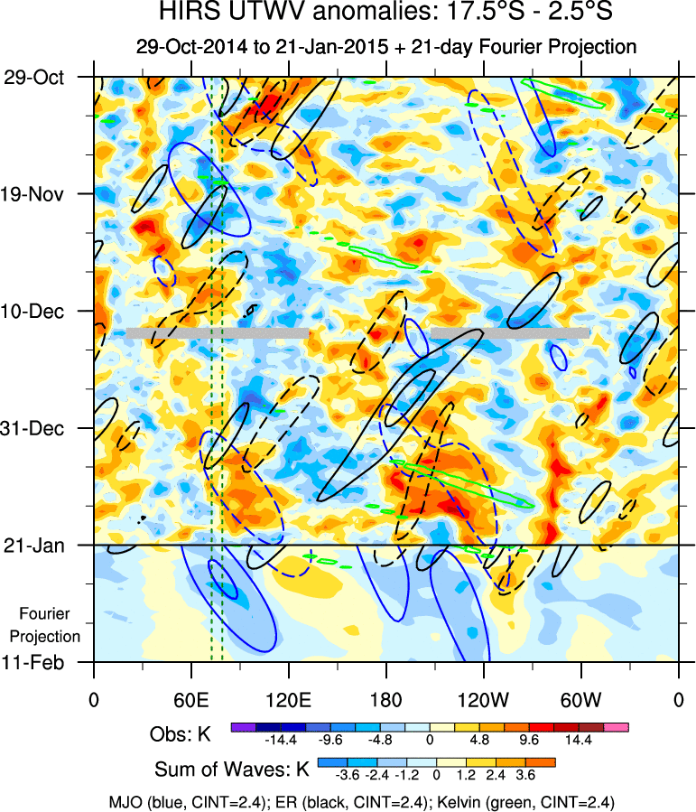 To identify tropical waves in near real-time, the OLR and UTWV data are filtered following Wheeler & Weickmann (2001 MWR). The daily anomalies are calculated using the first 3 harmonics of the seasonal cycle for 1979–2009. Missing values are then filled using linear interpolation in space and time. The most recent 365 days of anomalies are padded with 659 days of zeroes, and the result is filtered for each wave type.
