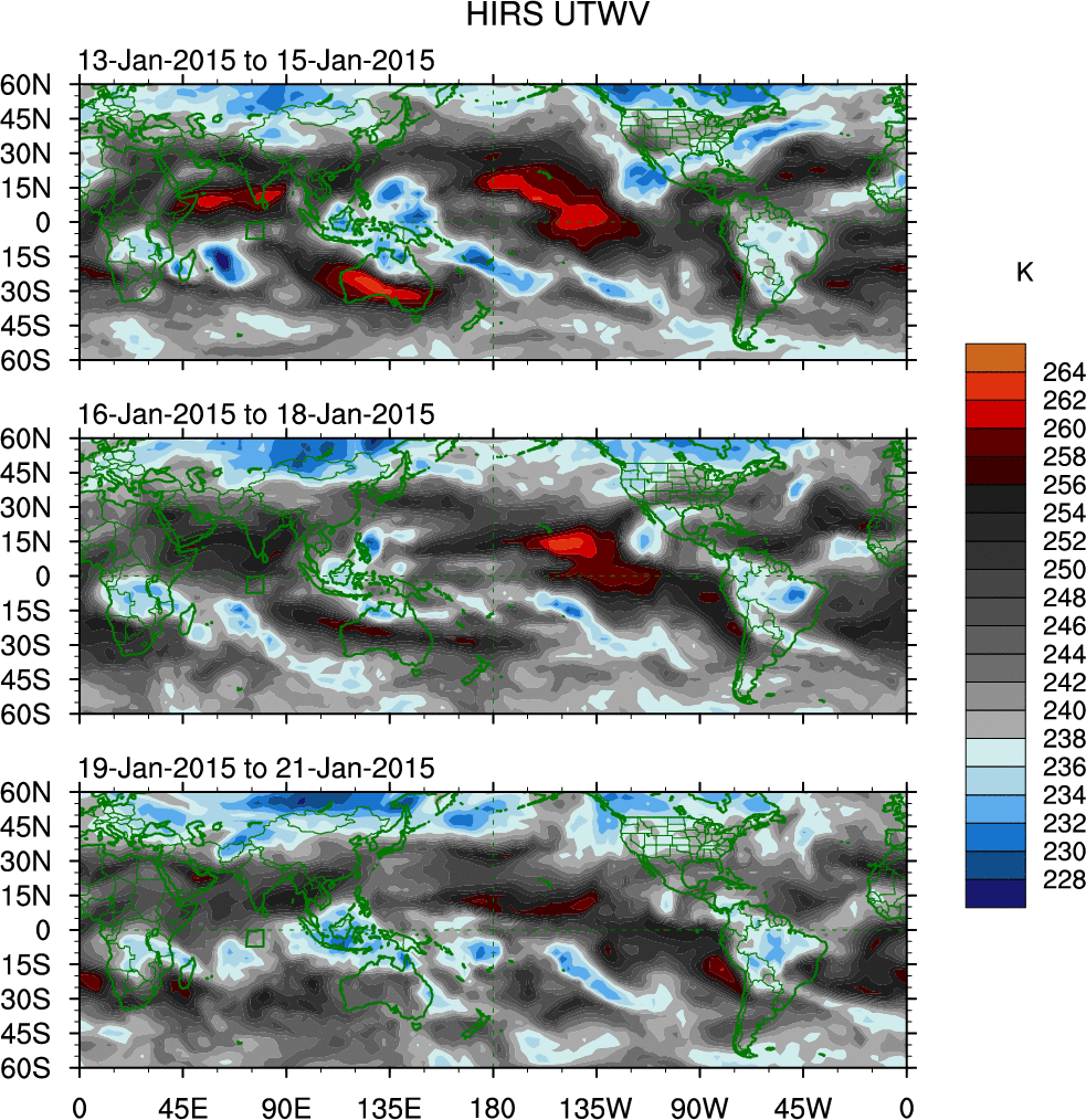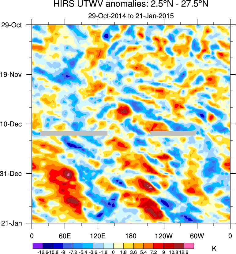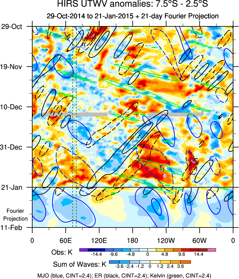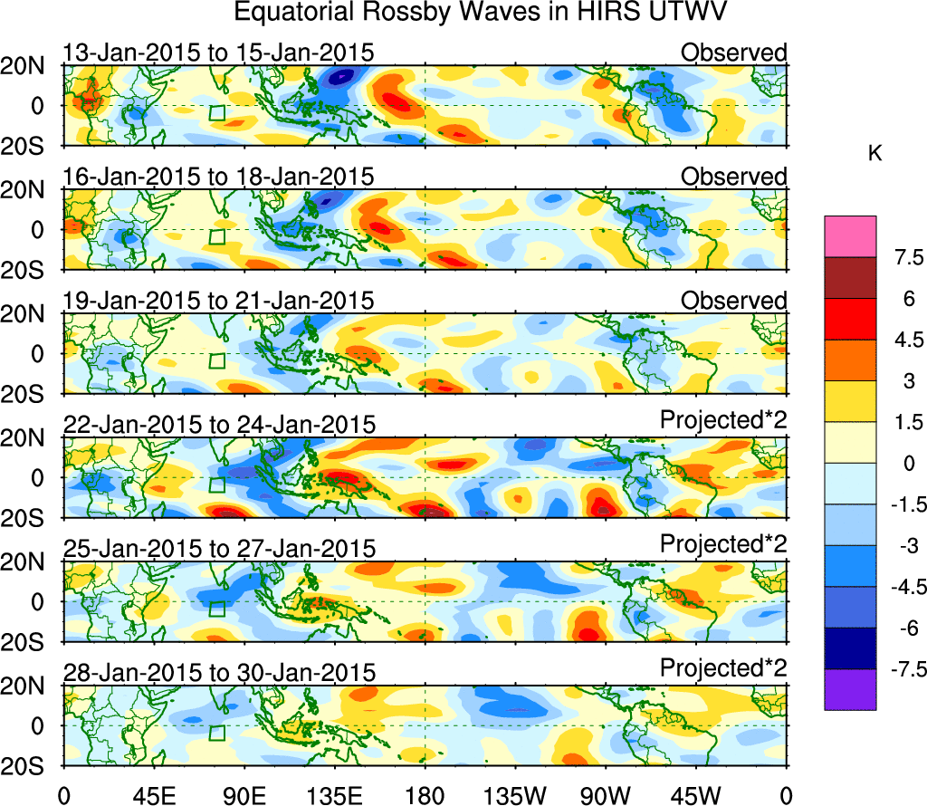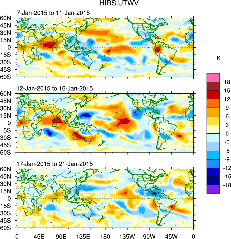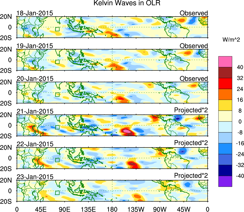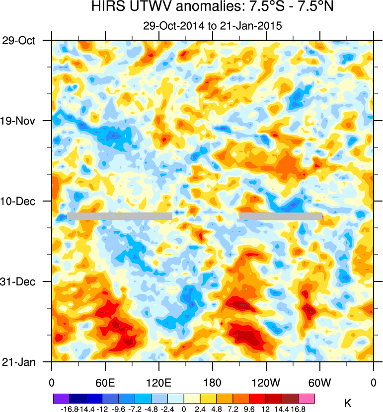 To identify tropical waves in near real-time, the OLR and UTWV data are filtered following Wheeler & Weickmann (2001 MWR). The daily anomalies are calculated using the first 3 harmonics of the seasonal cycle for 1979–2009. Missing values are then filled using linear interpolation in space and time. The most recent 365 days of anomalies are padded with 659 days of zeroes, and the result is filtered for each wave type.