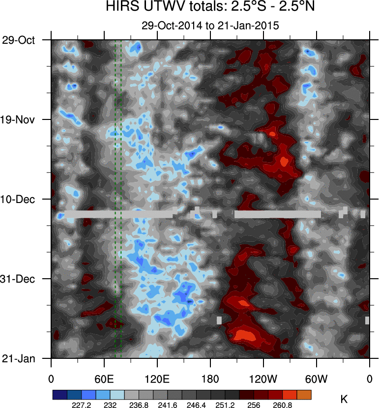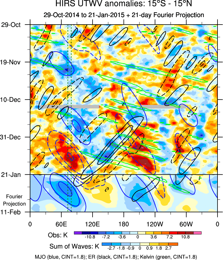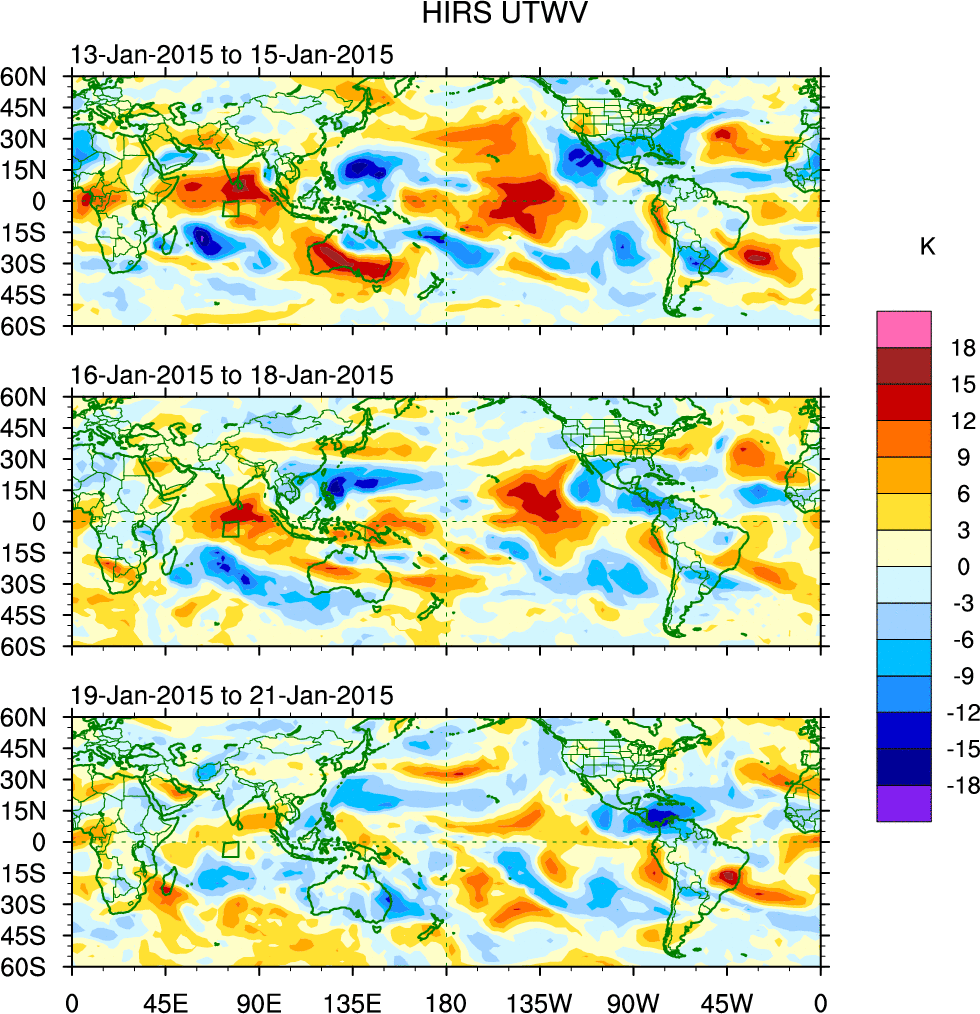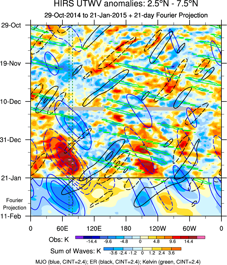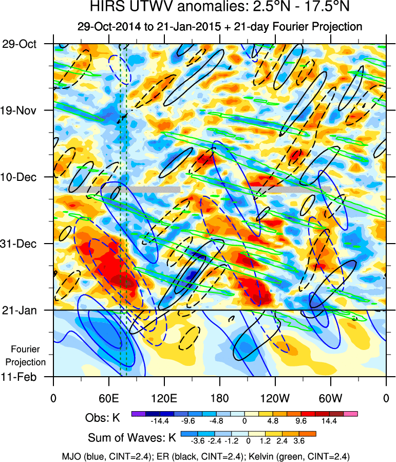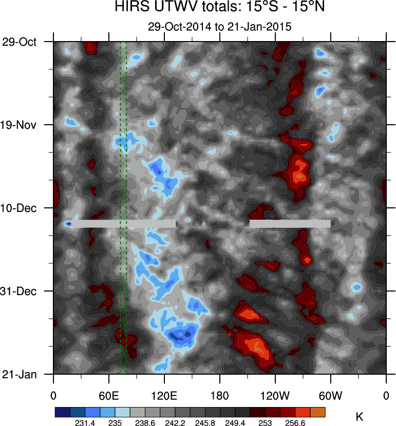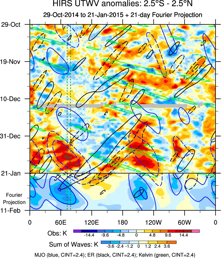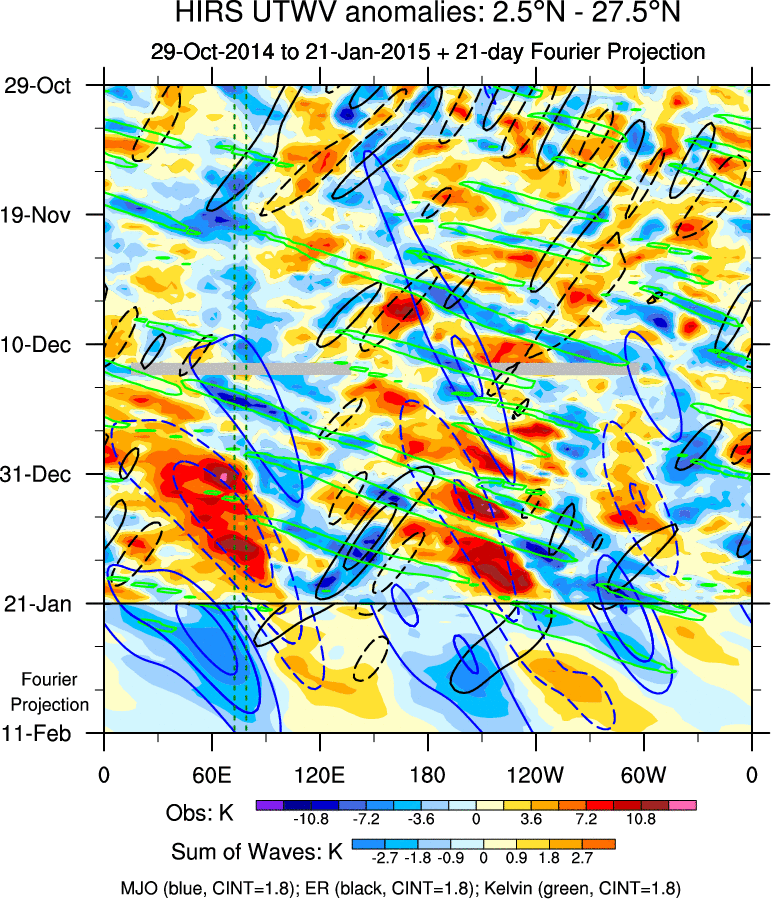To identify tropical waves in near real-time, the OLR and UTWV data are filtered following Wheeler & Weickmann (2001 MWR). The daily anomalies are calculated using the first 3 harmonics of the seasonal cycle for 1979–2009. Missing values are then filled using linear interpolation in space and time. The most recent 365 days of anomalies are padded with 659 days of zeroes, and the result is filtered for each wave type.
