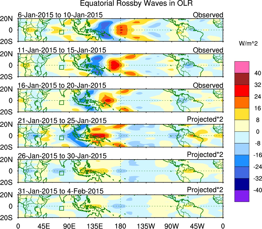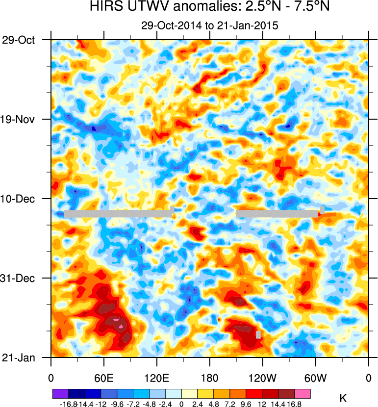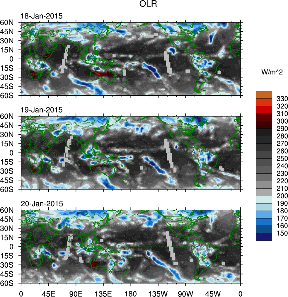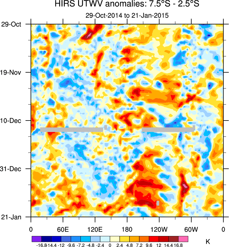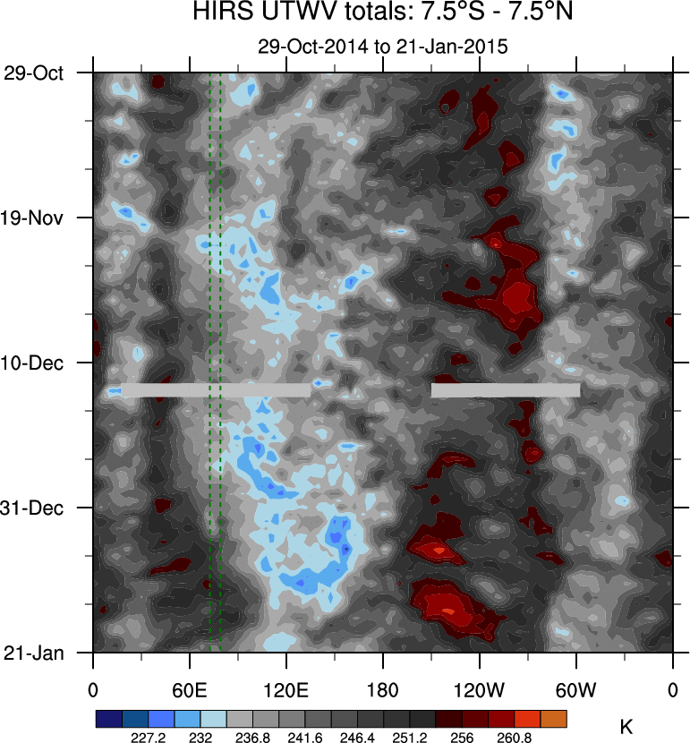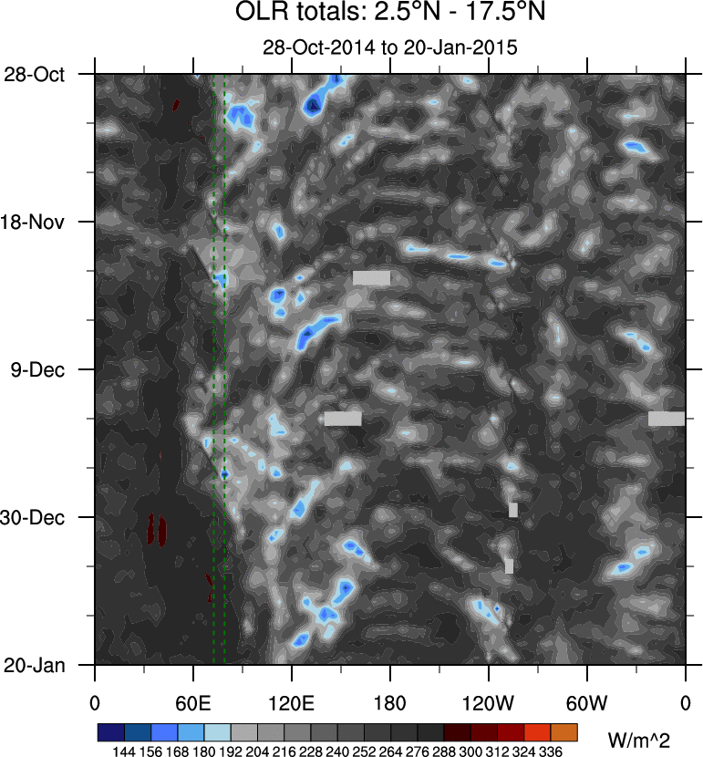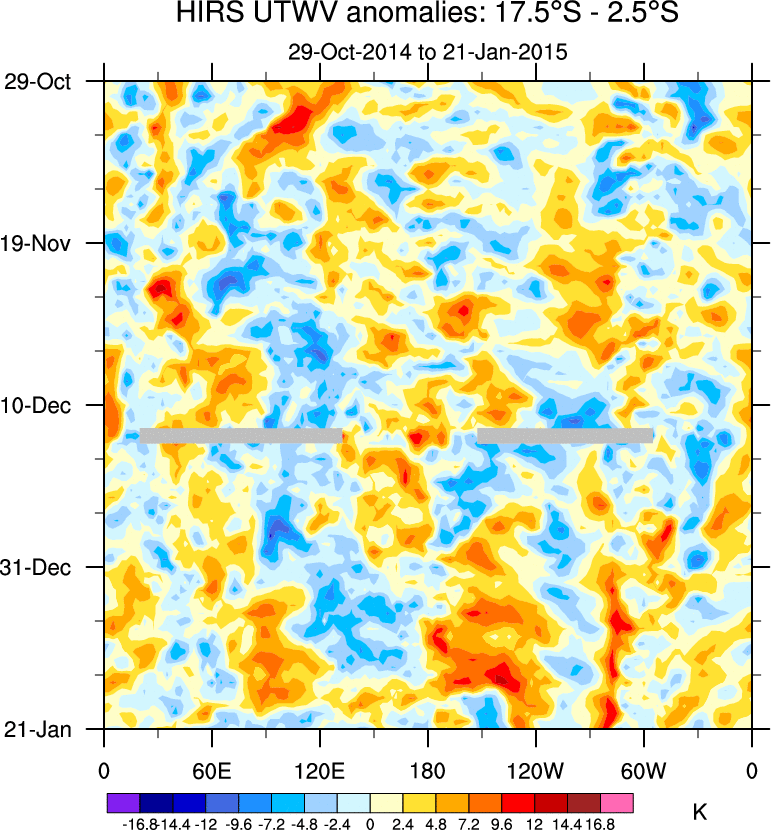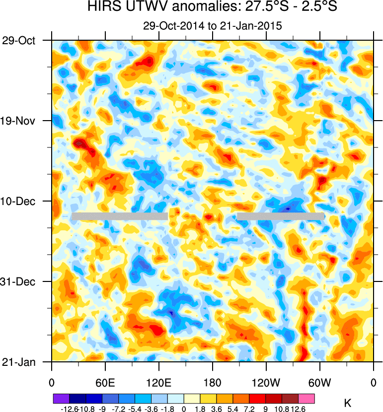 To identify tropical waves in near real-time, the OLR and UTWV data are filtered following Wheeler & Weickmann (2001 MWR). The daily anomalies are calculated using the first 3 harmonics of the seasonal cycle for 1979–2009. Missing values are then filled using linear interpolation in space and time. The most recent 365 days of anomalies are padded with 659 days of zeroes, and the result is filtered for each wave type.