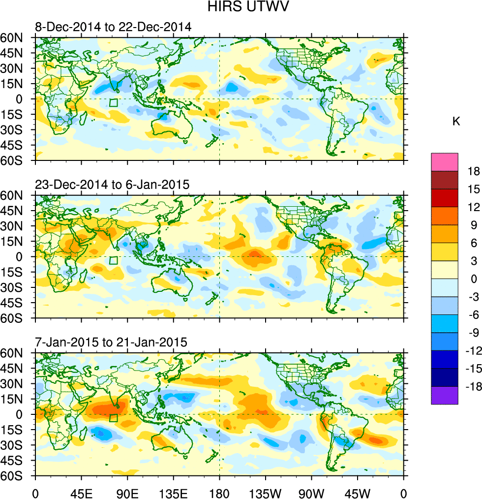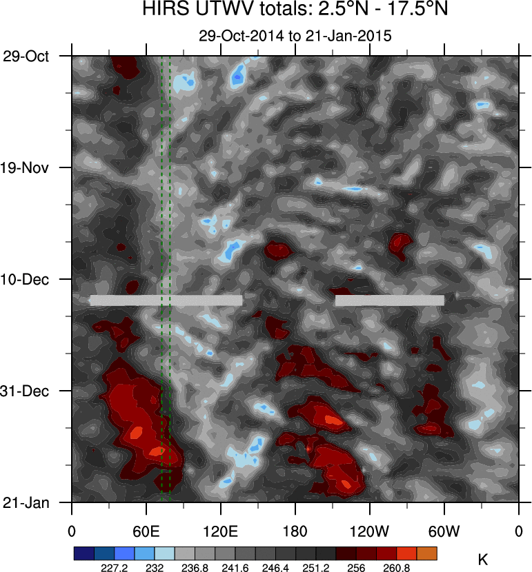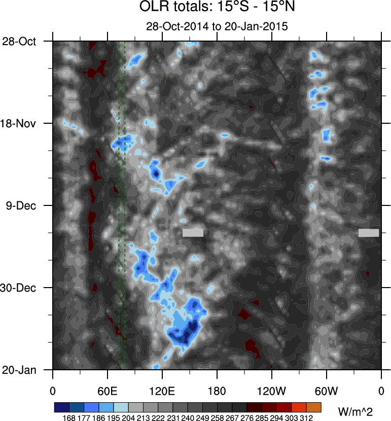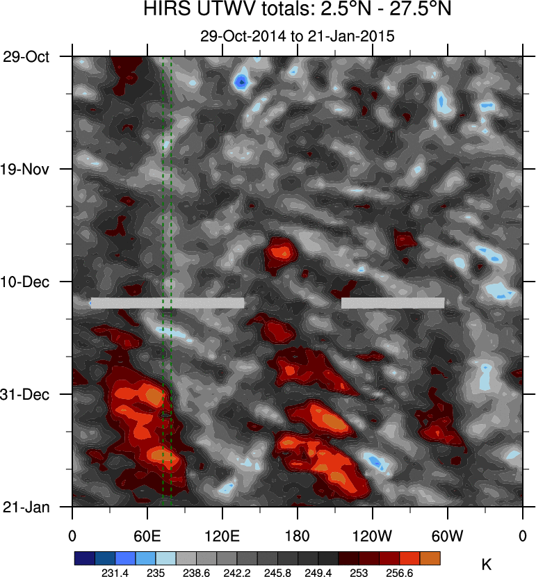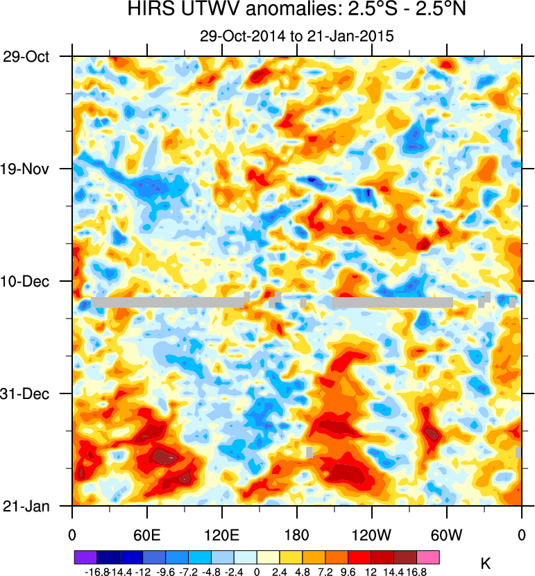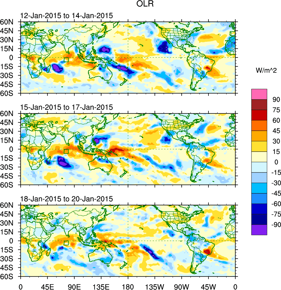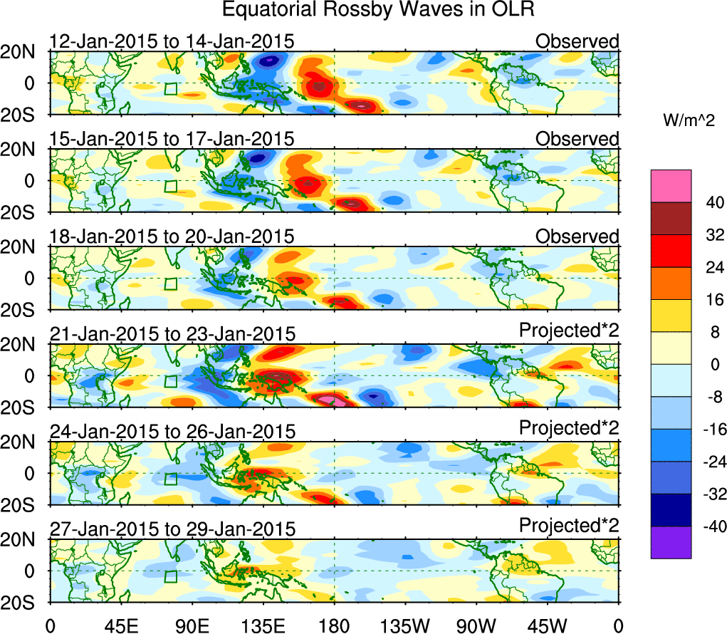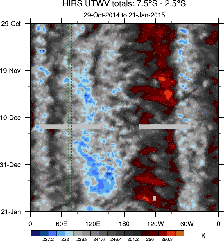 To identify tropical waves in near real-time, the OLR and UTWV data are filtered following Wheeler & Weickmann (2001 MWR). The daily anomalies are calculated using the first 3 harmonics of the seasonal cycle for 1979–2009. Missing values are then filled using linear interpolation in space and time. The most recent 365 days of anomalies are padded with 659 days of zeroes, and the result is filtered for each wave type.