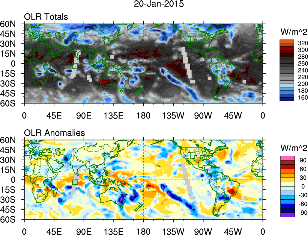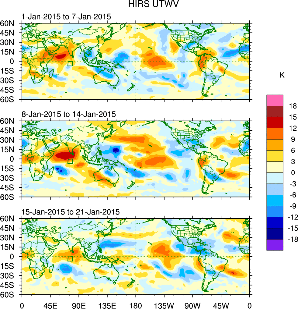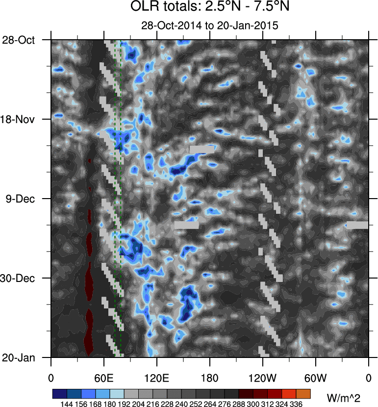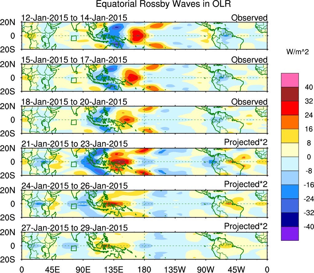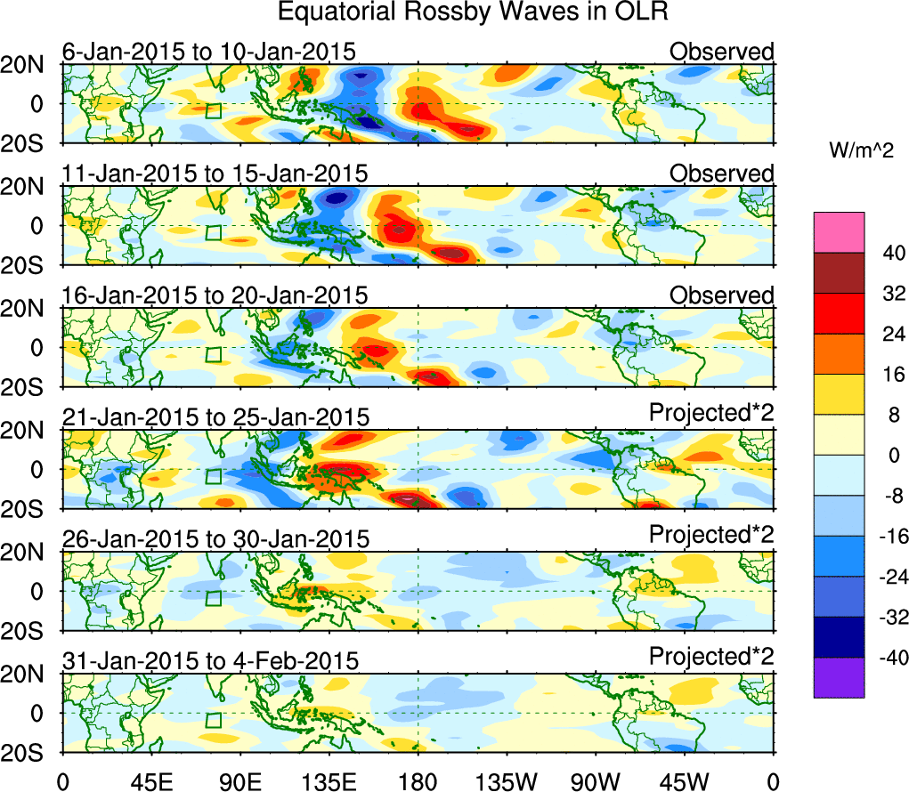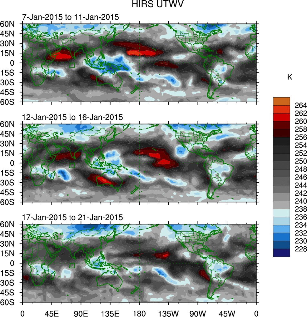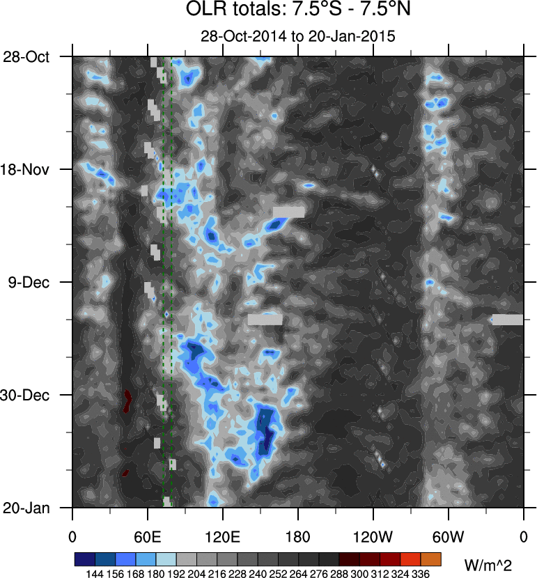 To identify tropical waves in near real-time, the OLR and UTWV data are filtered following Wheeler & Weickmann (2001 MWR). The daily anomalies are calculated using the first 3 harmonics of the seasonal cycle for 1979–2009. Missing values are then filled using linear interpolation in space and time. The most recent 365 days of anomalies are padded with 659 days of zeroes, and the result is filtered for each wave type.